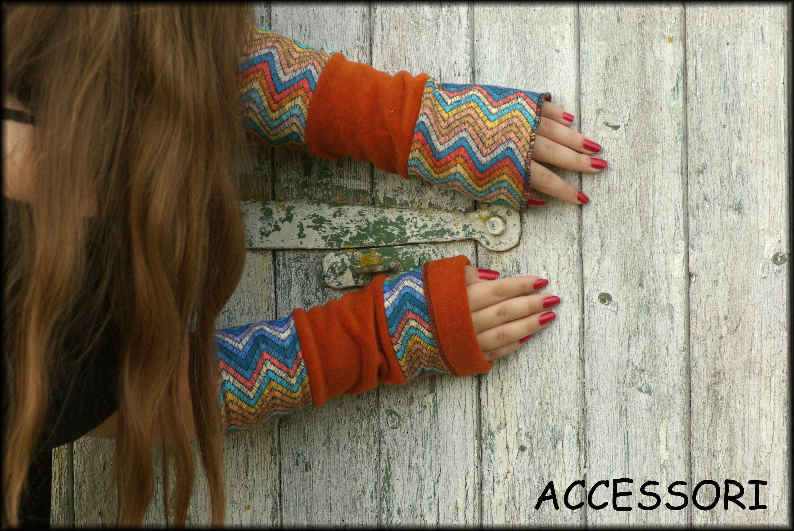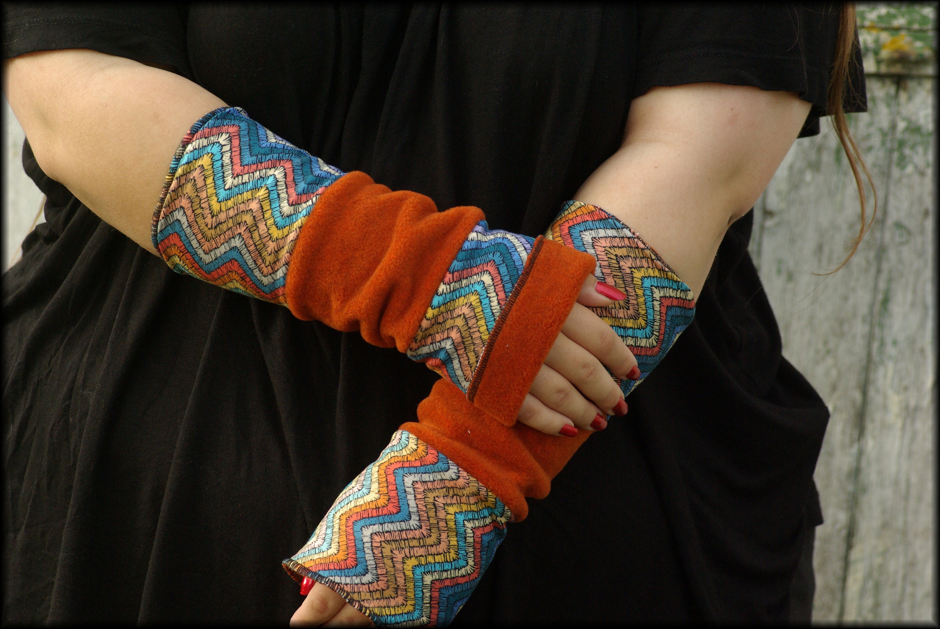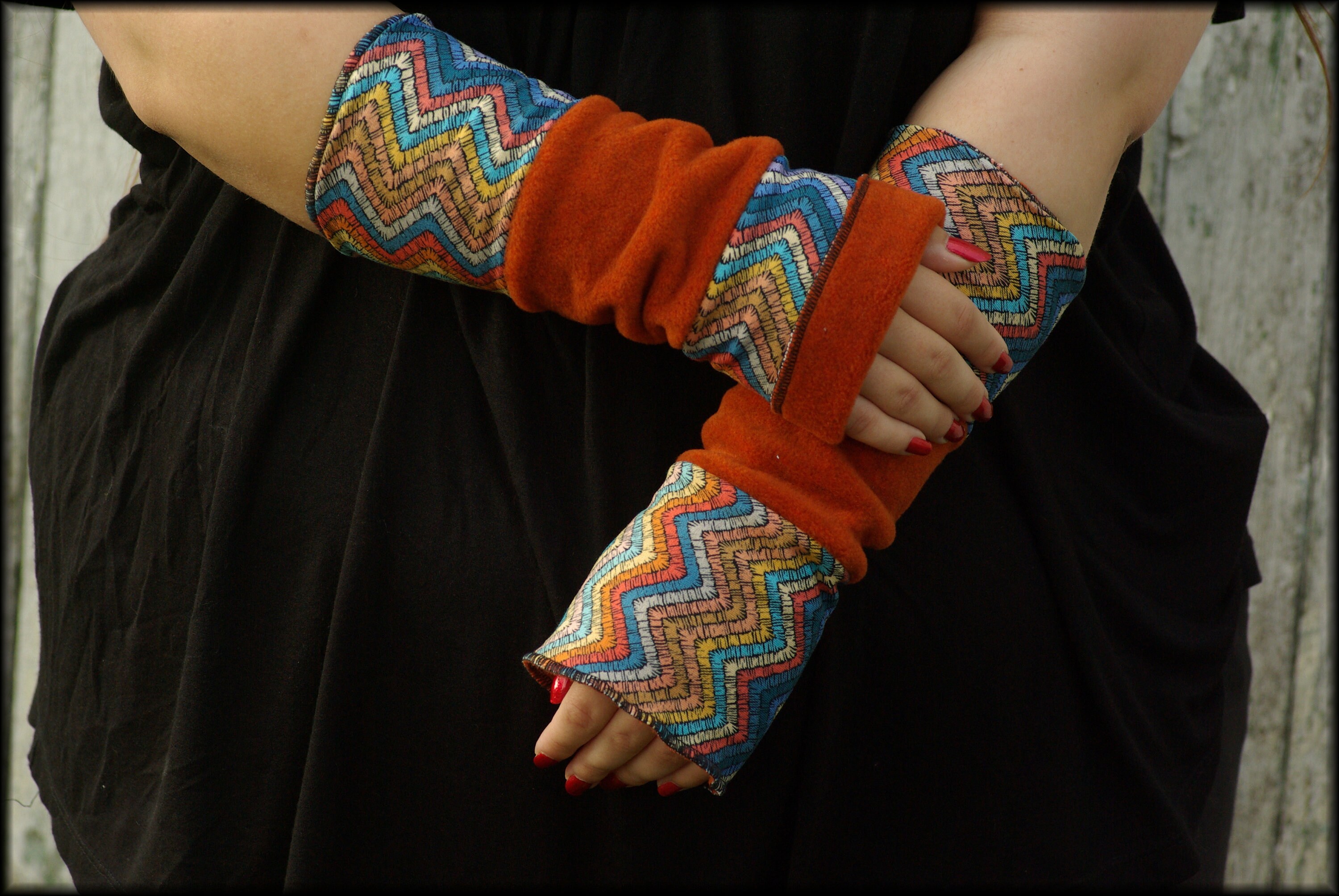 Beautiful cinnamon-rust colored arm warmers, reversible, for turning up and inside out, 25 cm long, 11 cm wide (other dimensions available upon request). They are made from double-layered fabric.