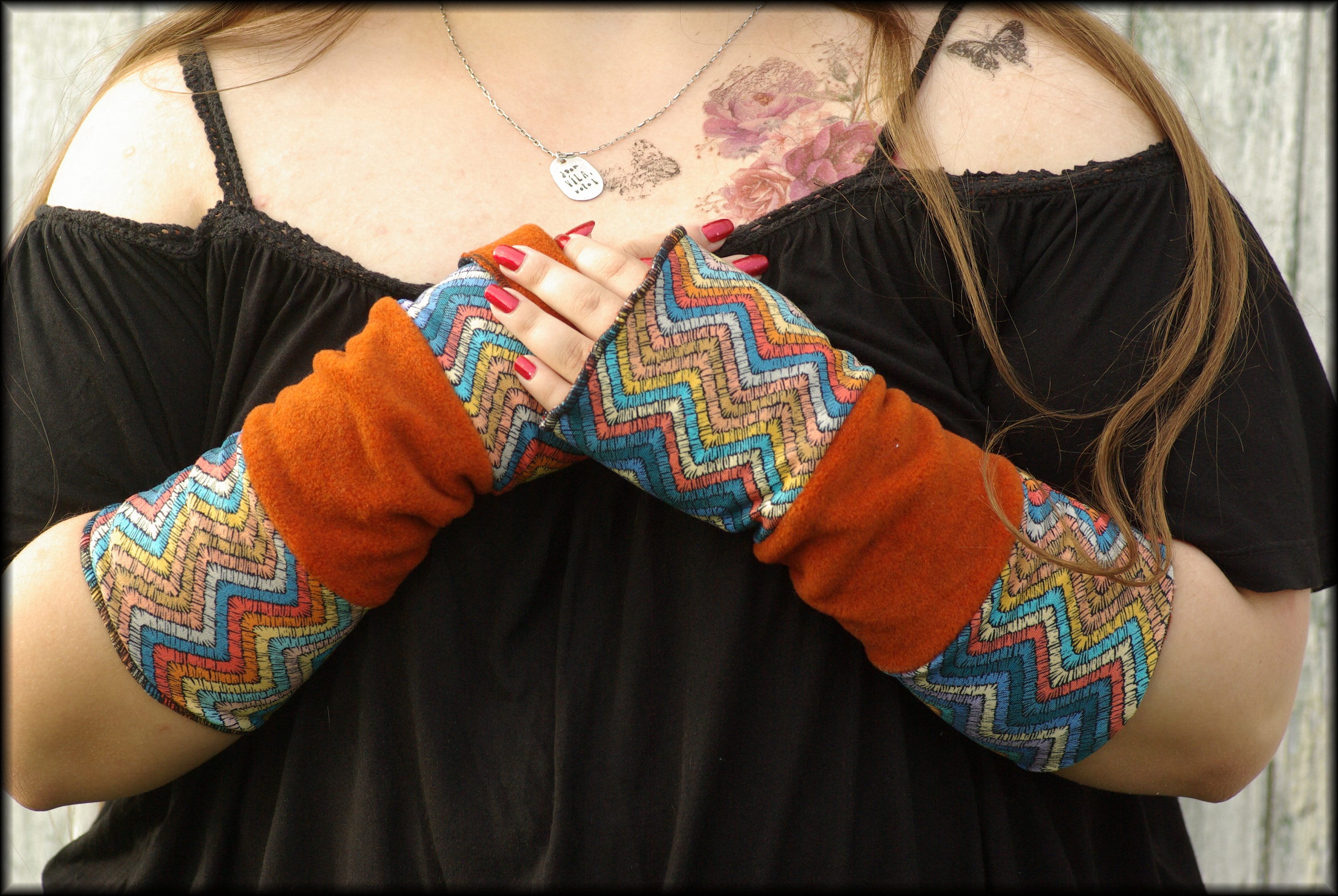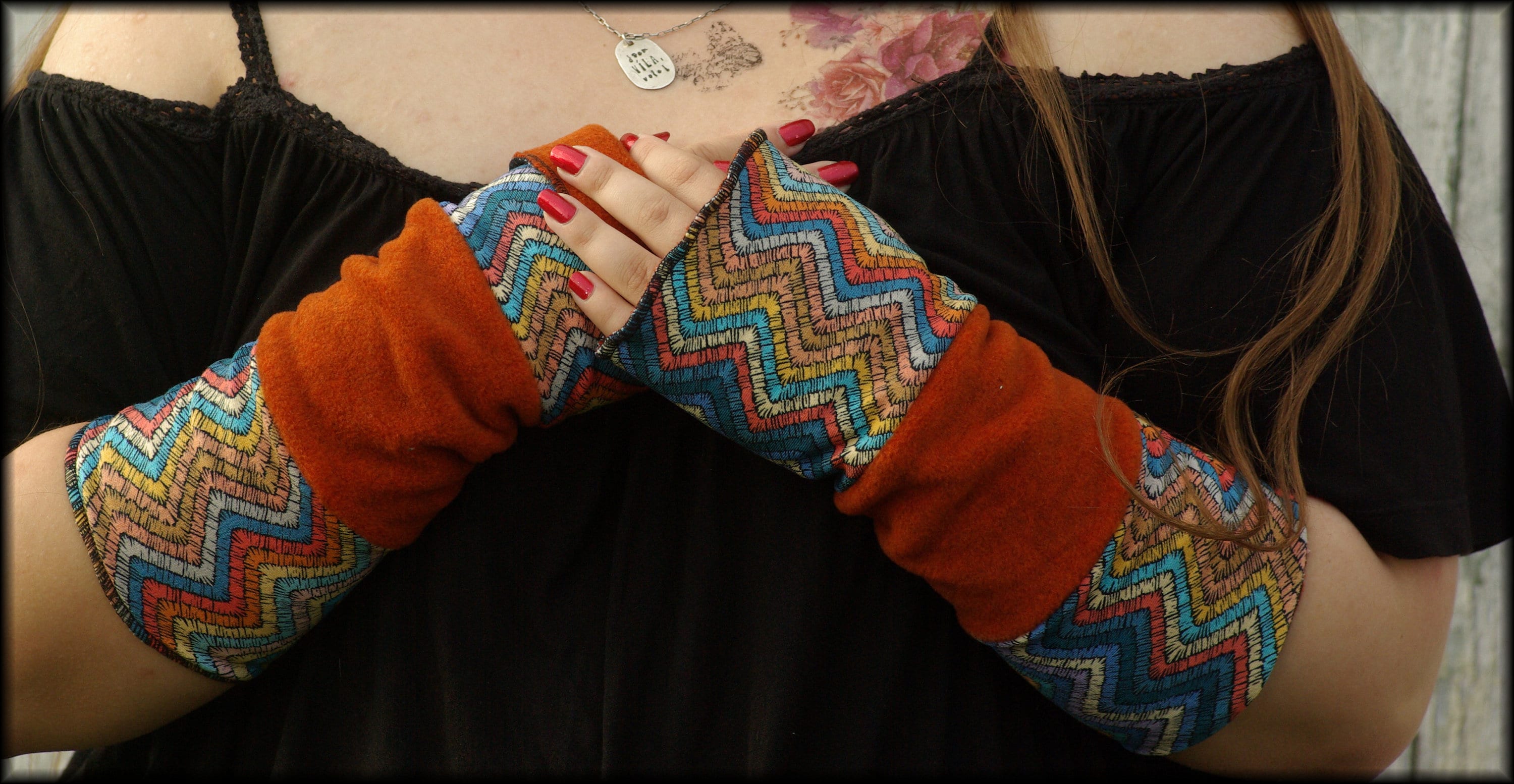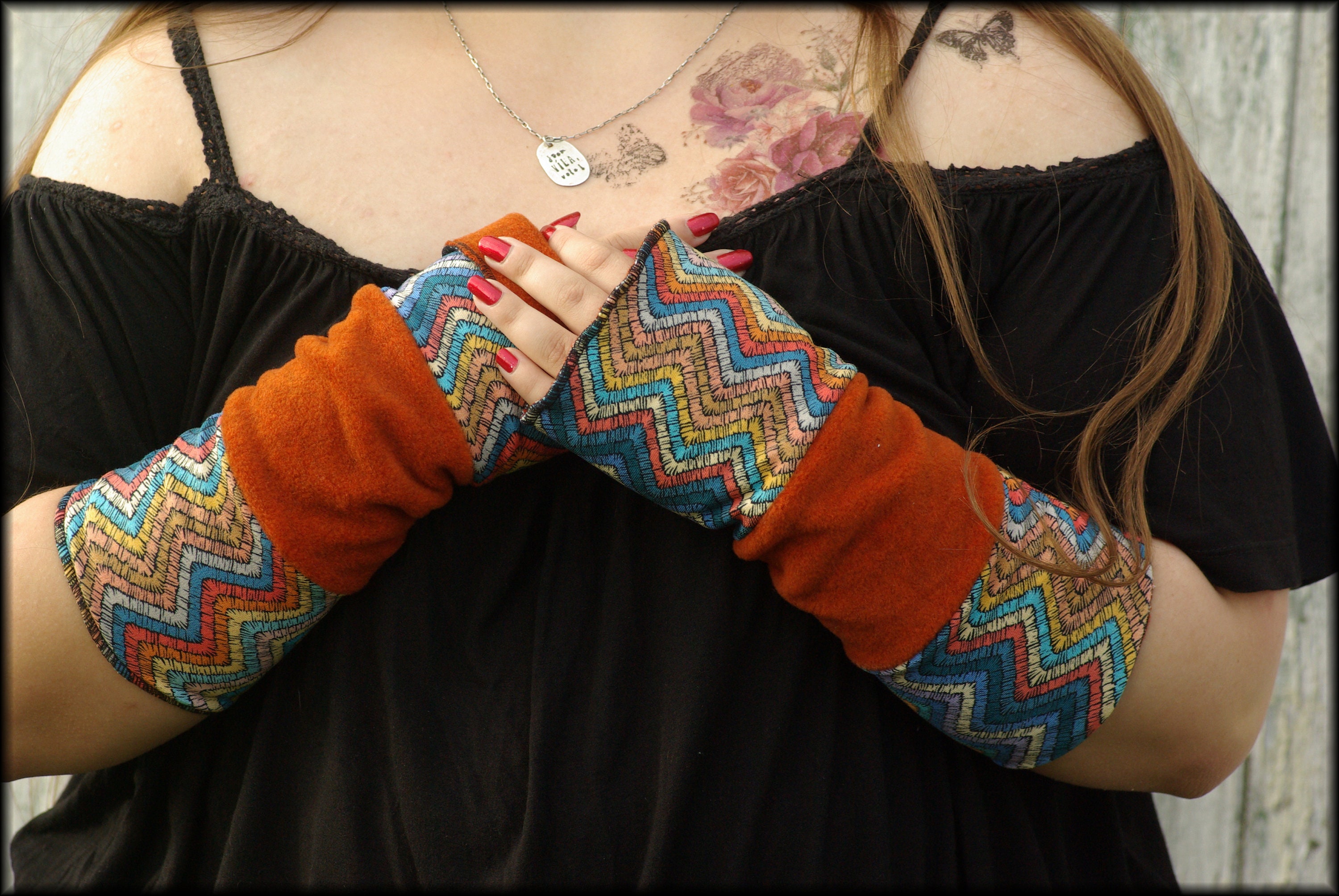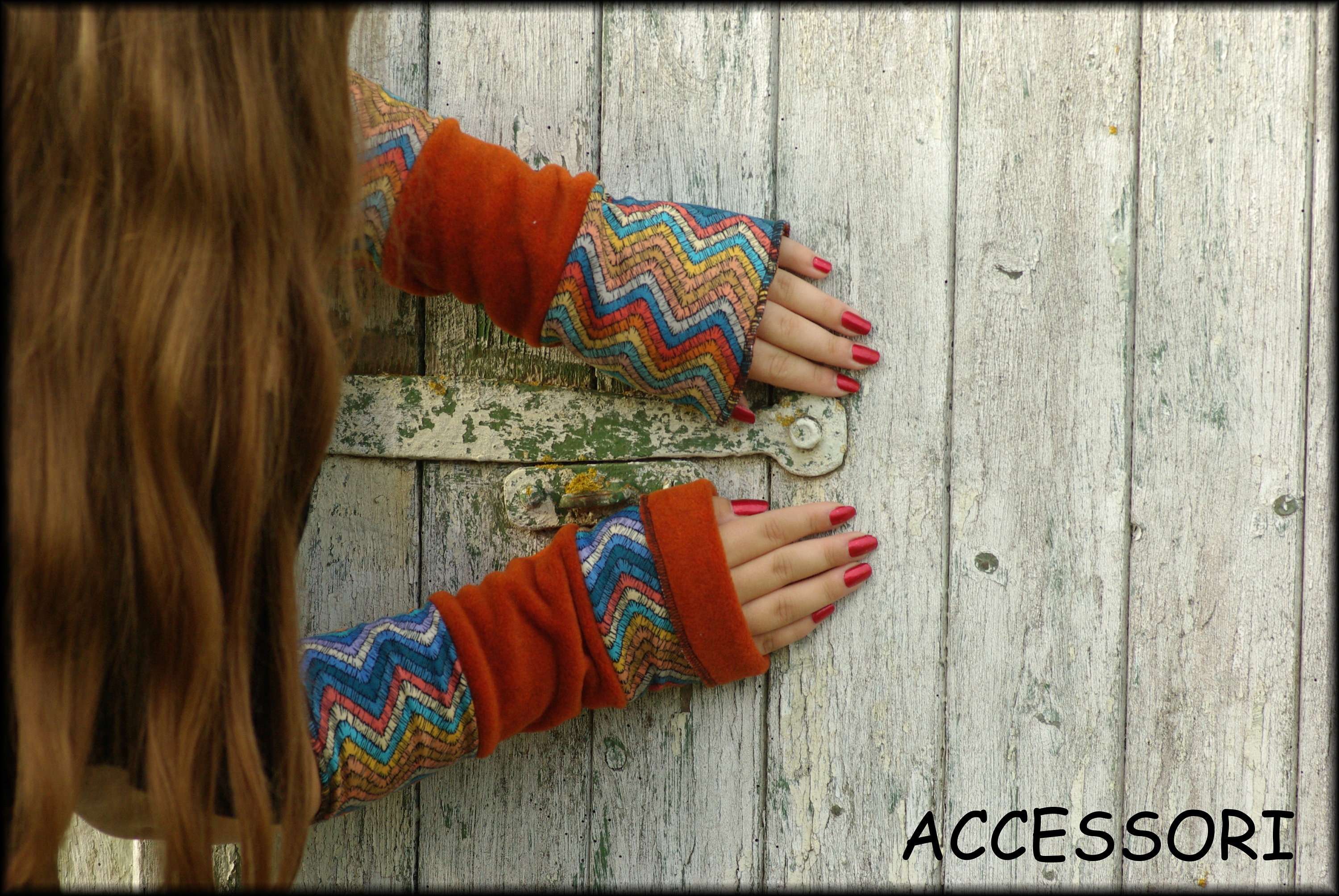 Beautiful cinnamon-rust colored arm warmers, reversible, for turning up and inside out, 25 cm long, 11 cm wide (other dimensions available upon request). They are made from double-layered fabric.
