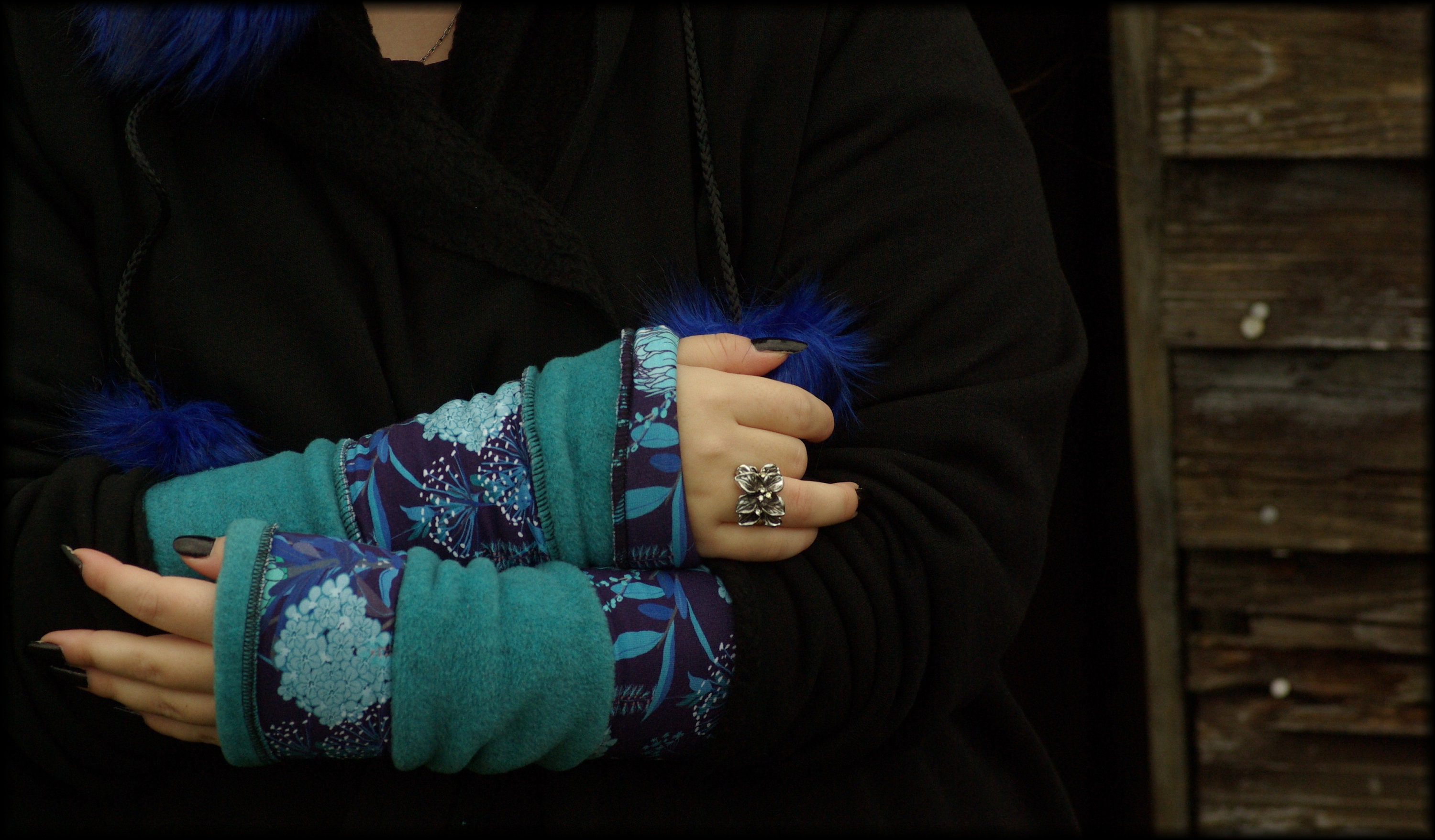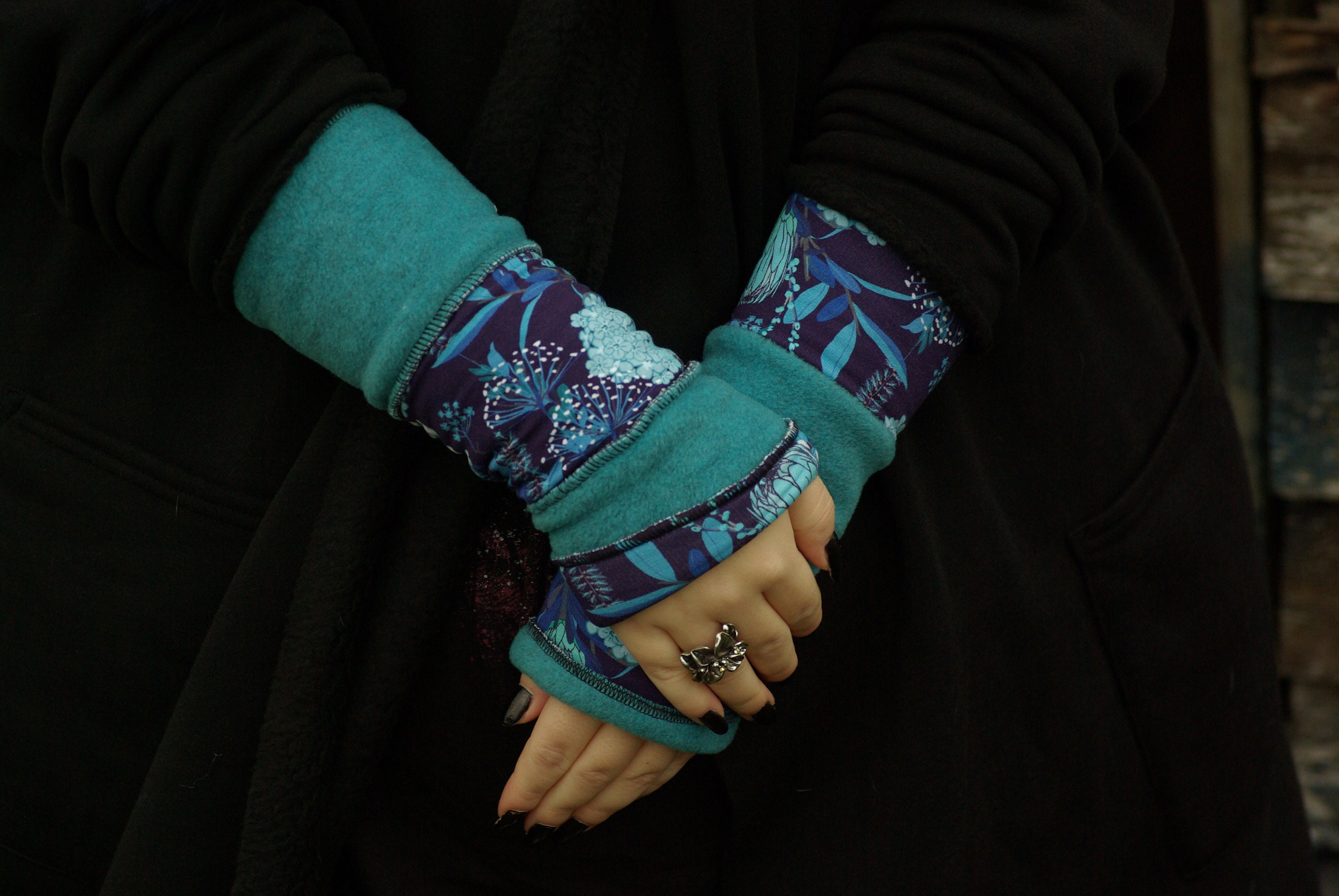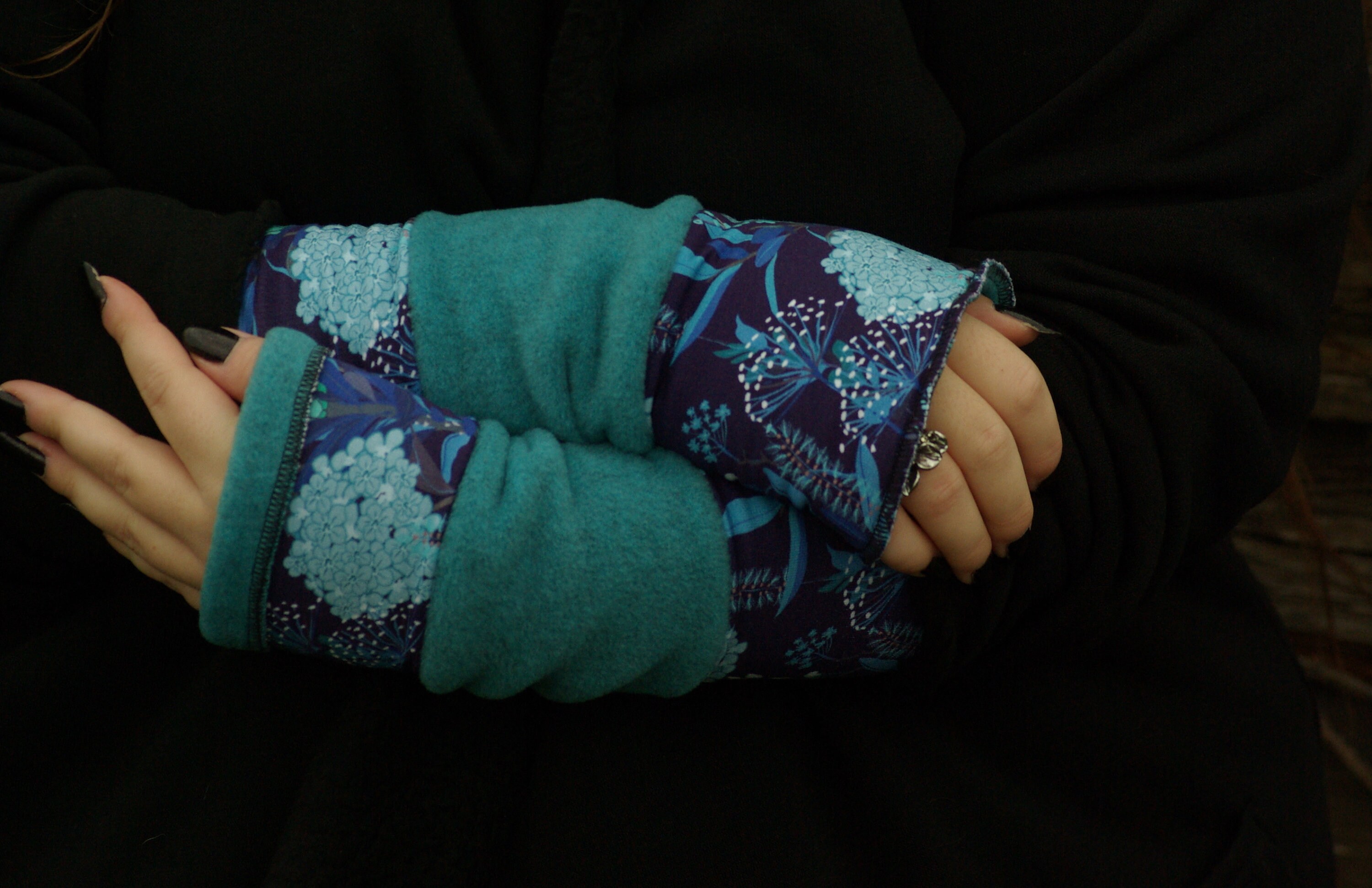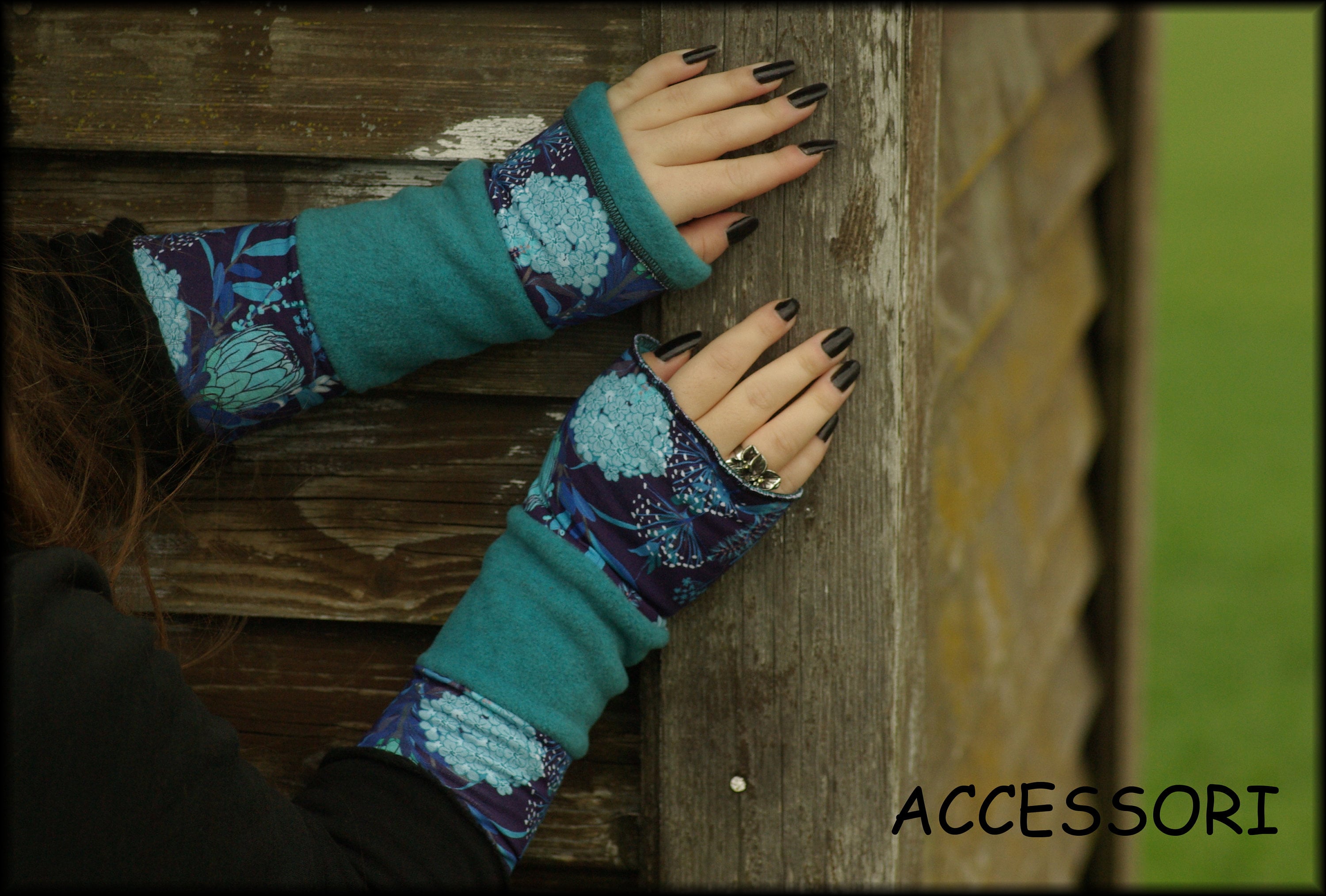 Beautiful arm warmers in turquoise color, motif: flowered, on both sides, to turn upside down and turn, length 25 cm, width 11 cm (on request I can also sew other dimensions). They are sewn from double fabric.