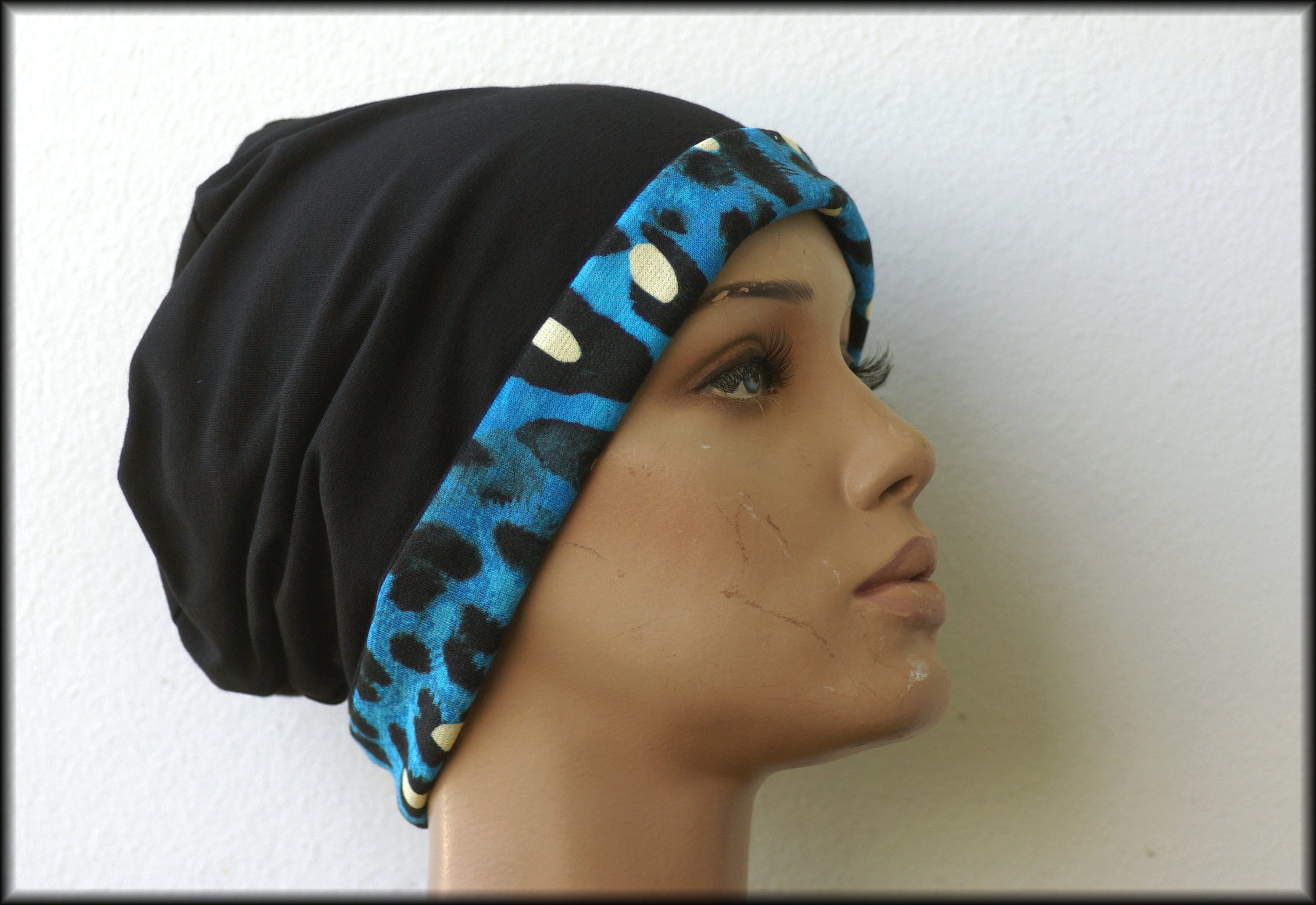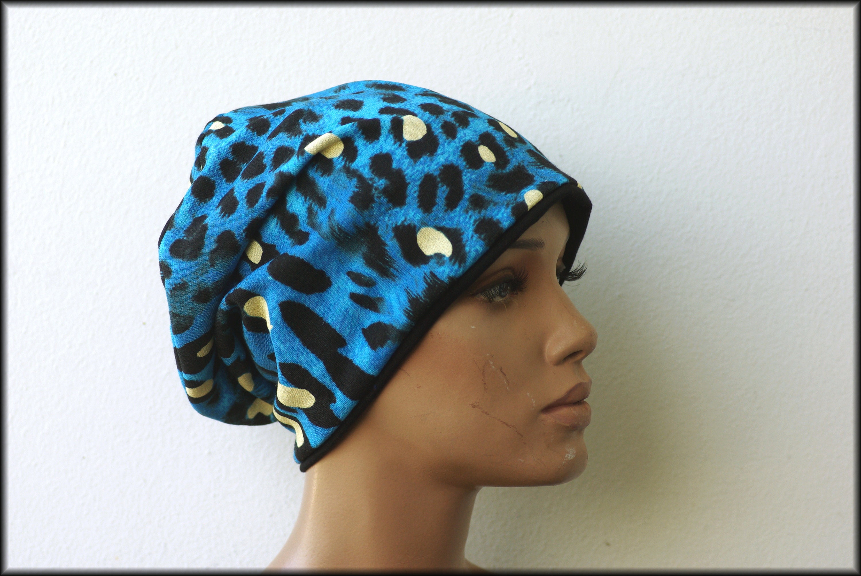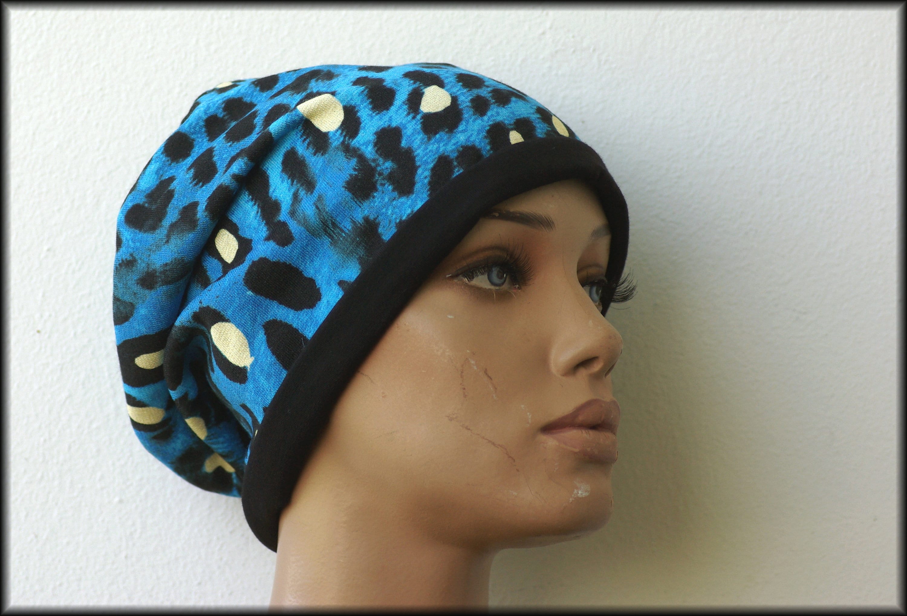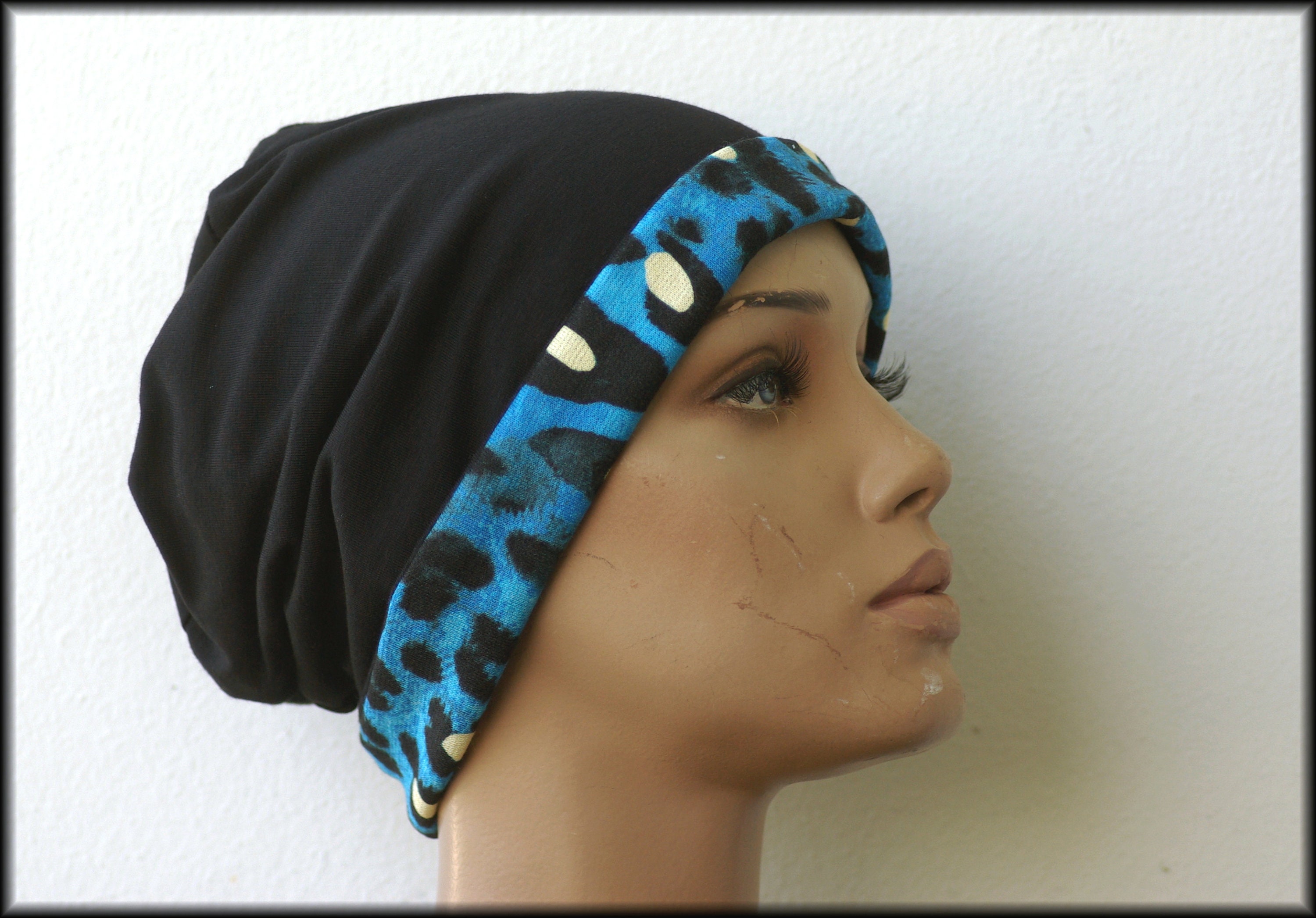 Cap Beanie double cap reversible cap blue black leopard motif viscose jersey cotton jersey