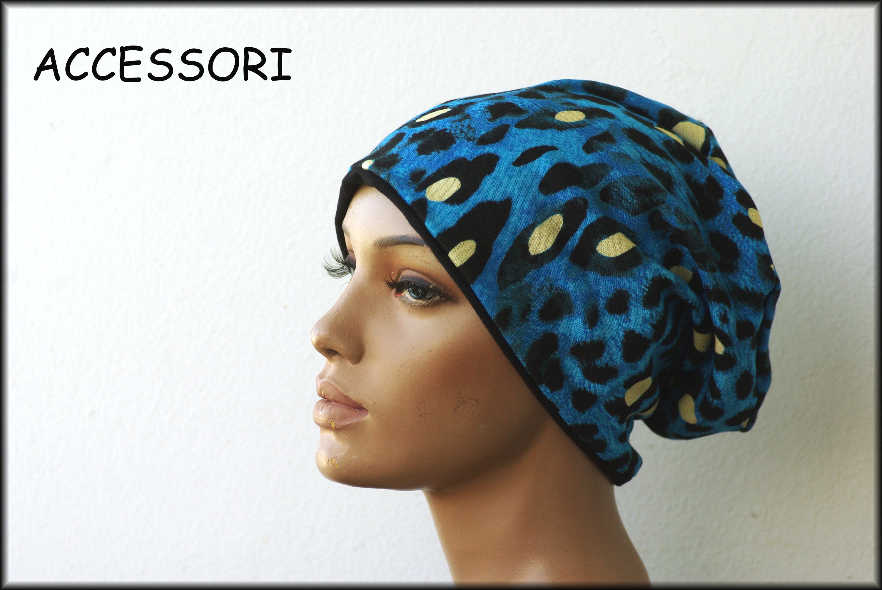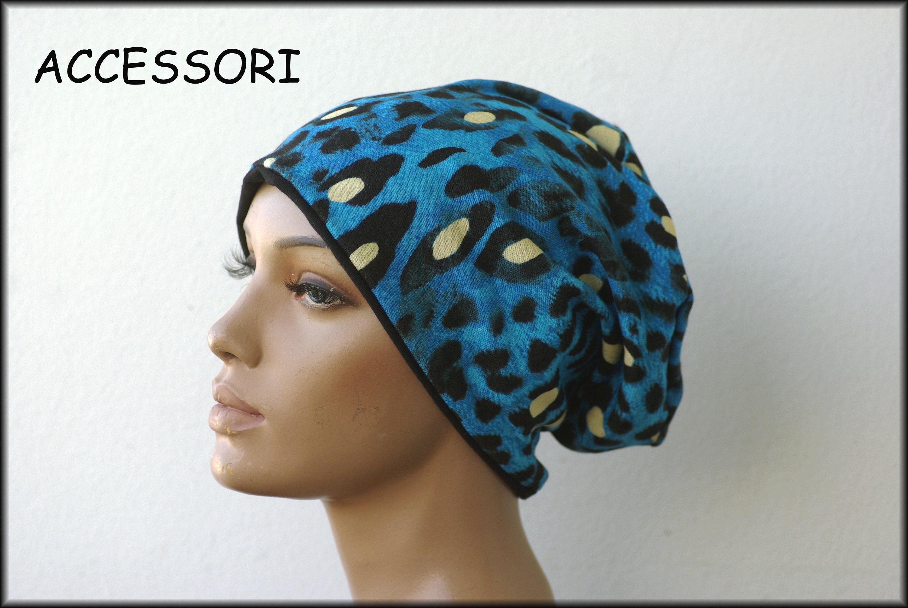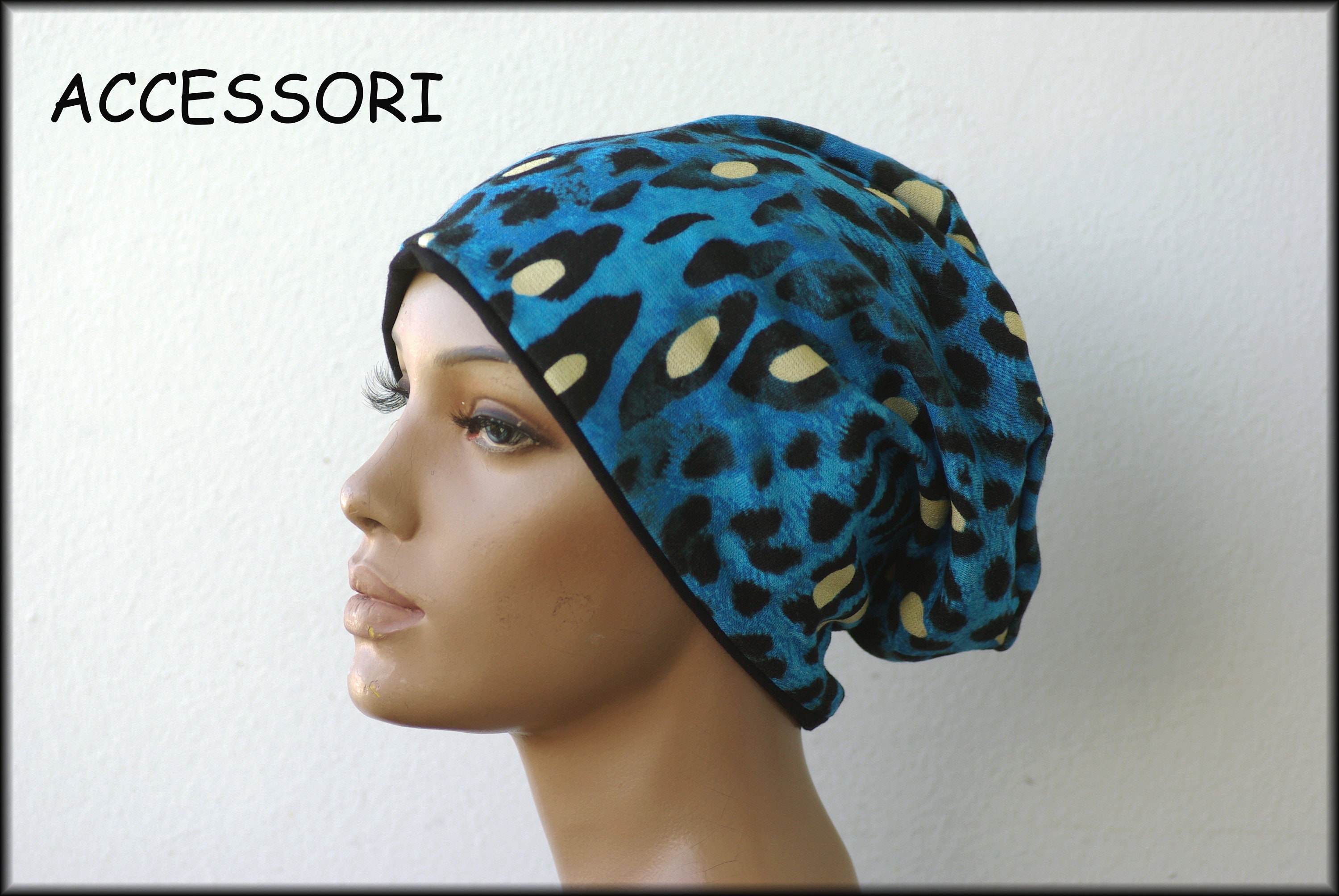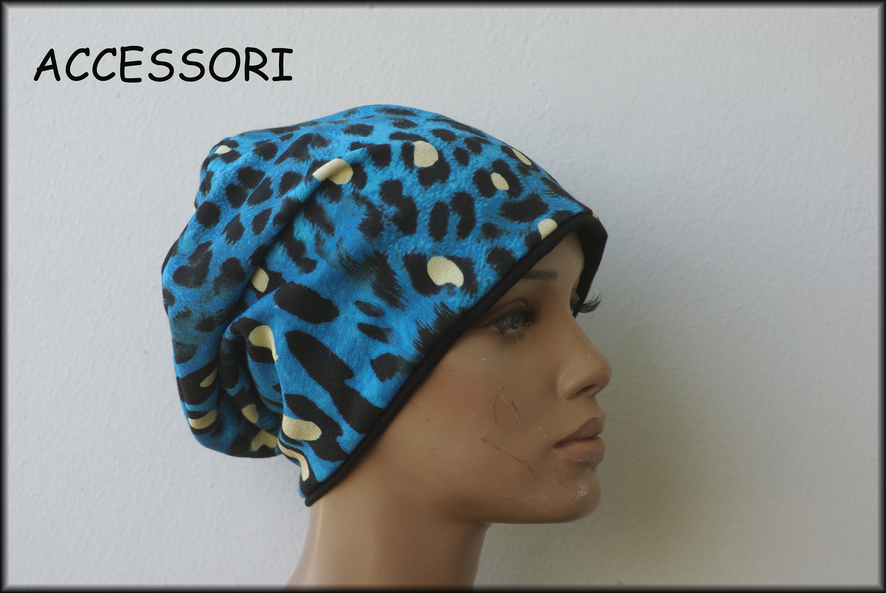 Cap Beanie double cap reversible cap blue black leopard motif viscose jersey cotton jersey
