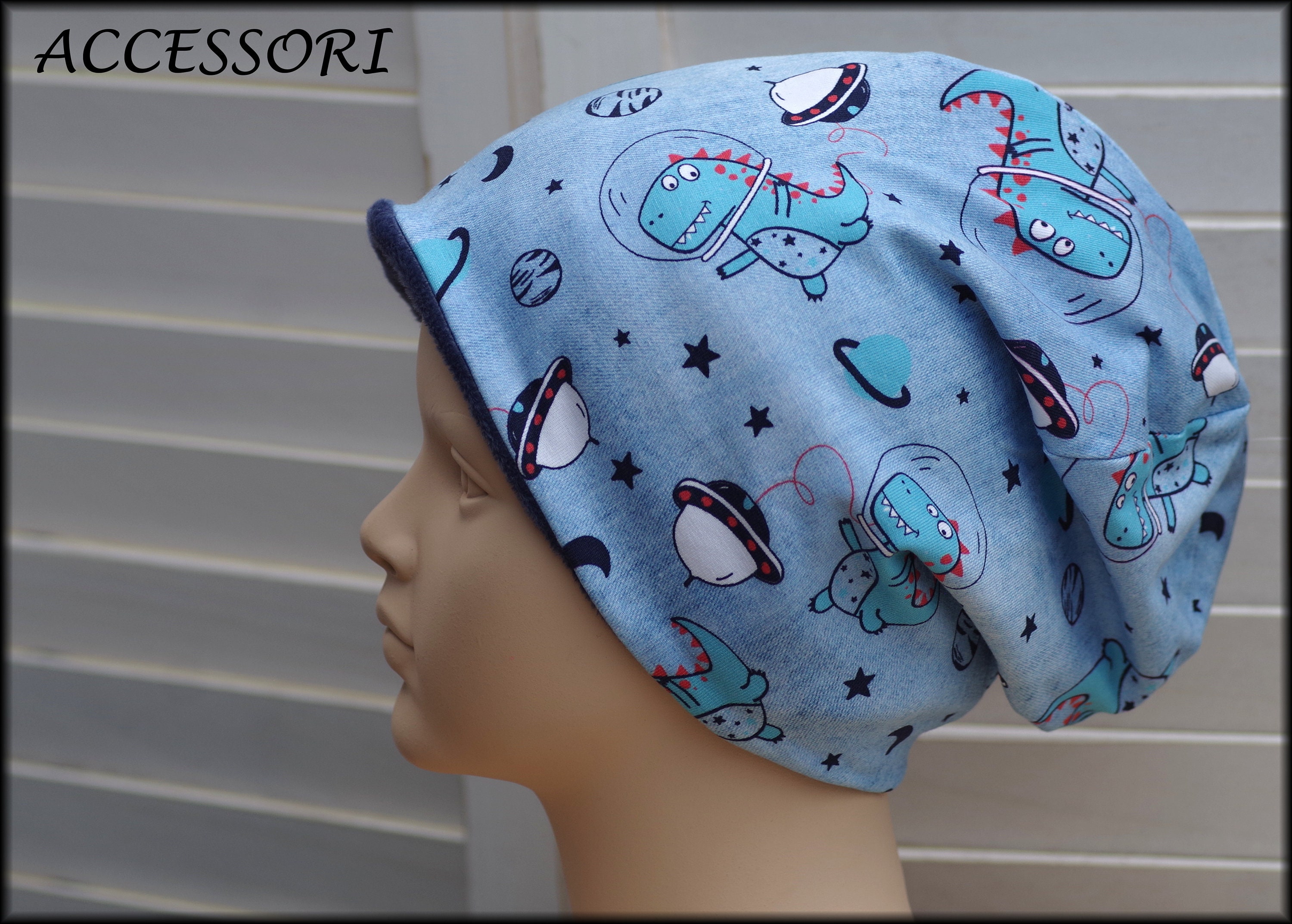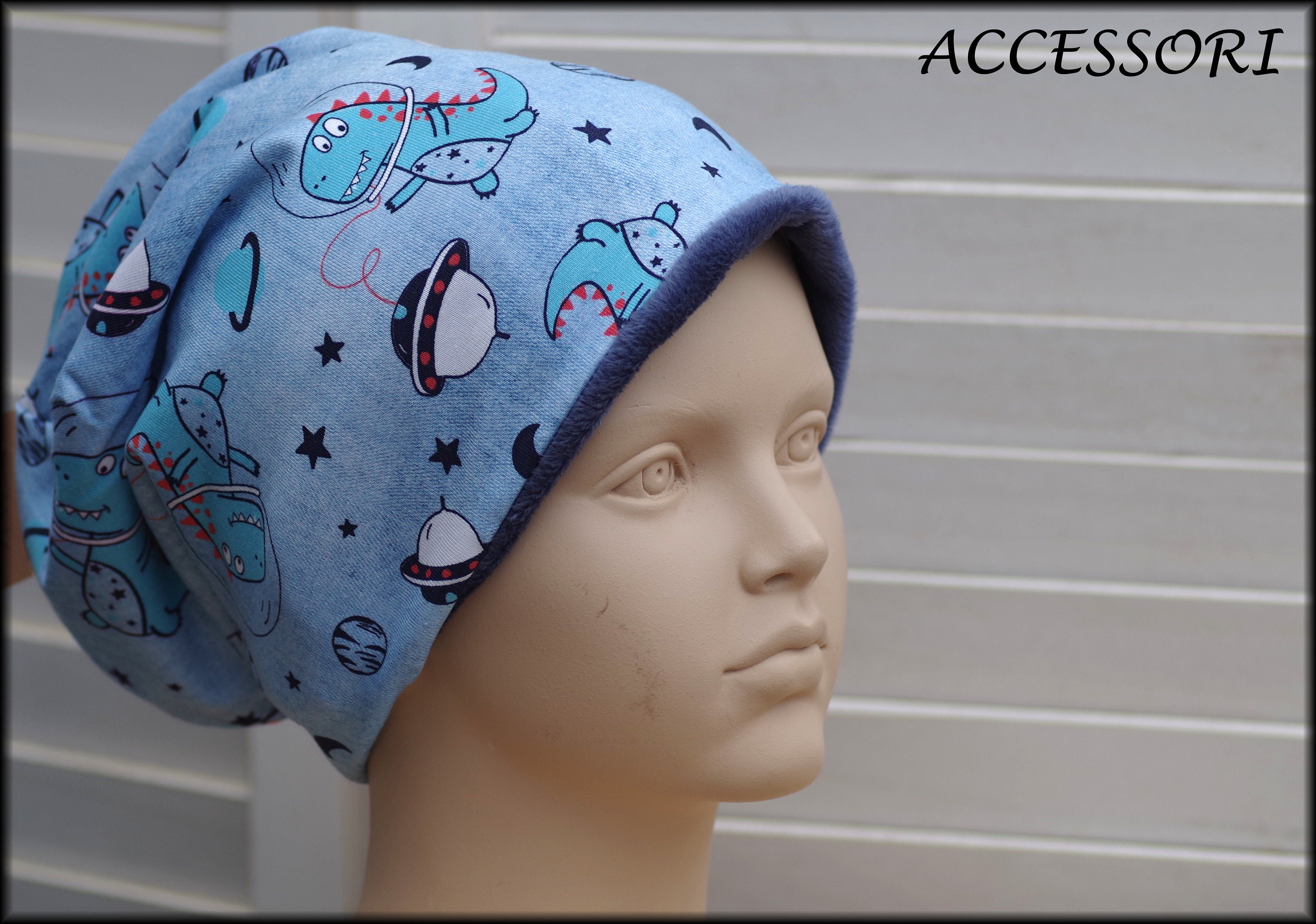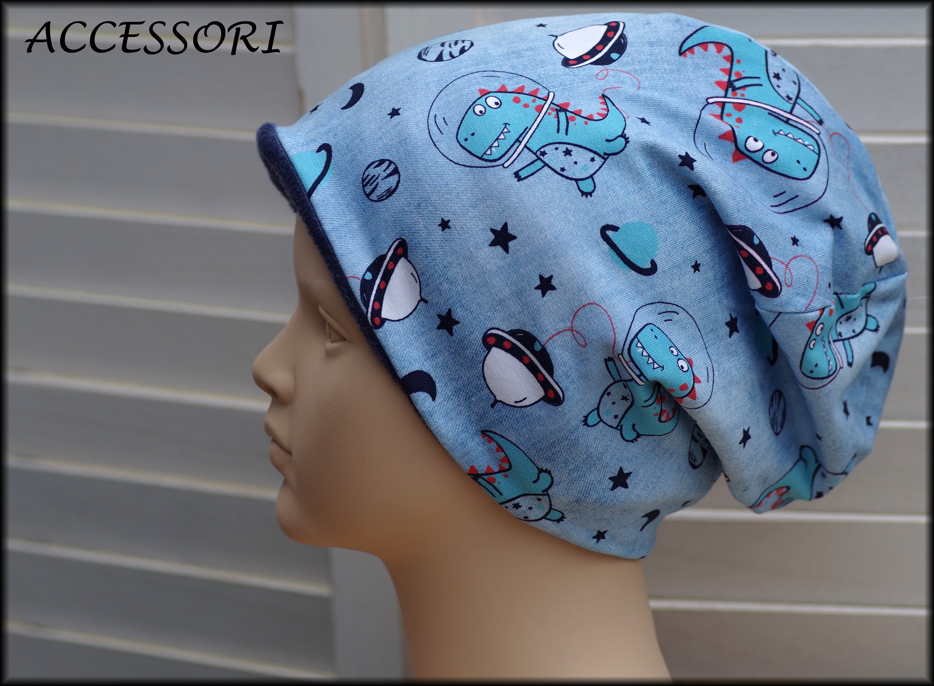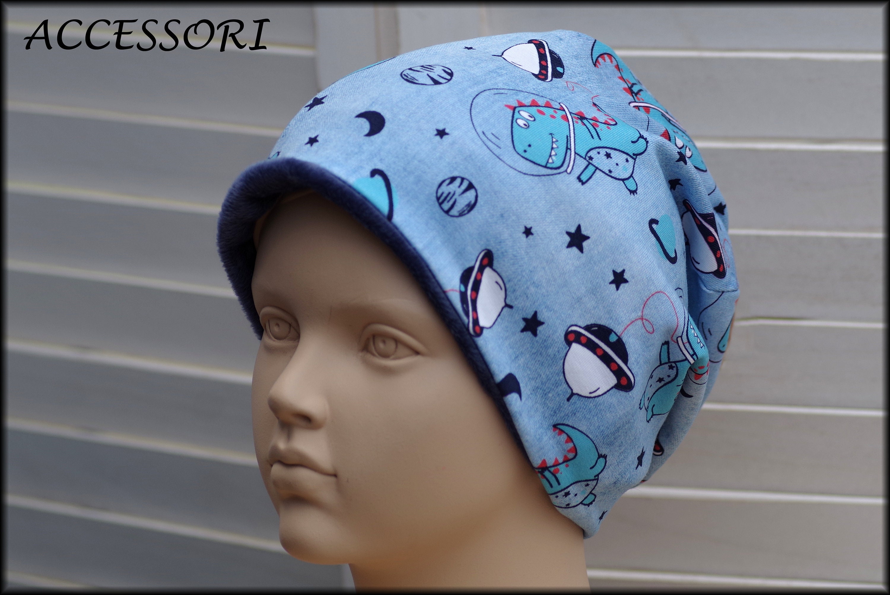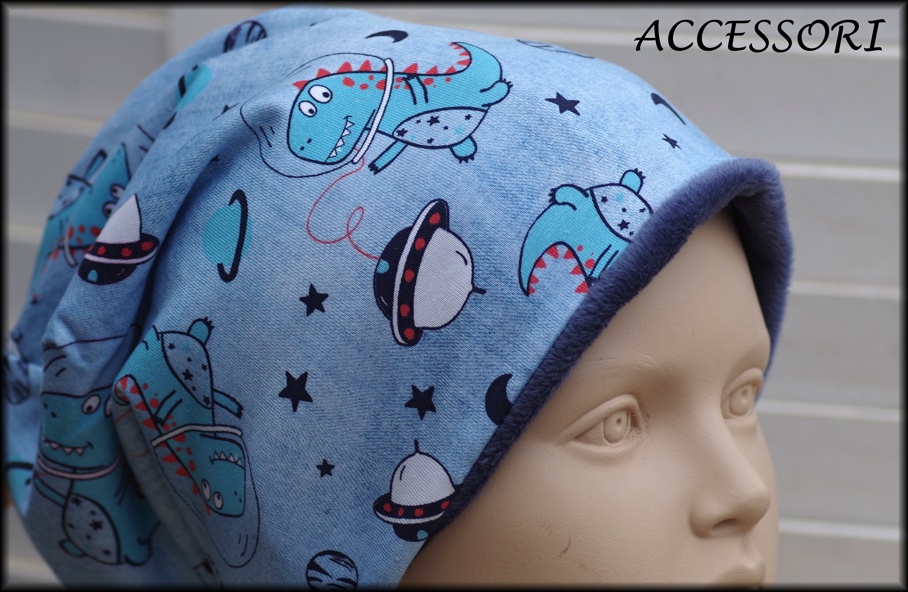 Children's Beanie Loop Dinos UFO blue white cotton baby hat warm cozy with alpine fleece lining winter hat