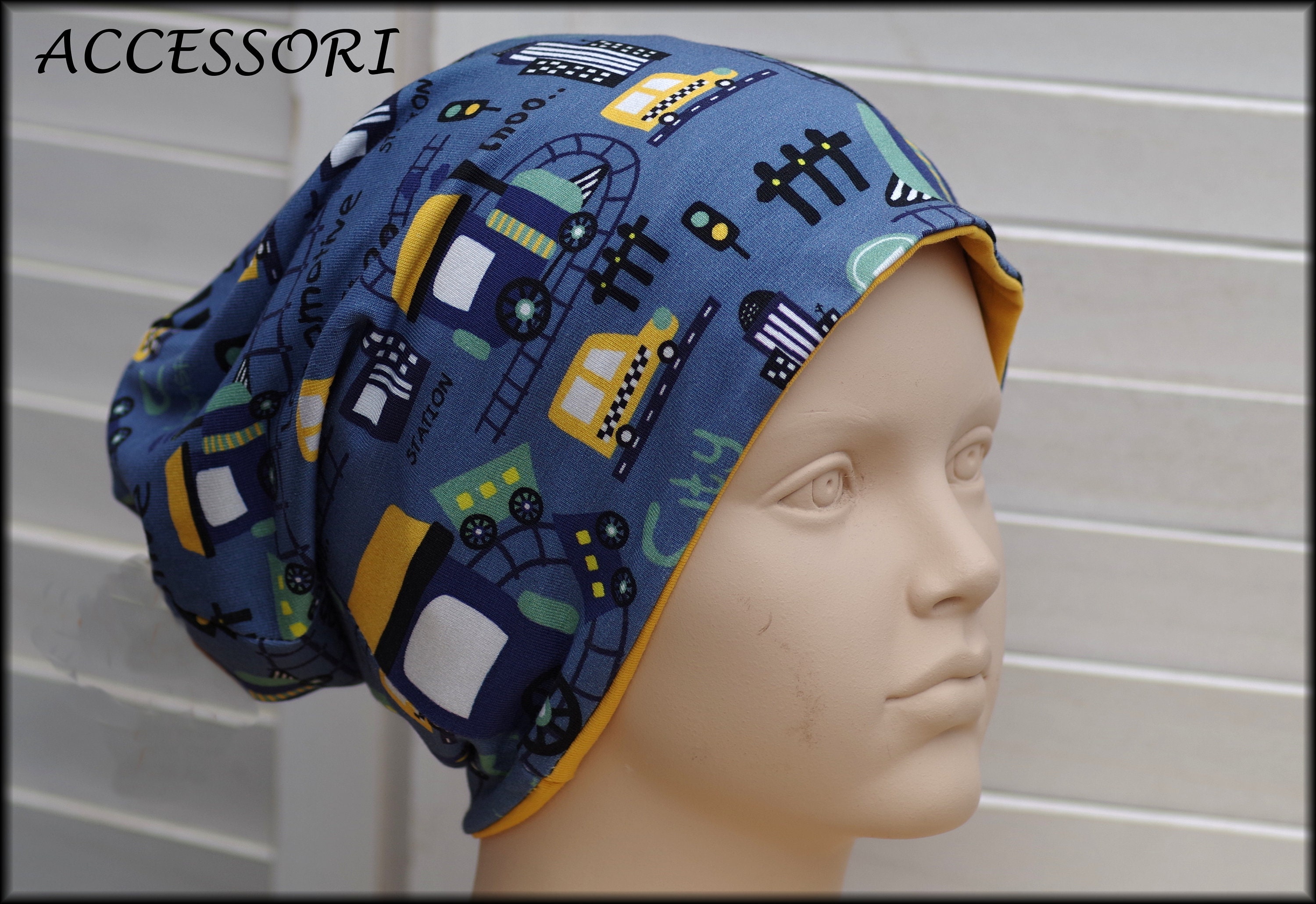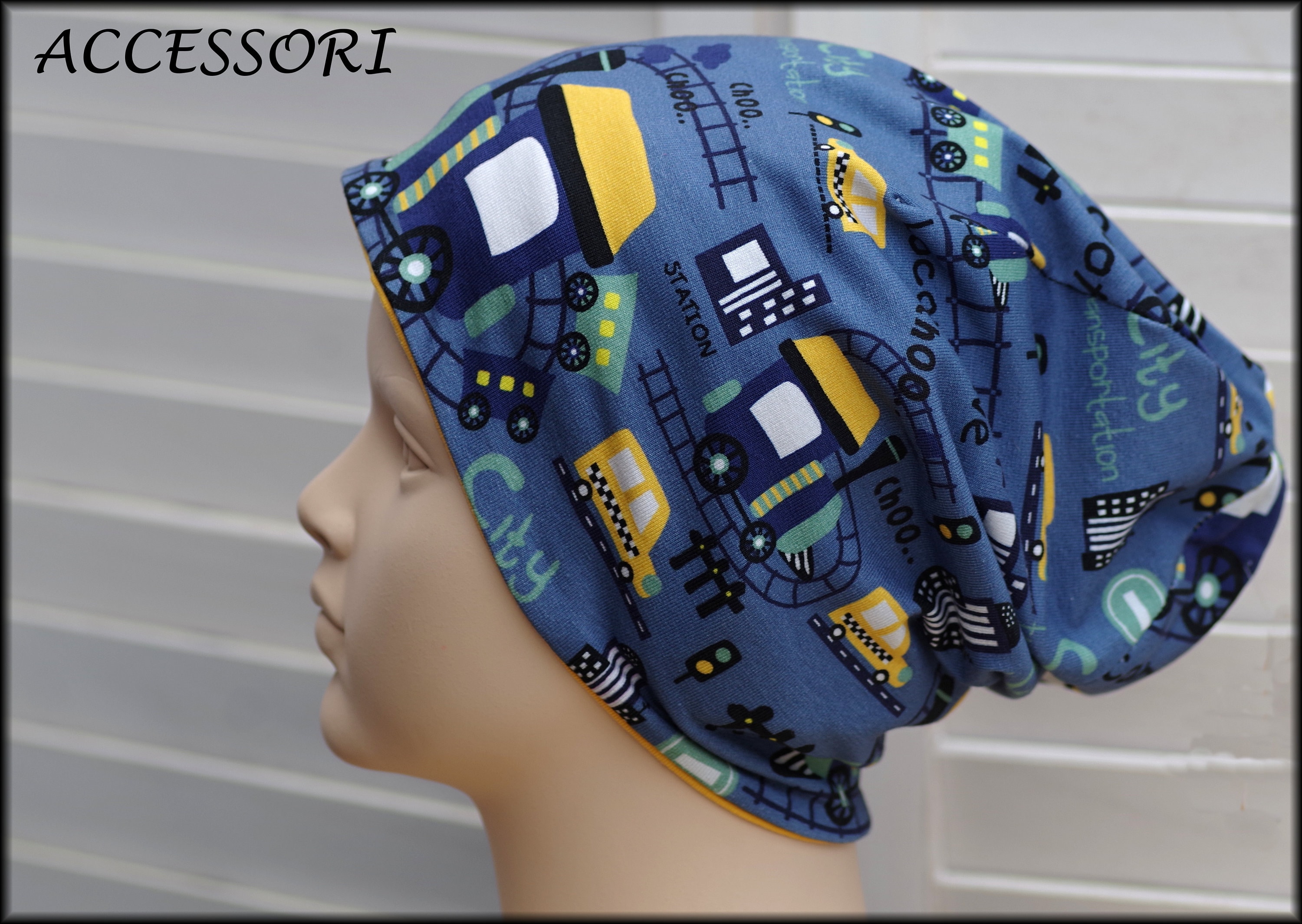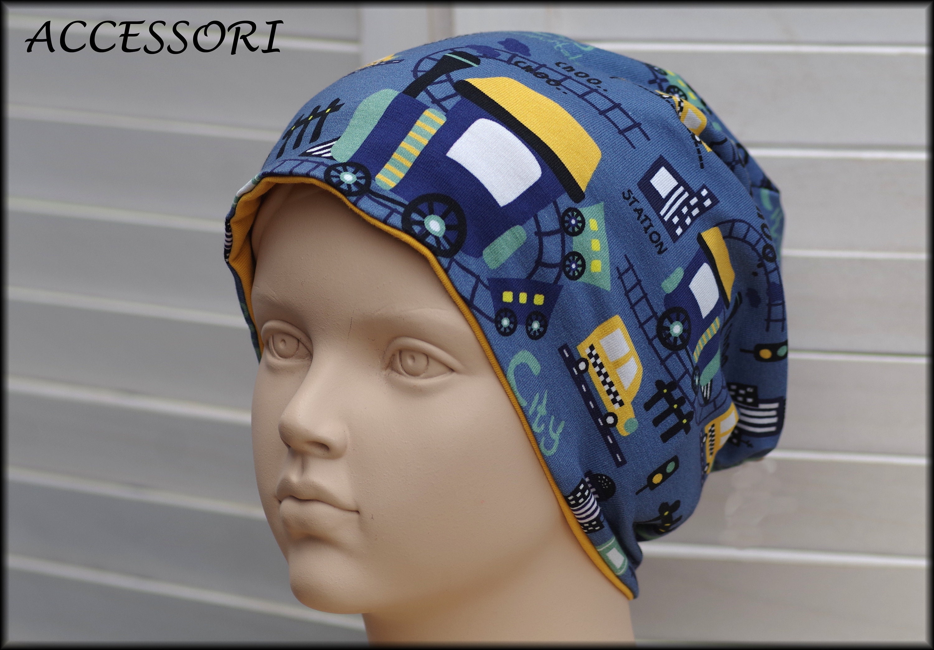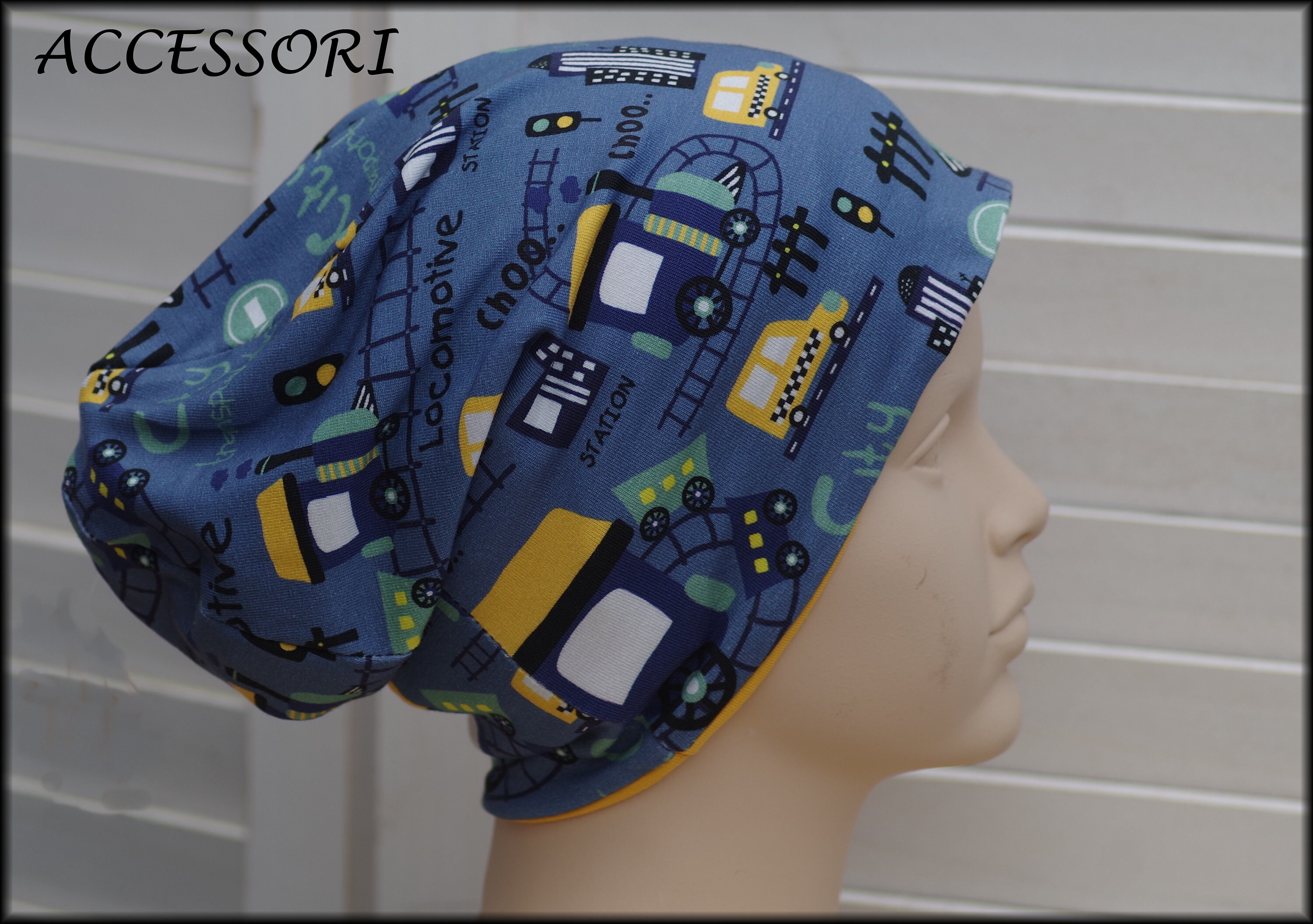 Children's Beanie Loop Locomotive Train dark blue yellow cotton baby hat warm cuddly fleece winter hat
