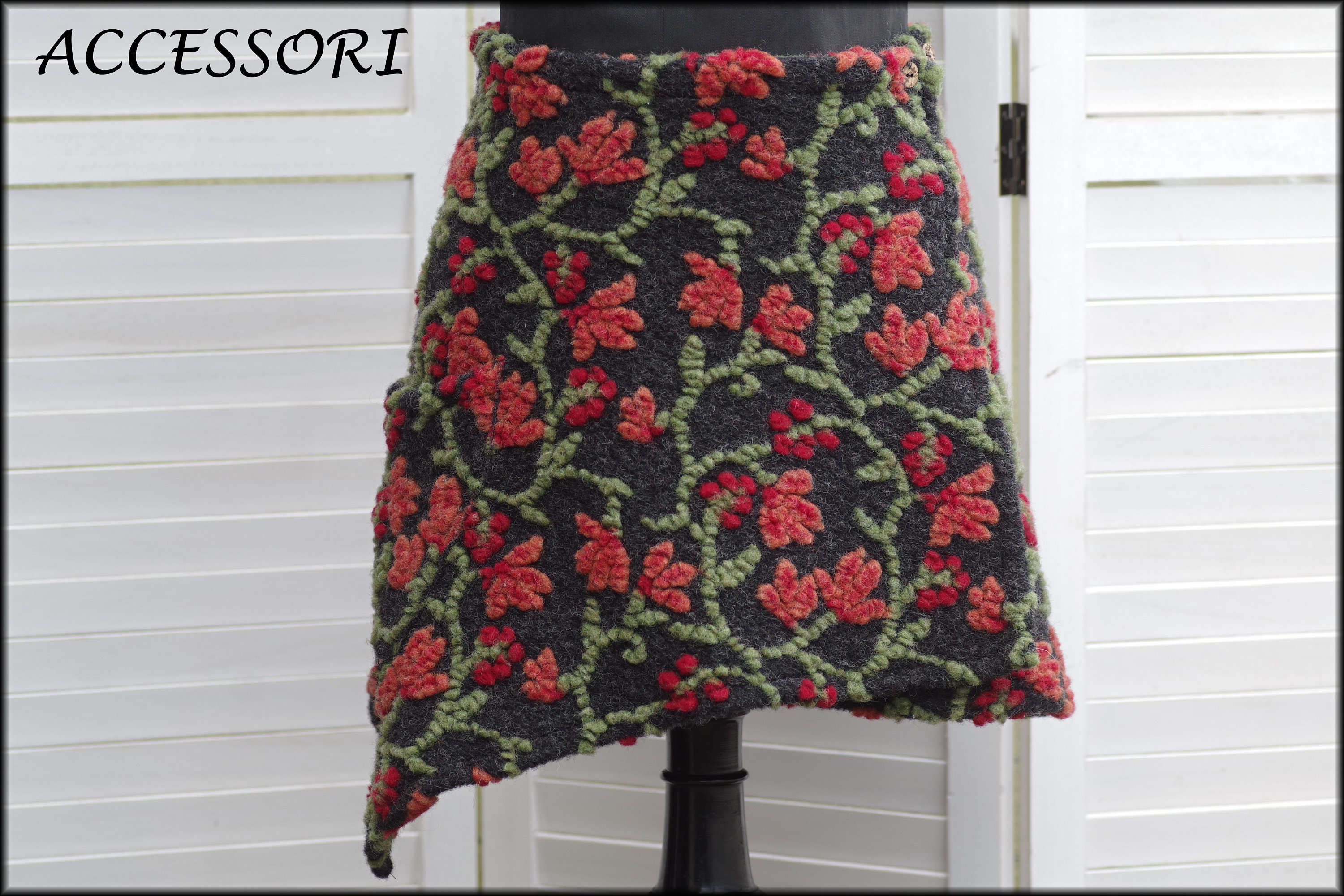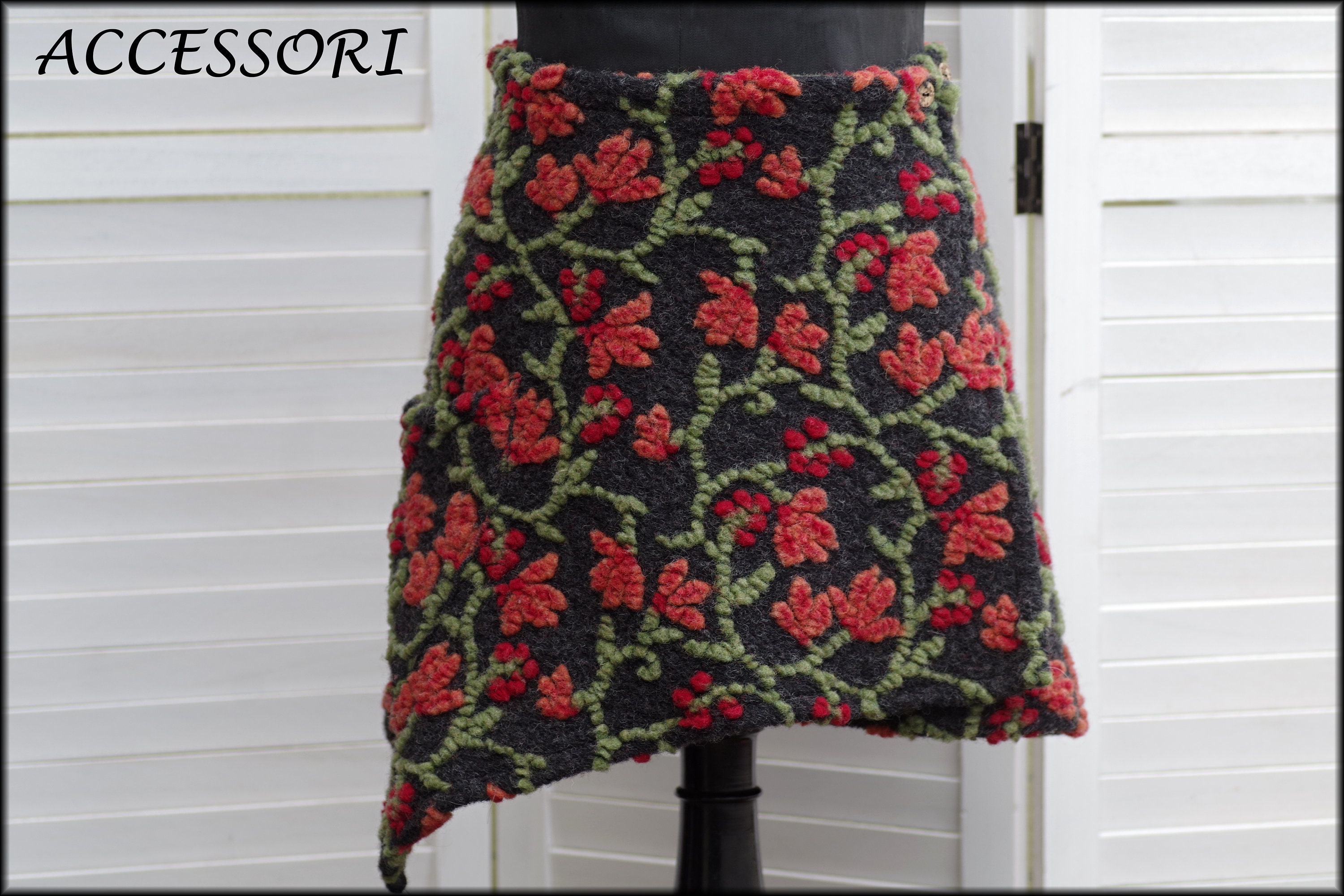 This wrap skirt is sewn from a high-quality wool fabric (80% wool, 20% cotton), floral. Rubber is sewn in at the back.