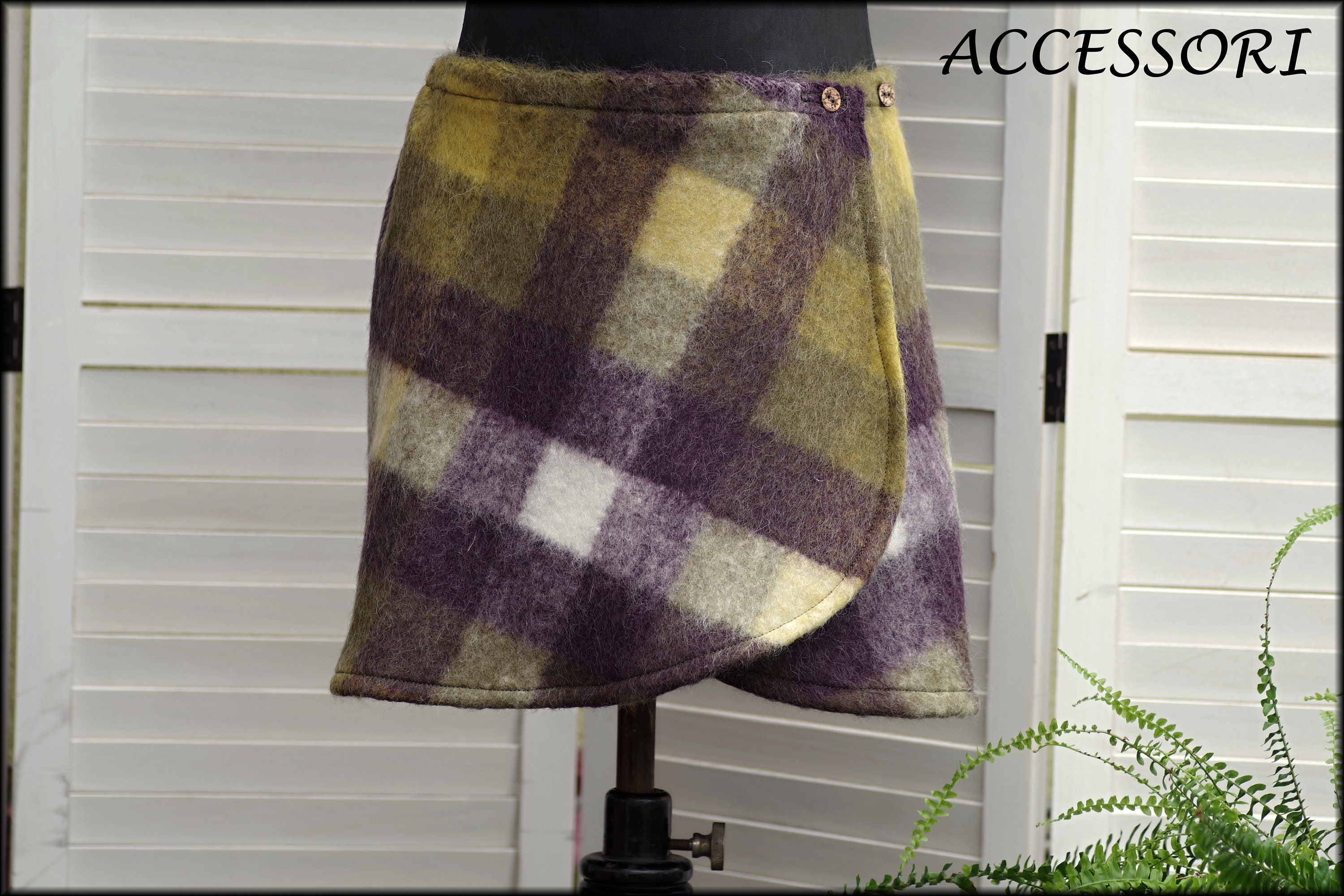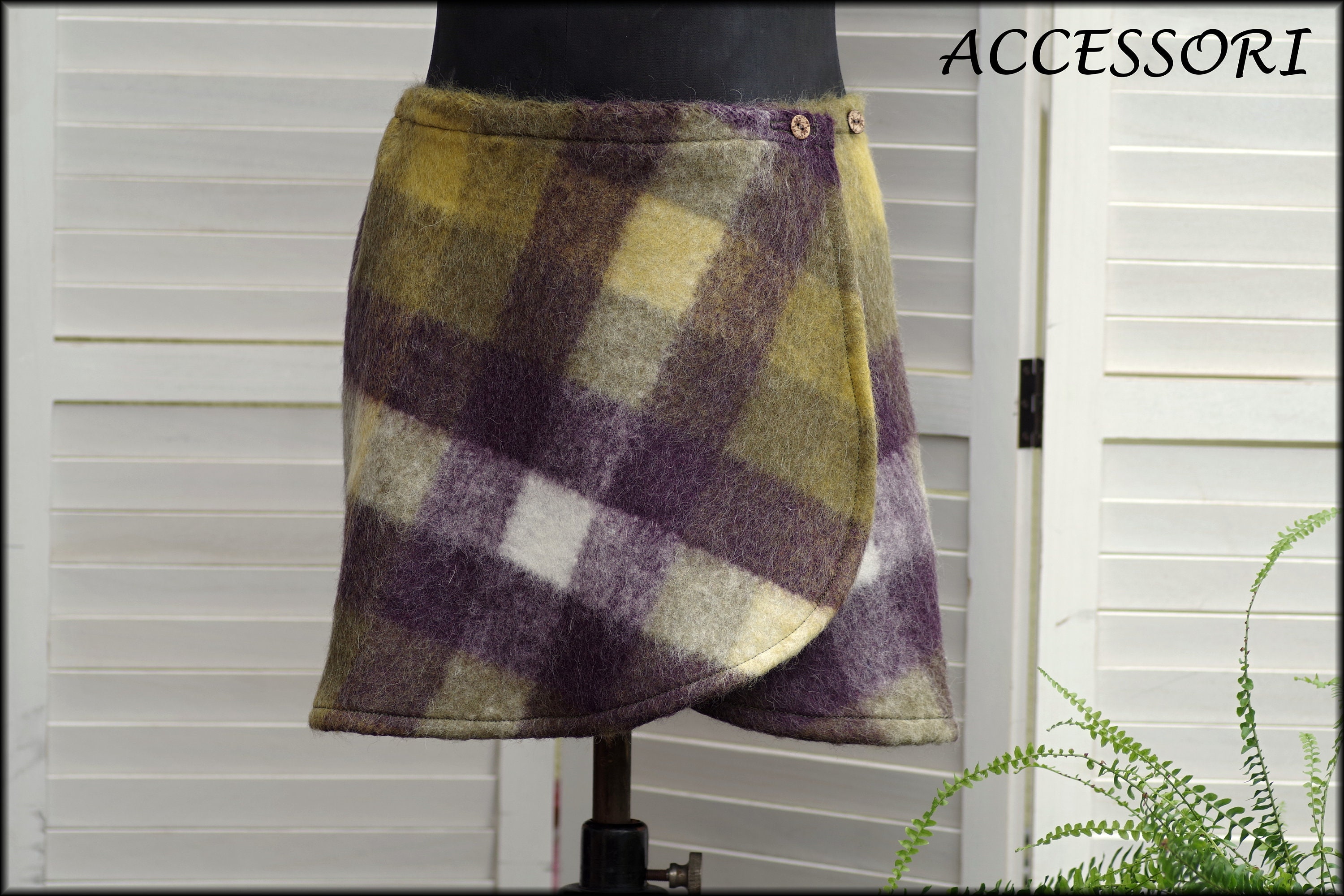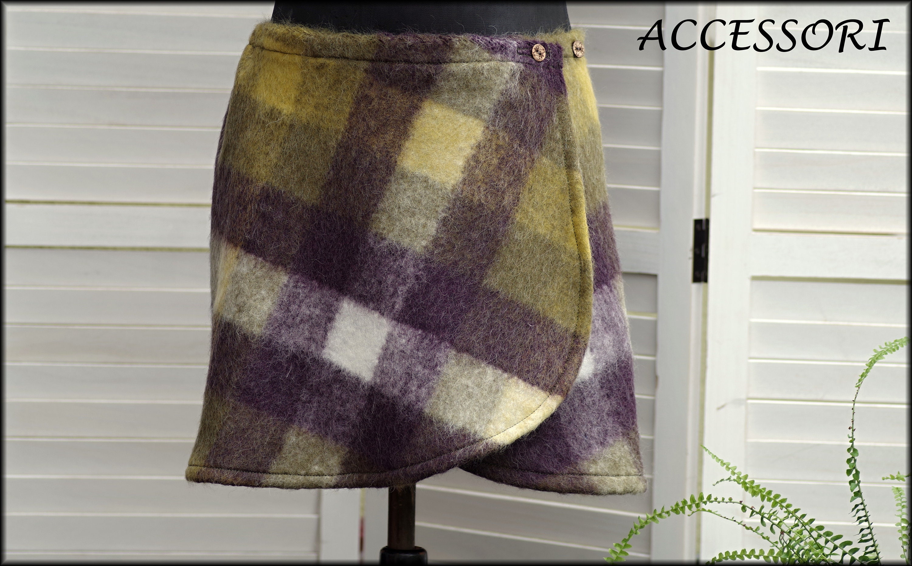 This wrap skirt is made from a soft wool fabric (60% wool, 40% polyamide). Elastic is sewn in at the back.