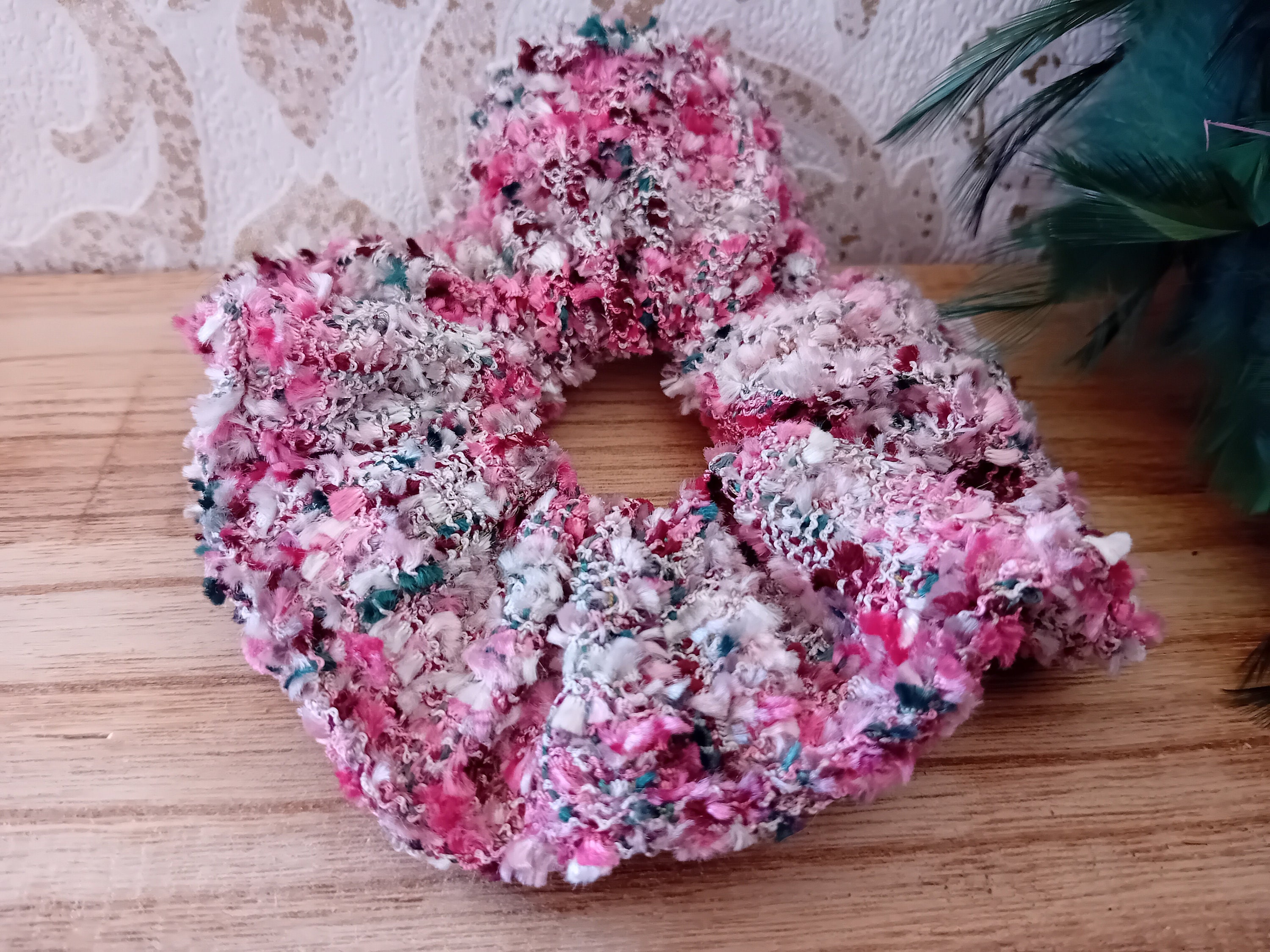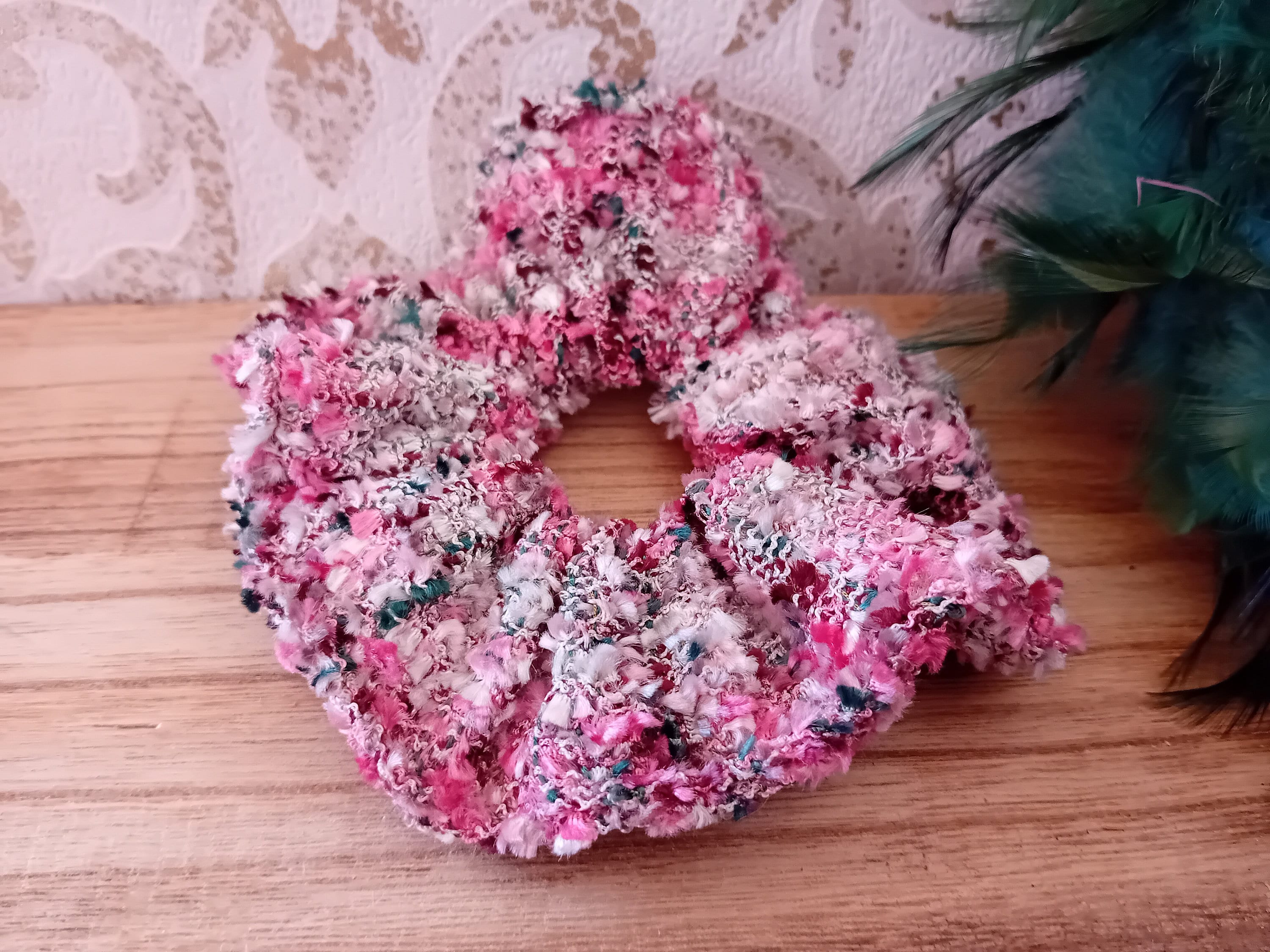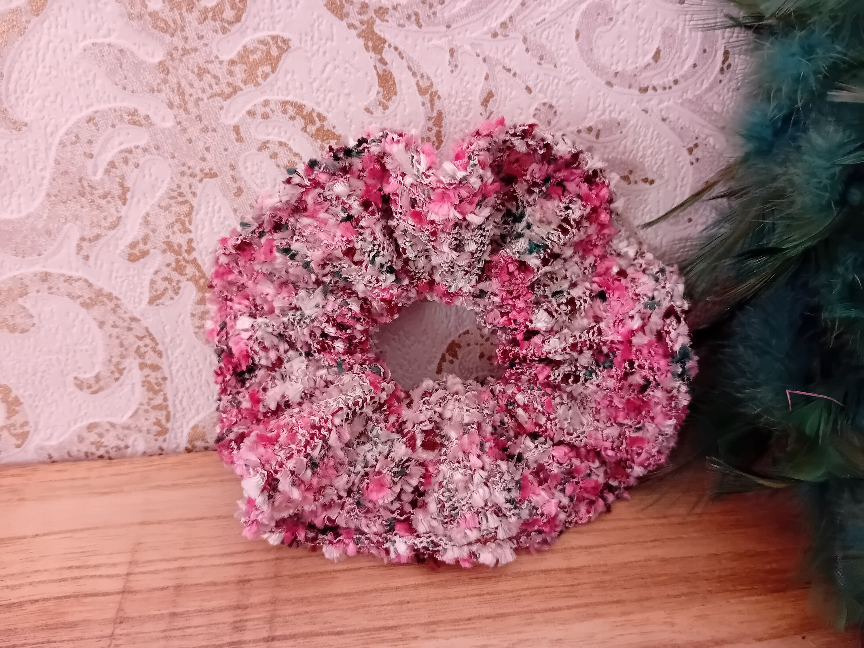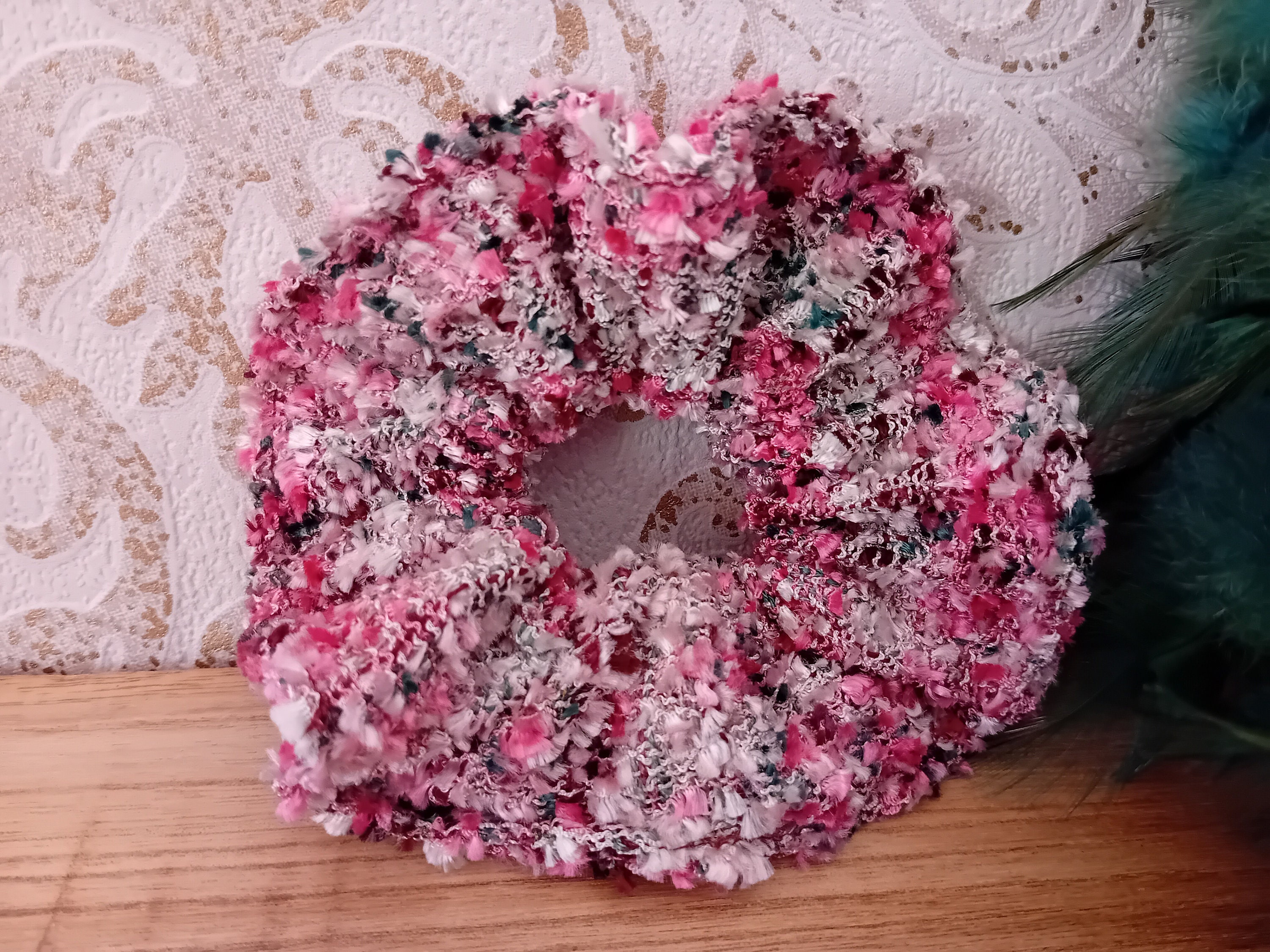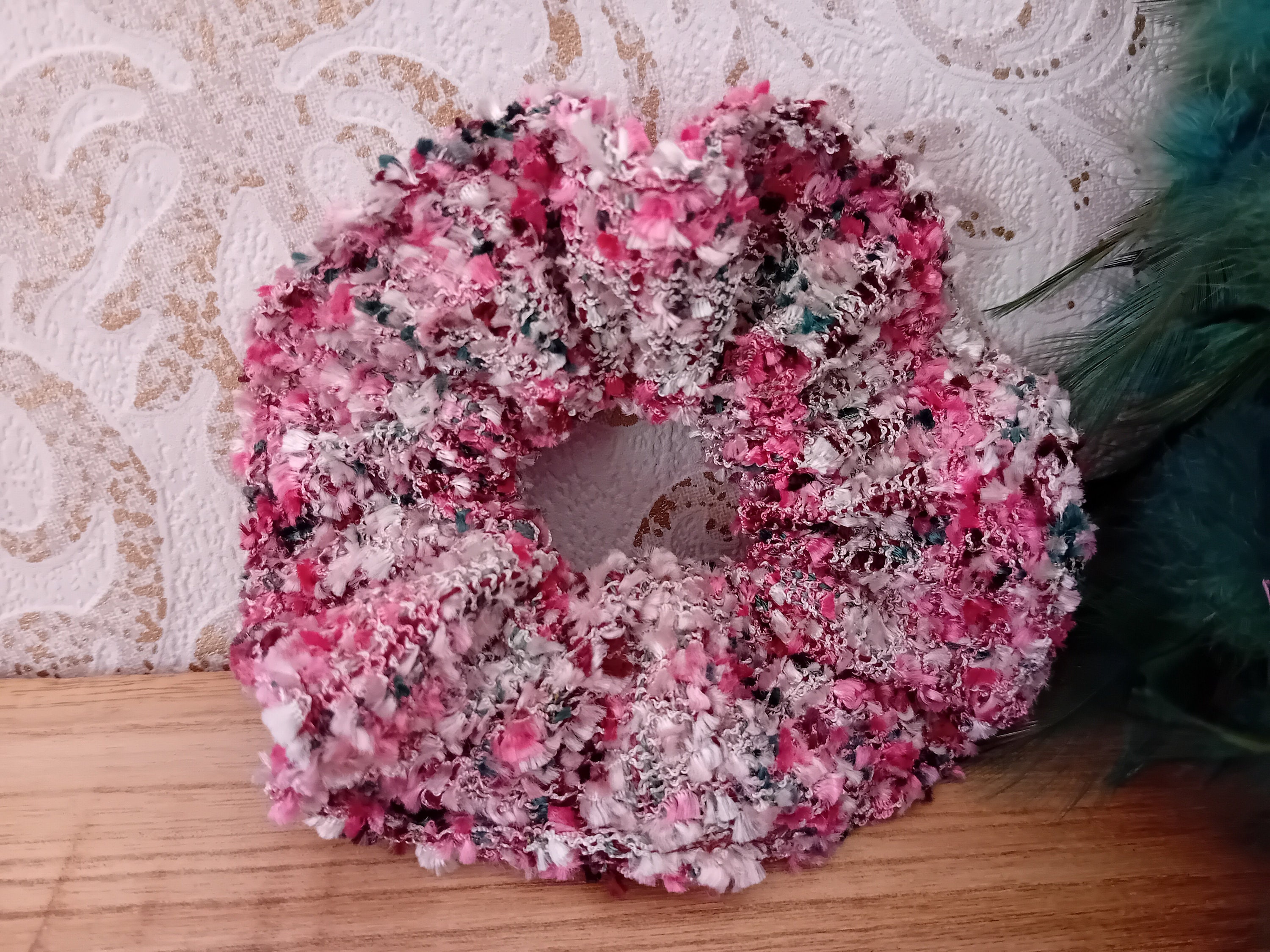 This scrunchie is sewn from a beautiful tweed fabric. It features an elastic band inside (length 19 cm).