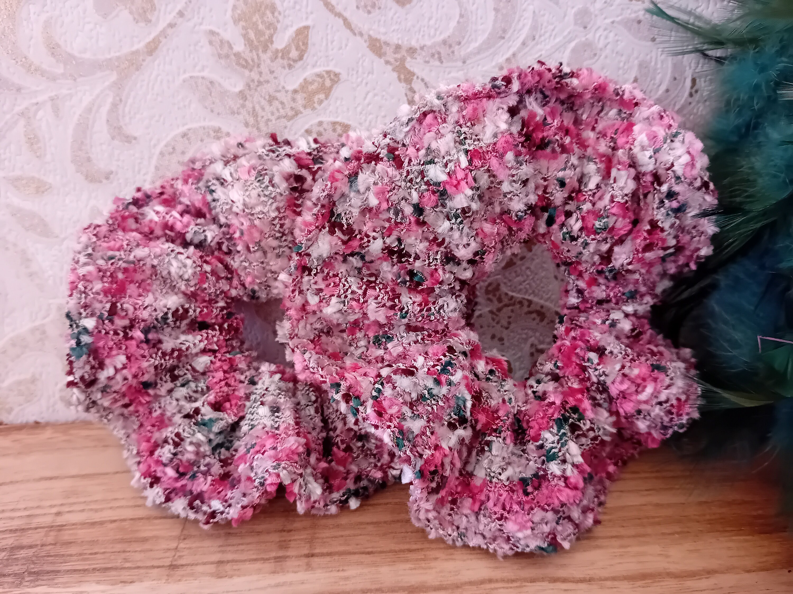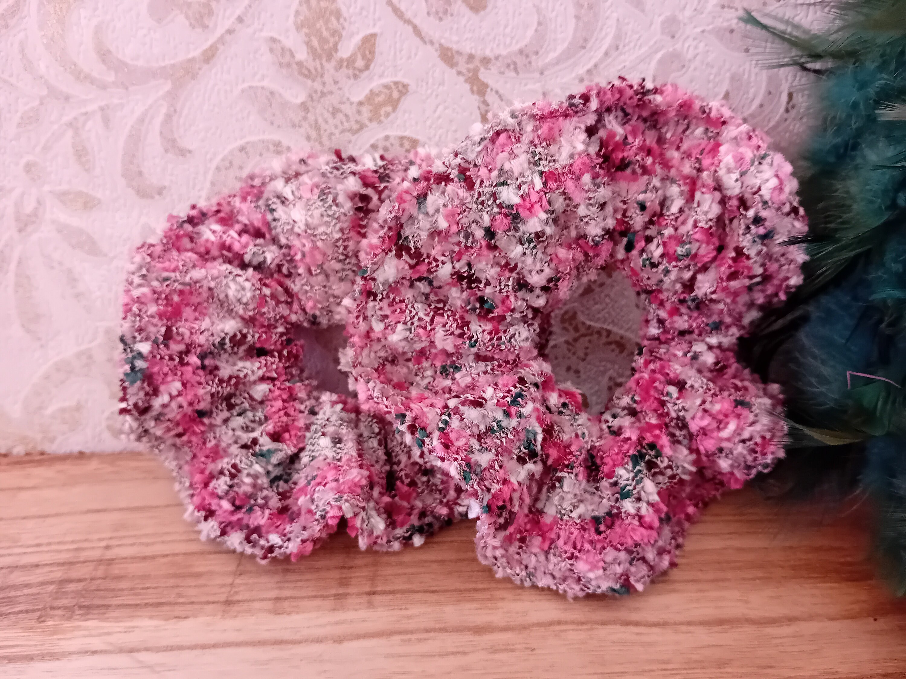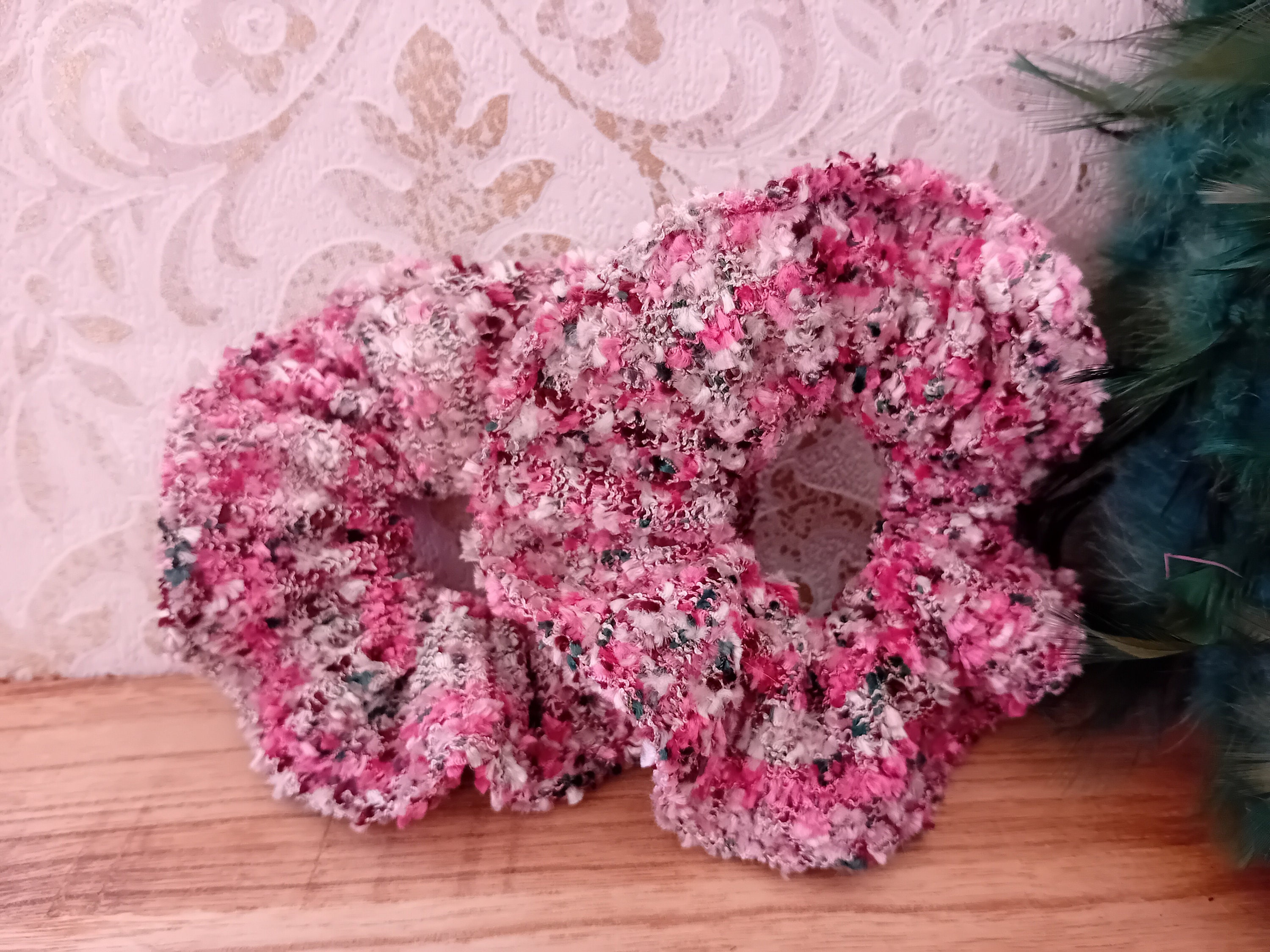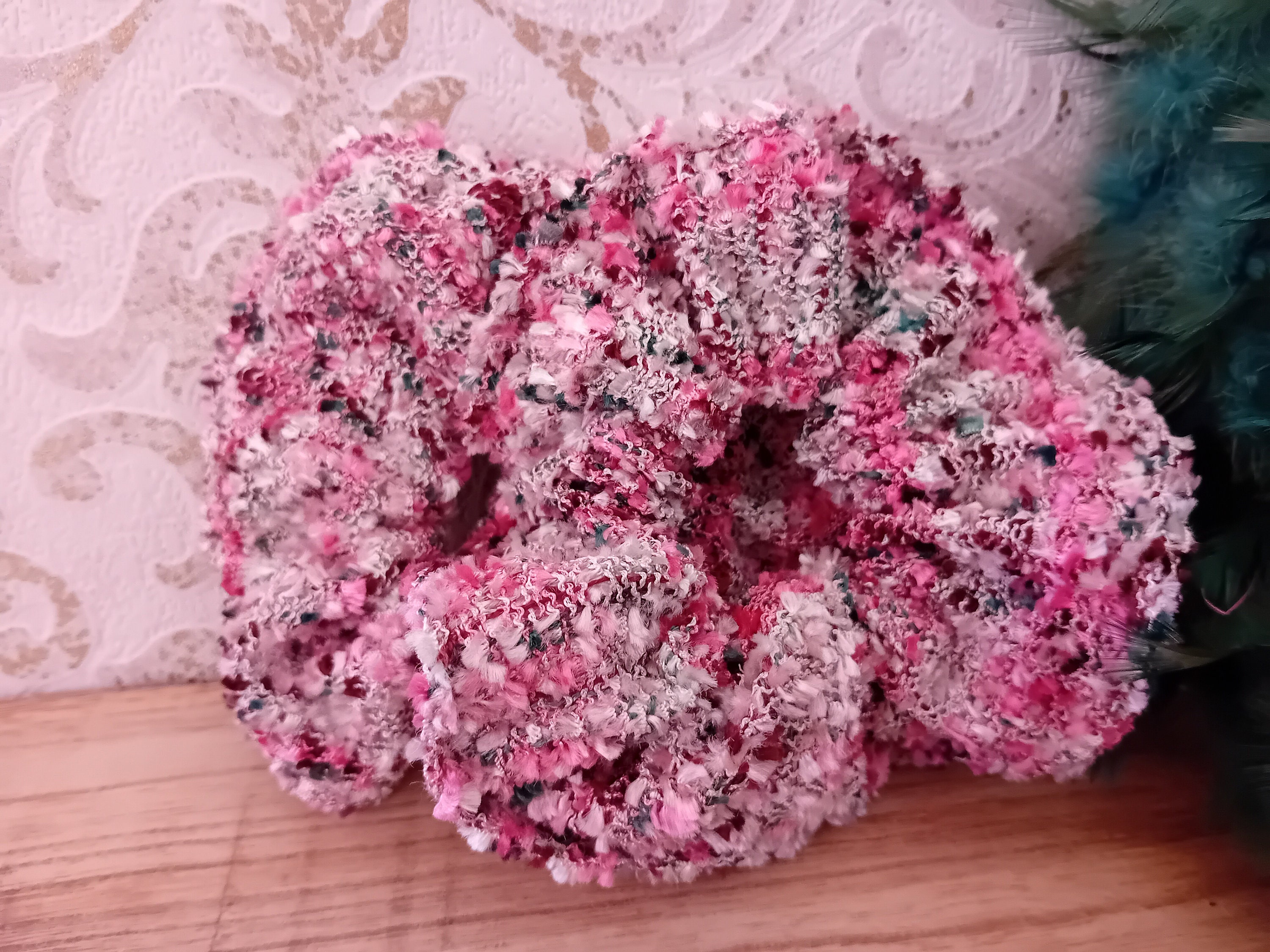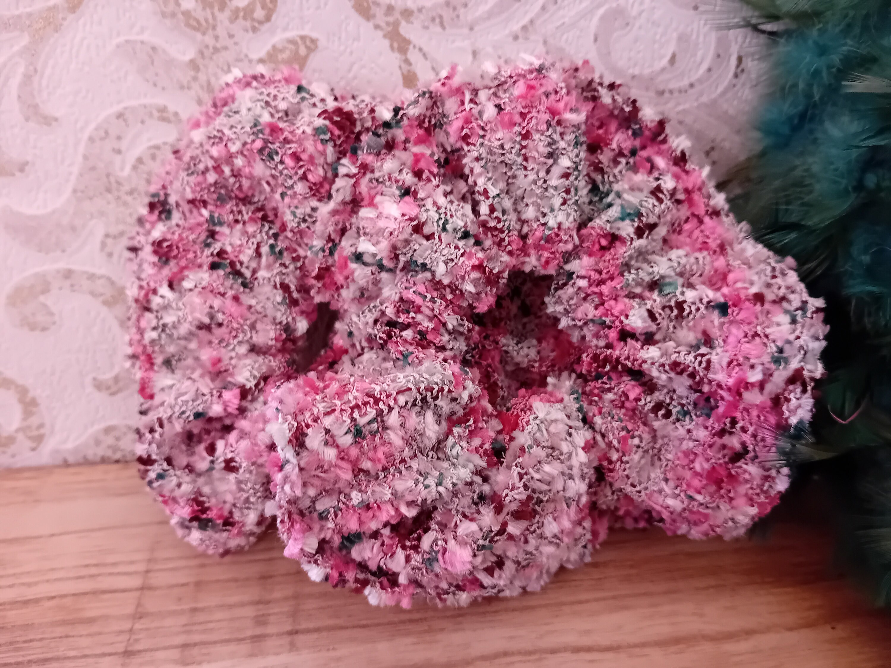 This scrunchie is sewn from a beautiful tweed fabric. It features an elastic band inside (length 19 cm).