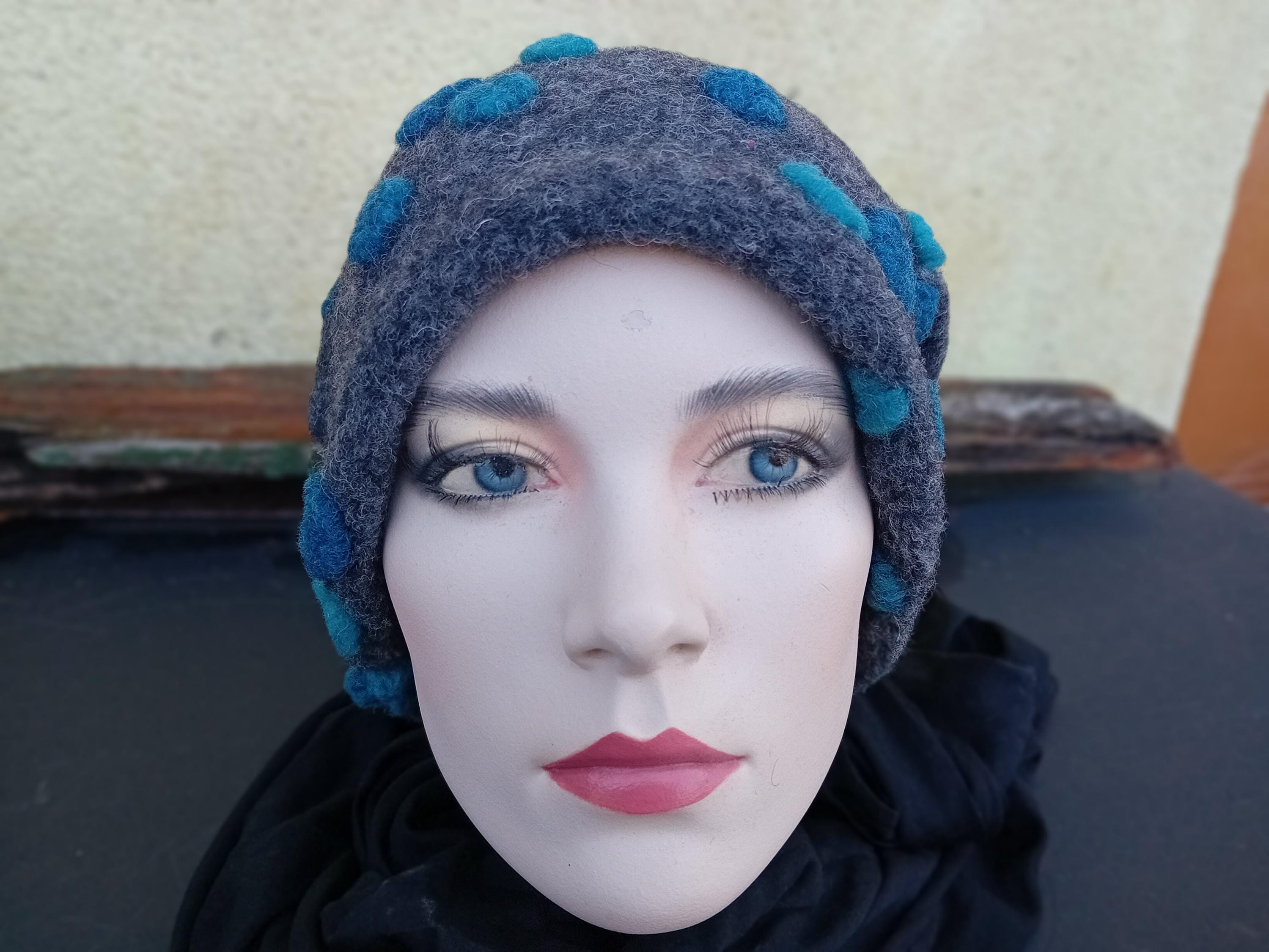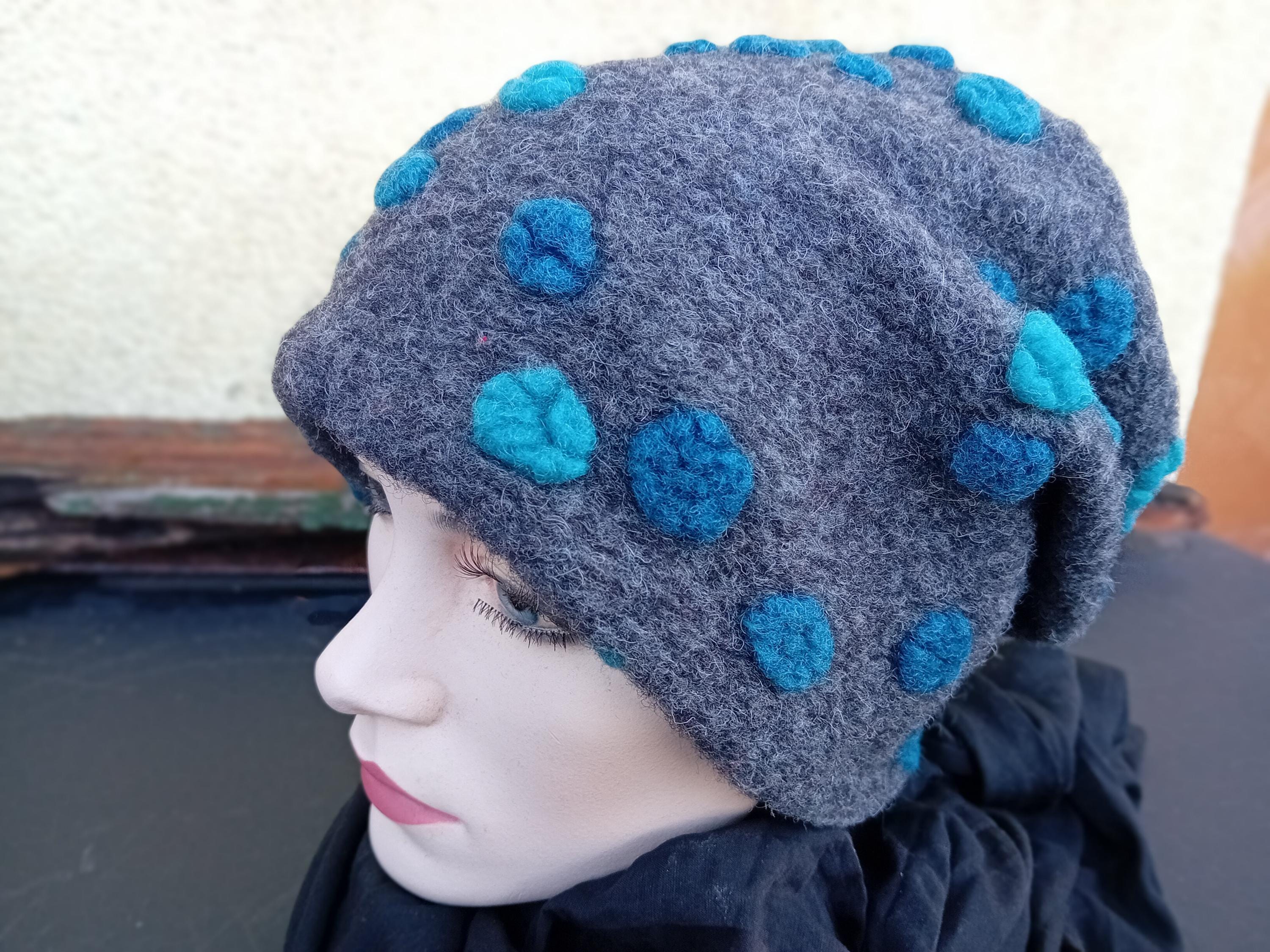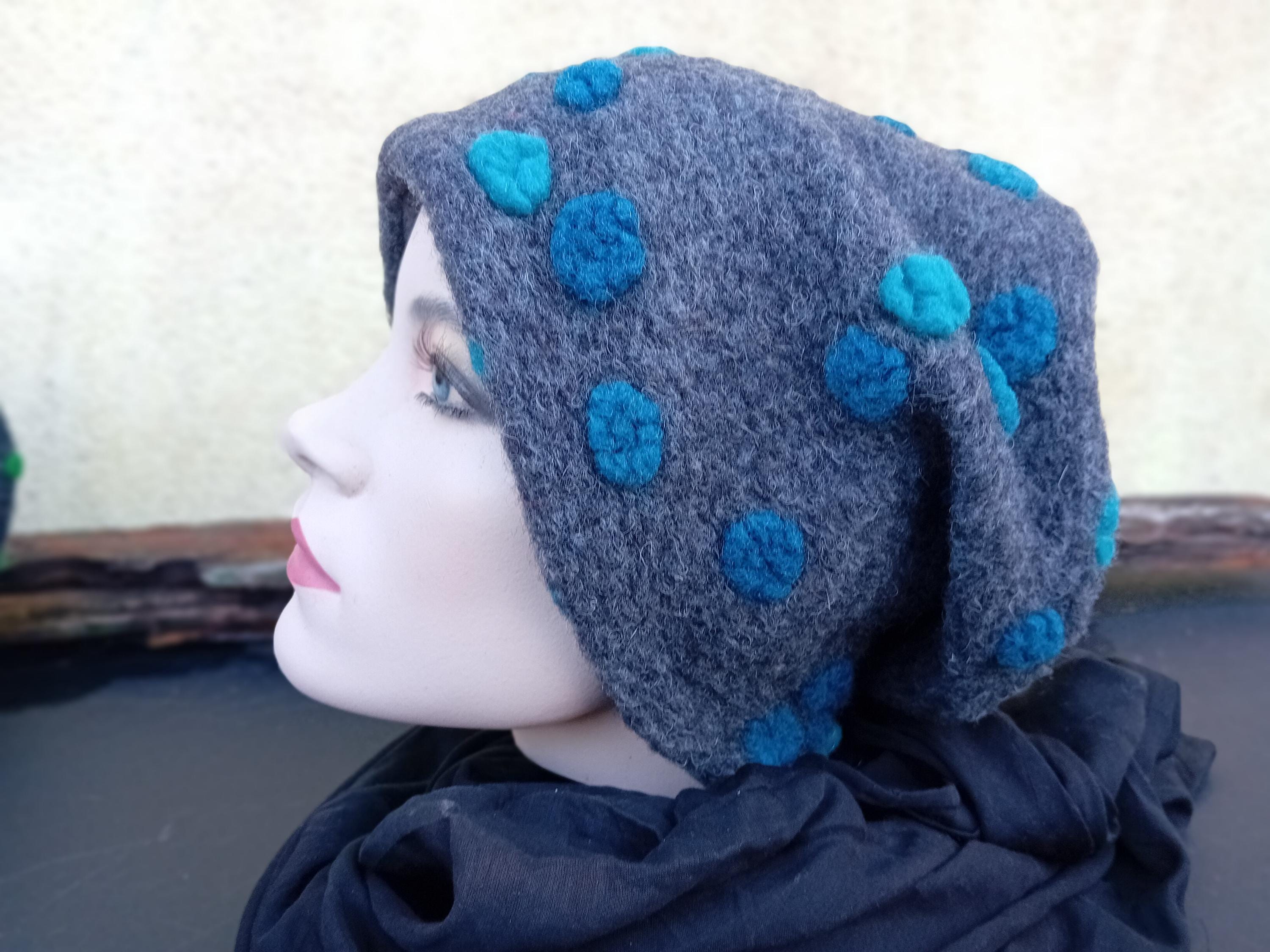 Wool hat beanie wool dotted grey blue turquoise warm lined with fleece cuddly