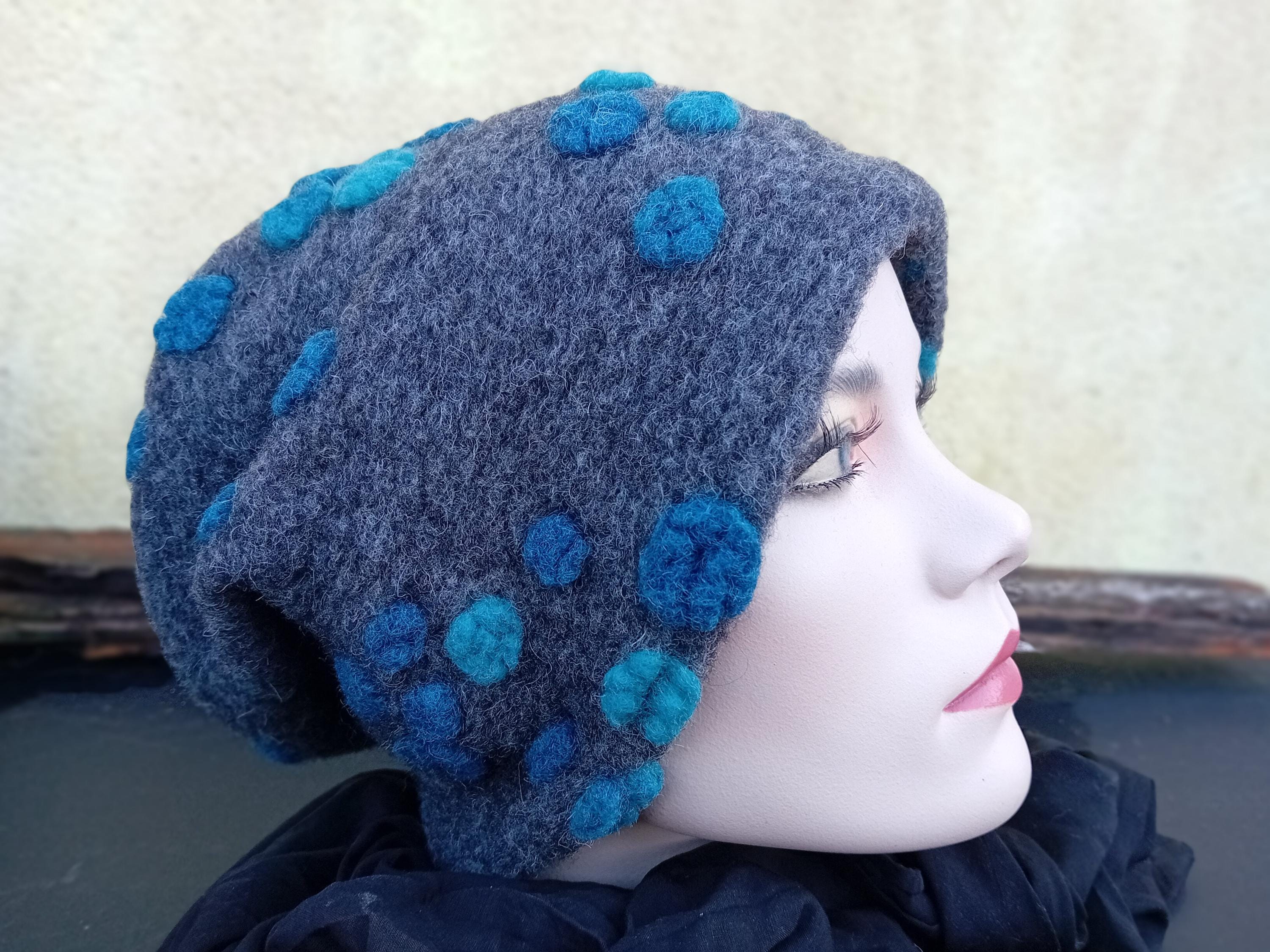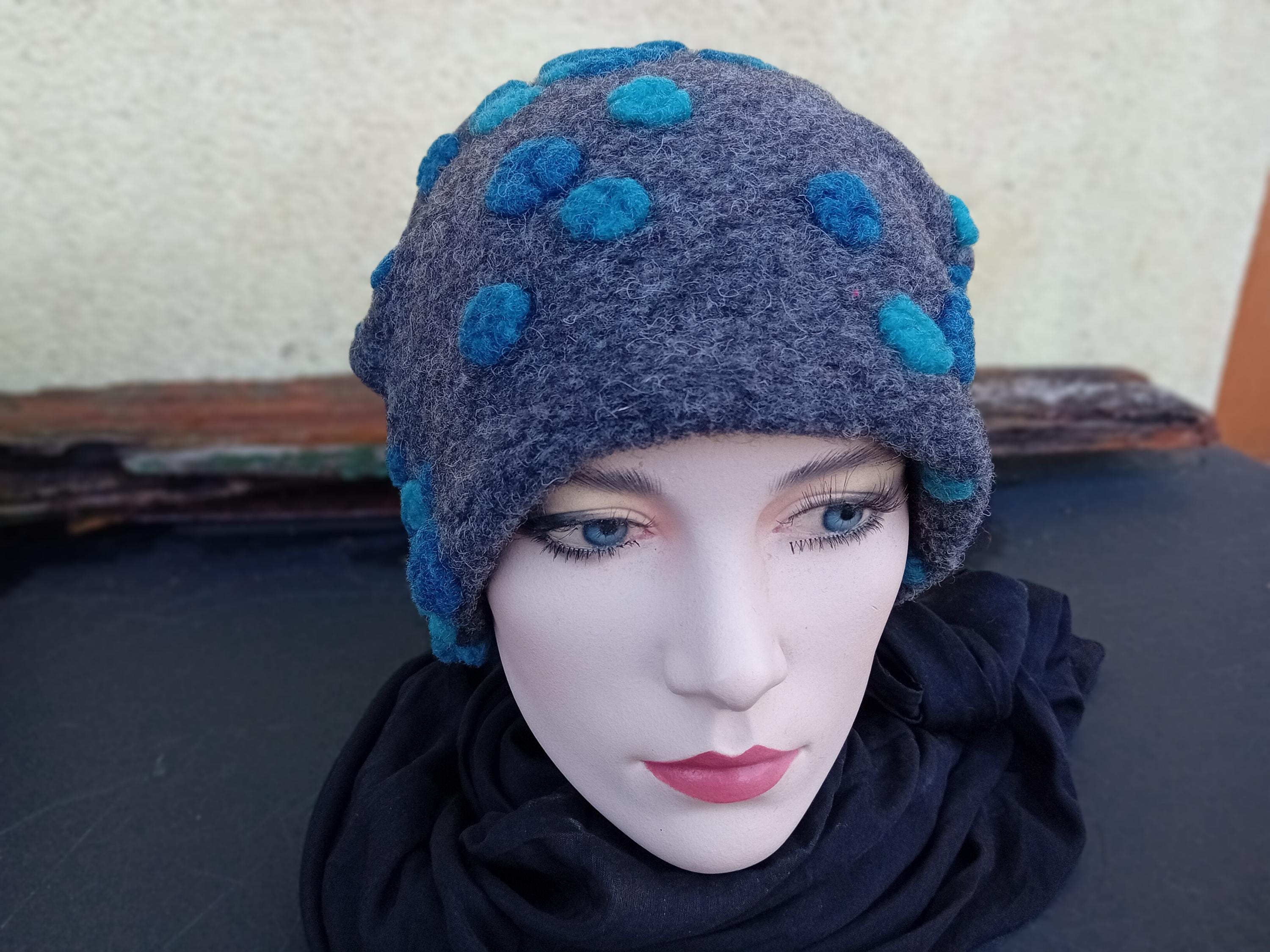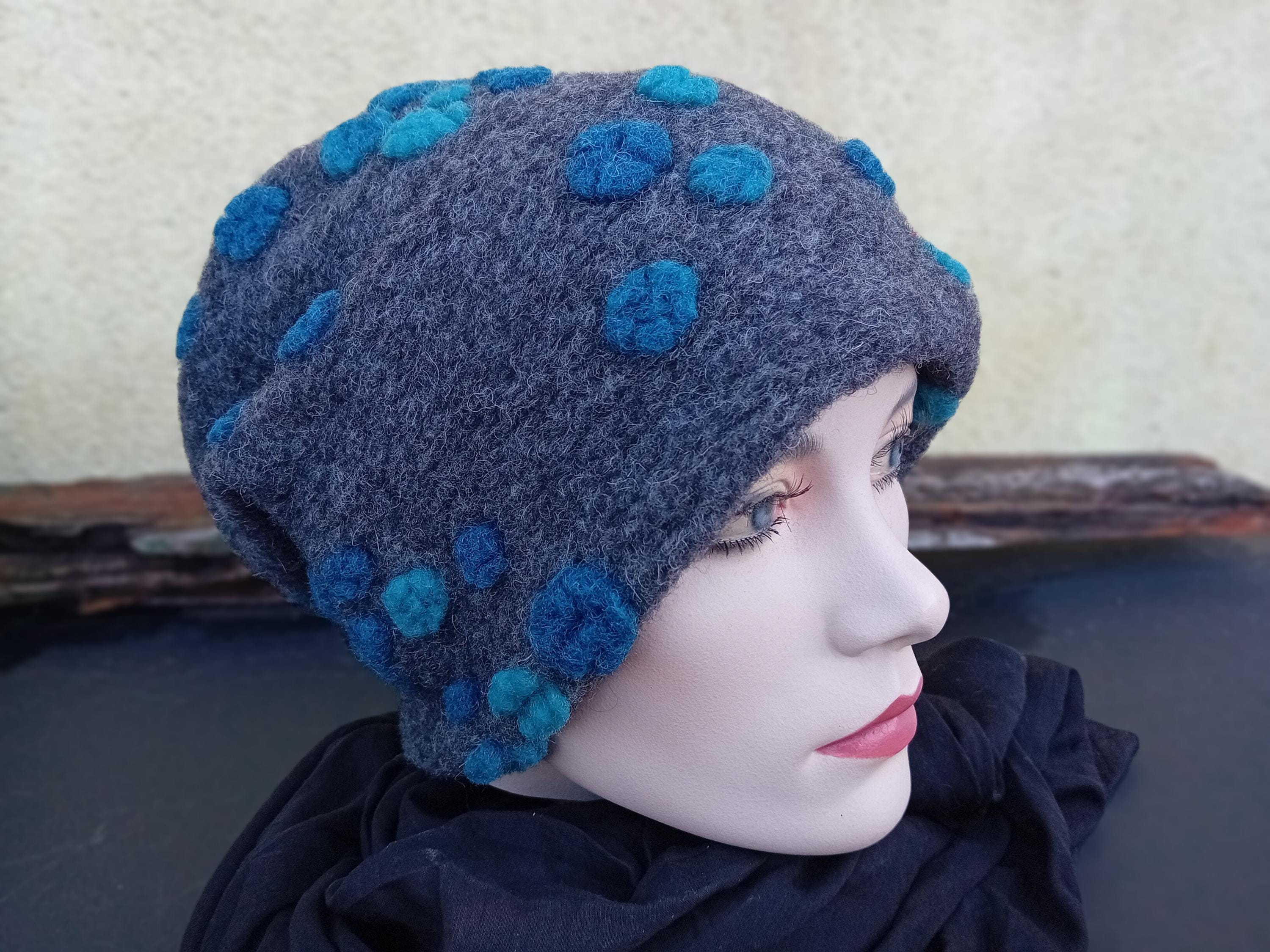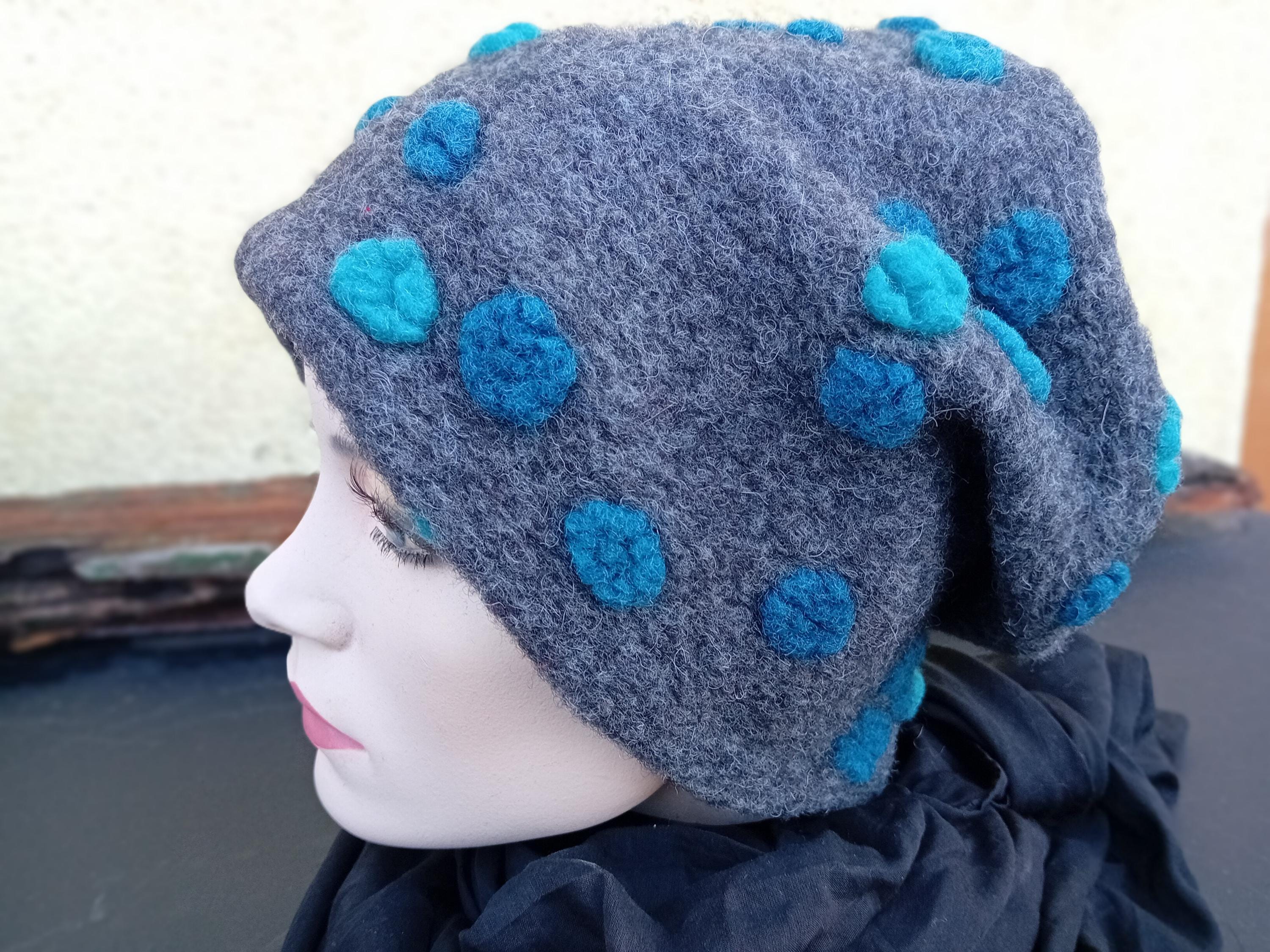 Wool hat beanie wool dotted grey blue turquoise warm lined with fleece cuddly