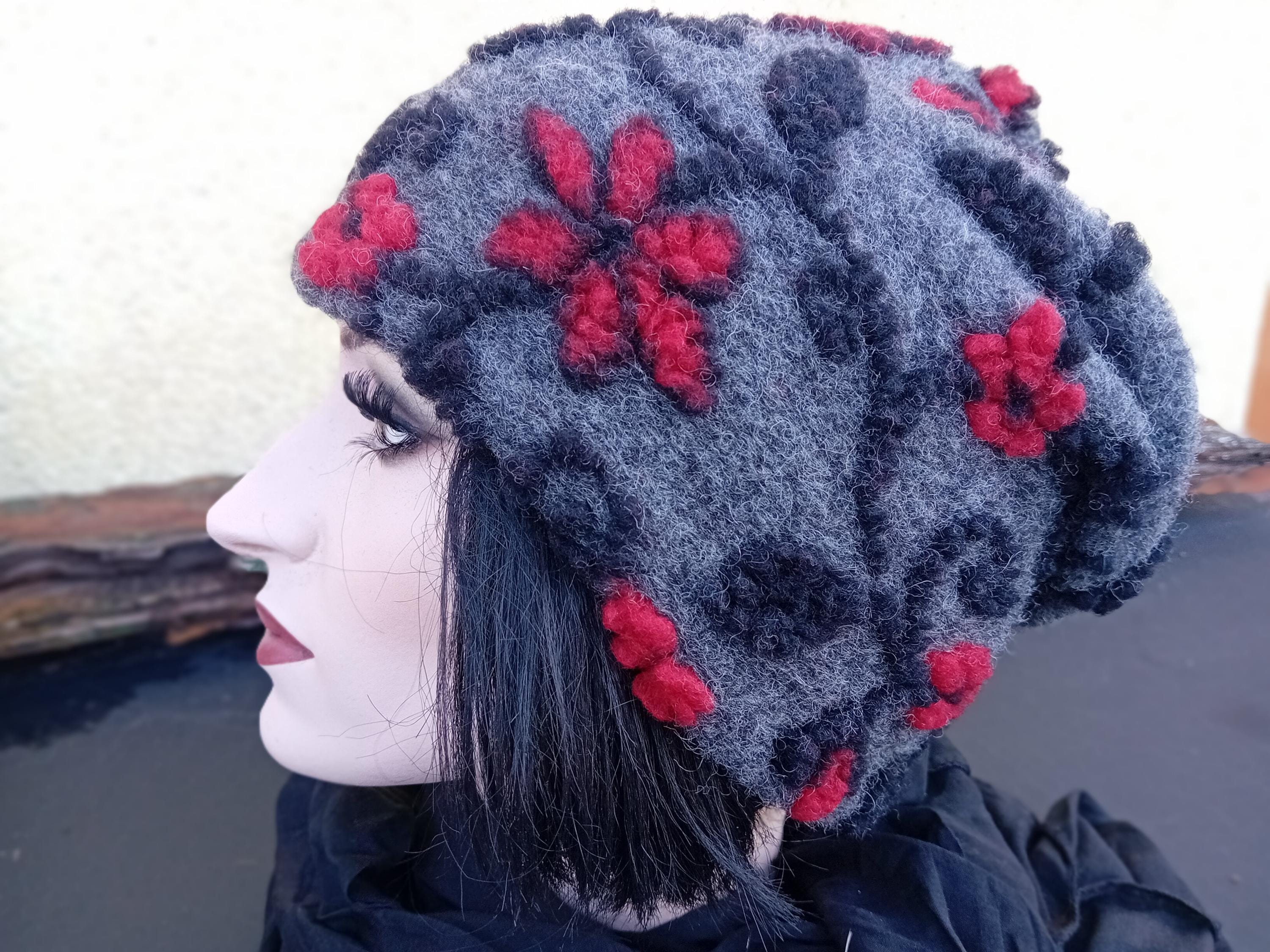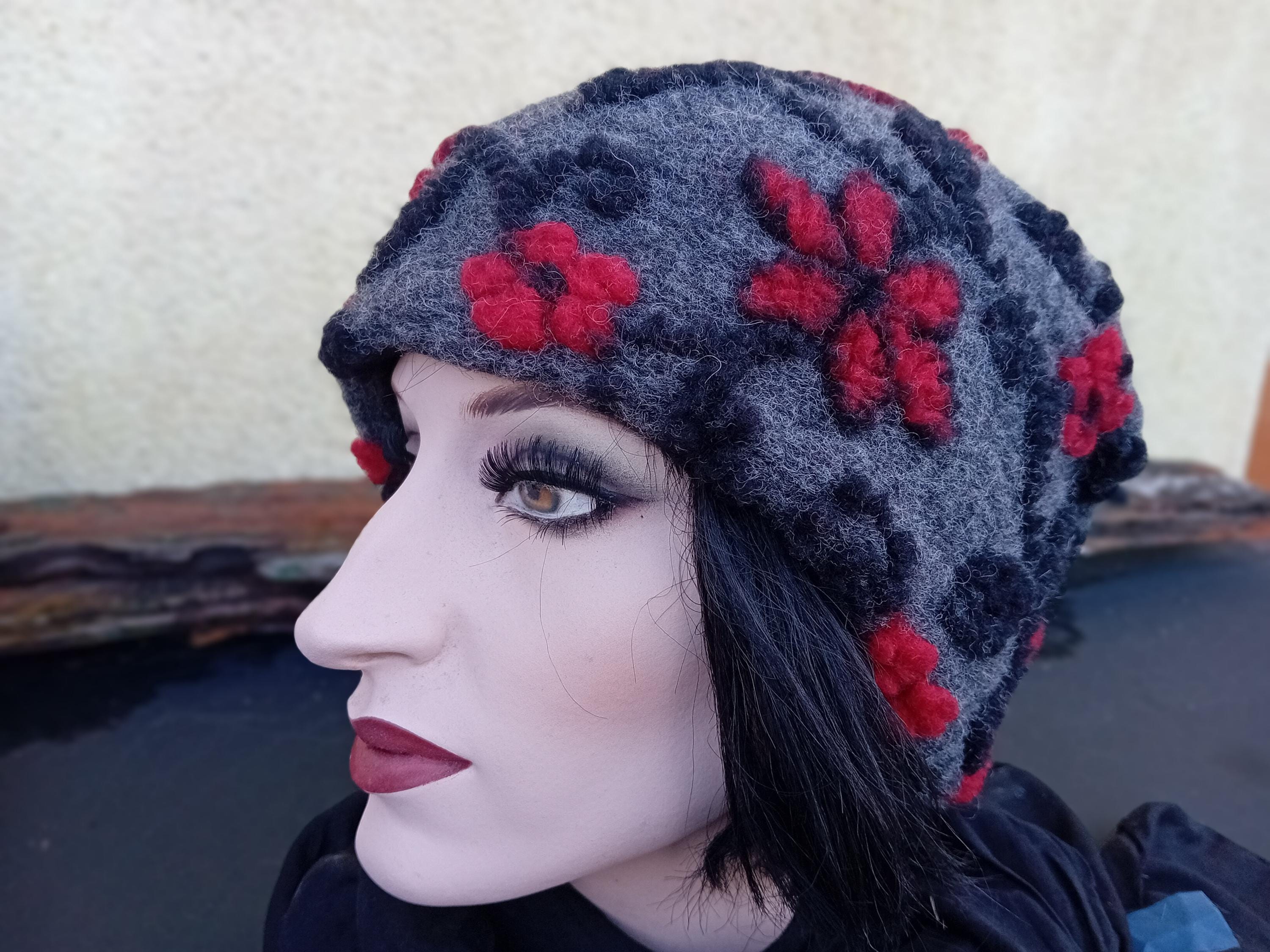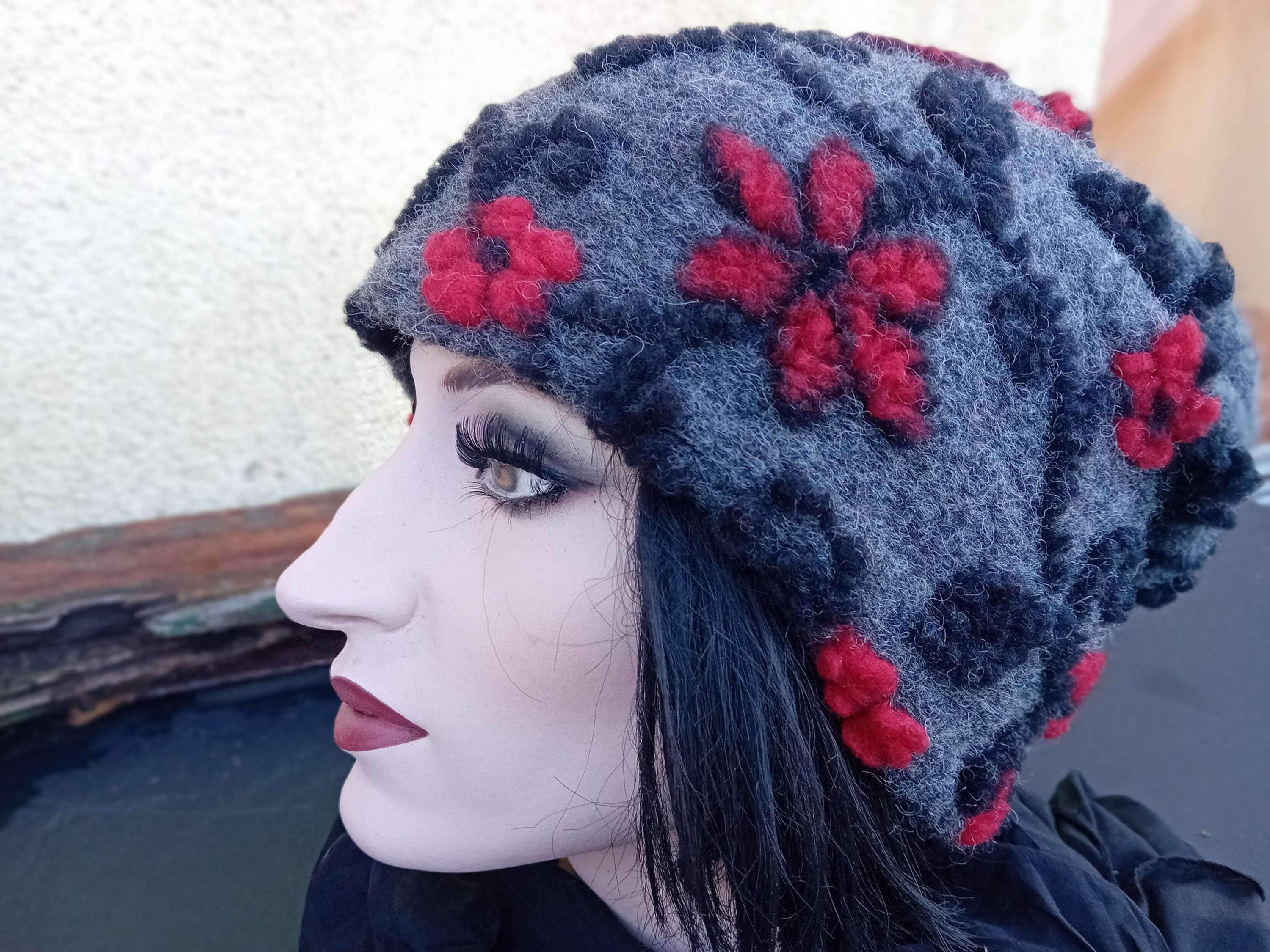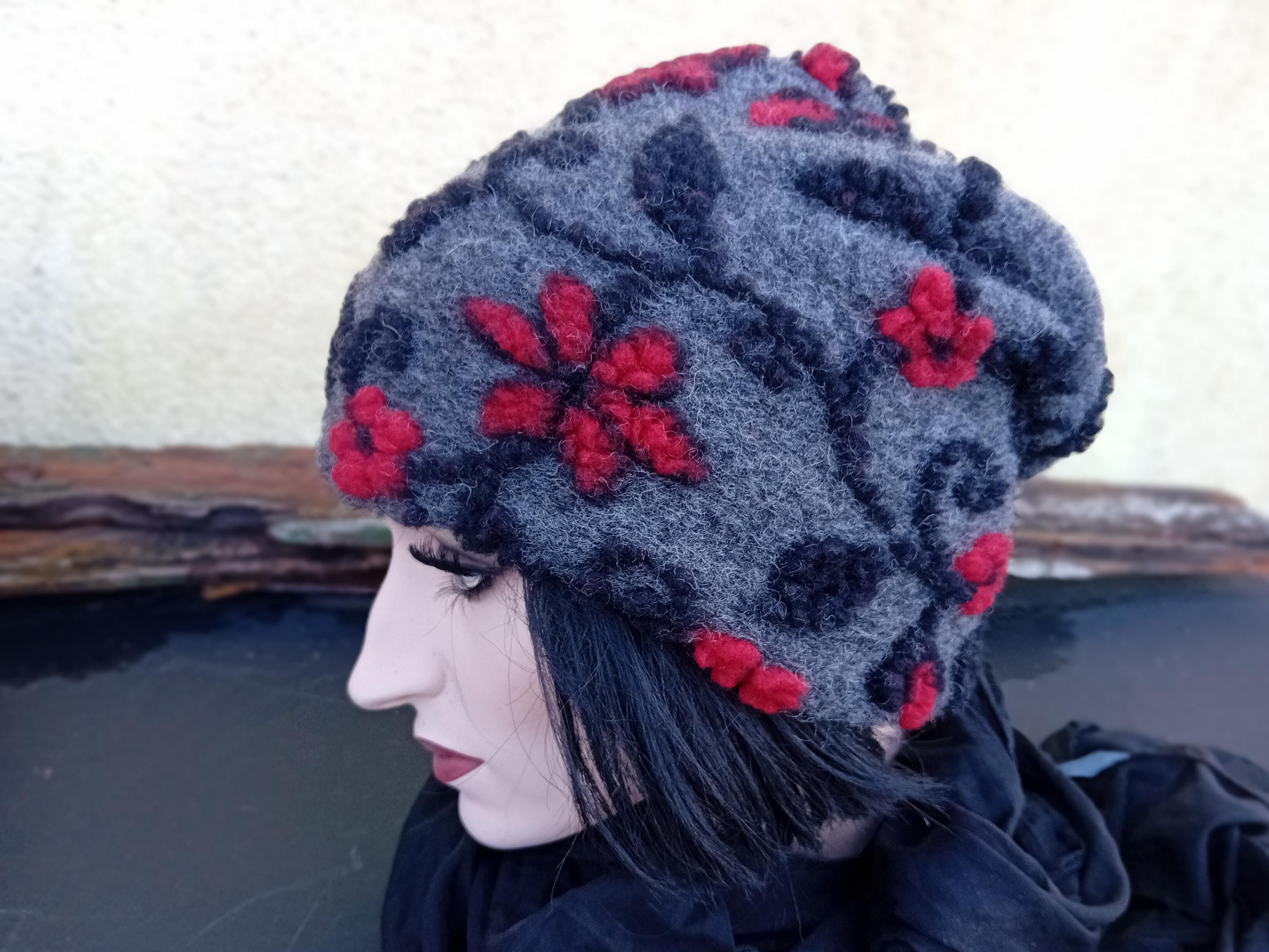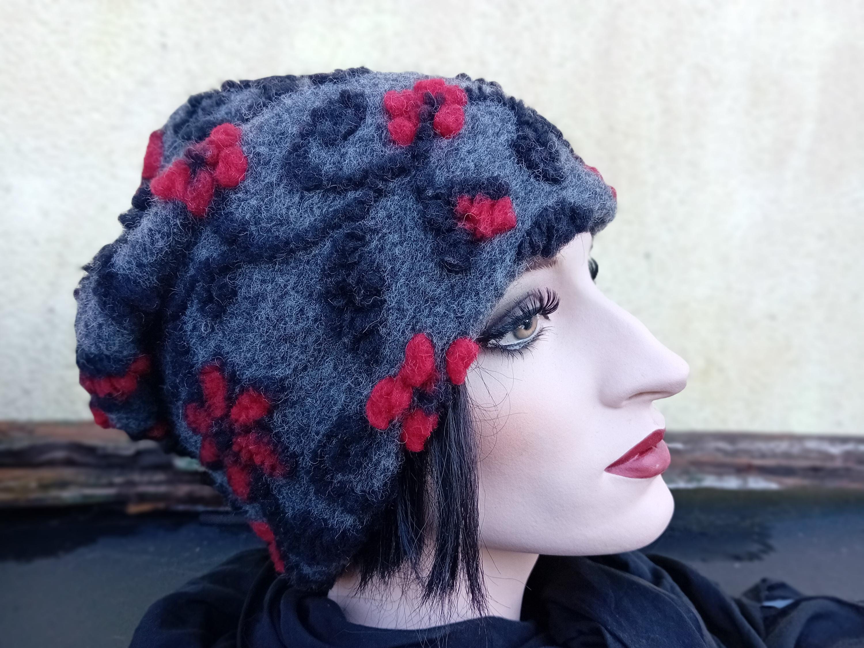 Wool hat beanie wool floral with tendrils dark grey red black warm lined with fleece cuddly