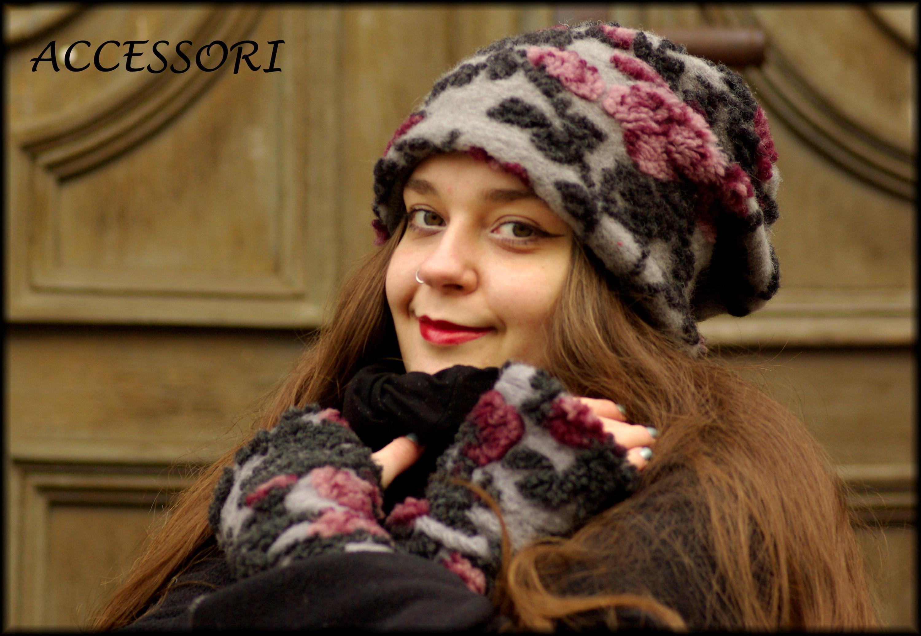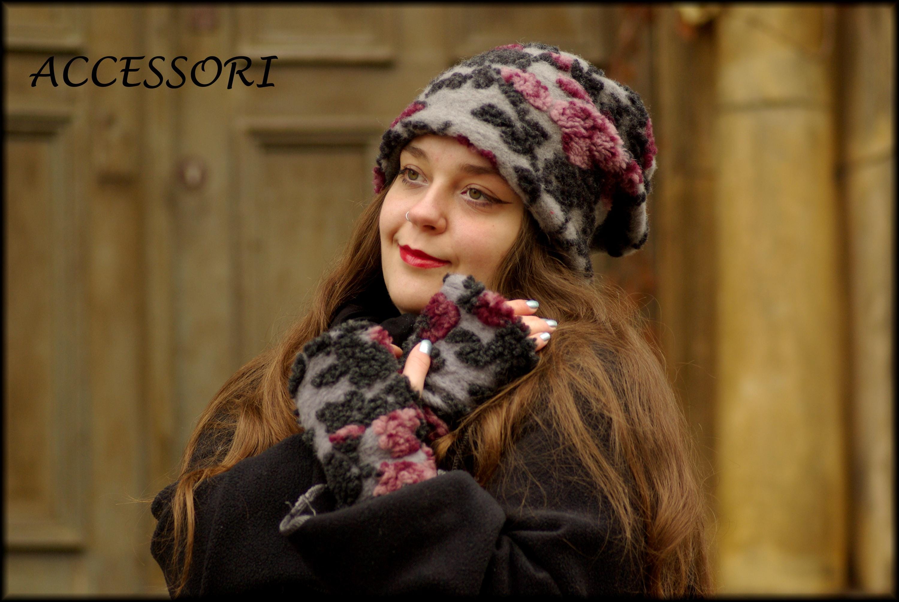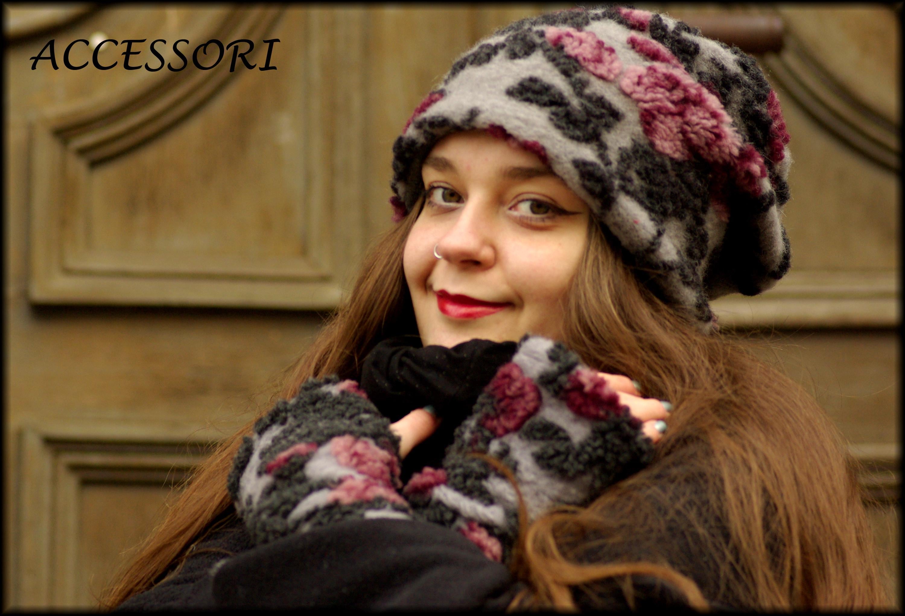 Wool leg warmers, beanie, floral pattern, grey and pink, warm fleece lining, cozy