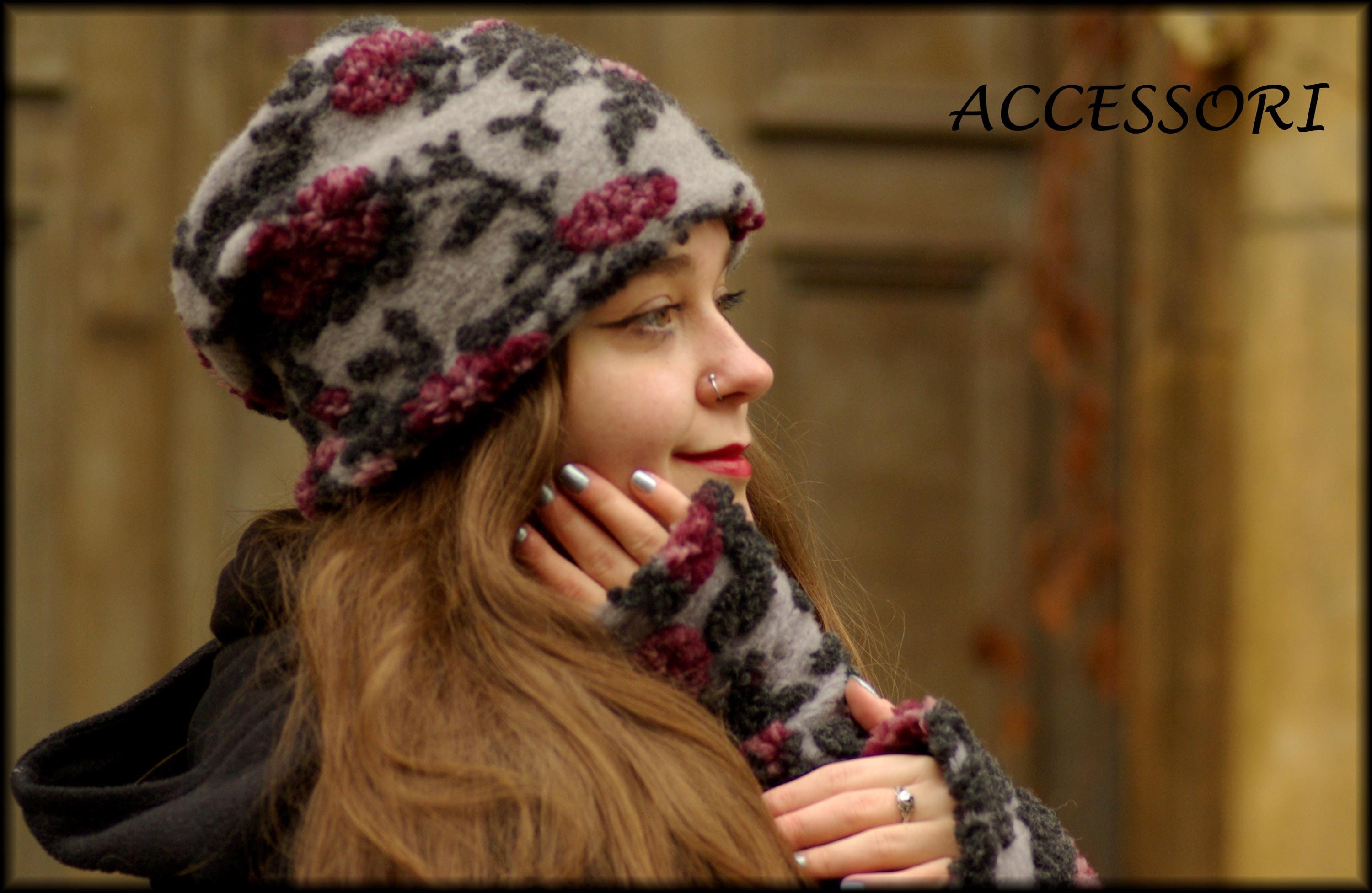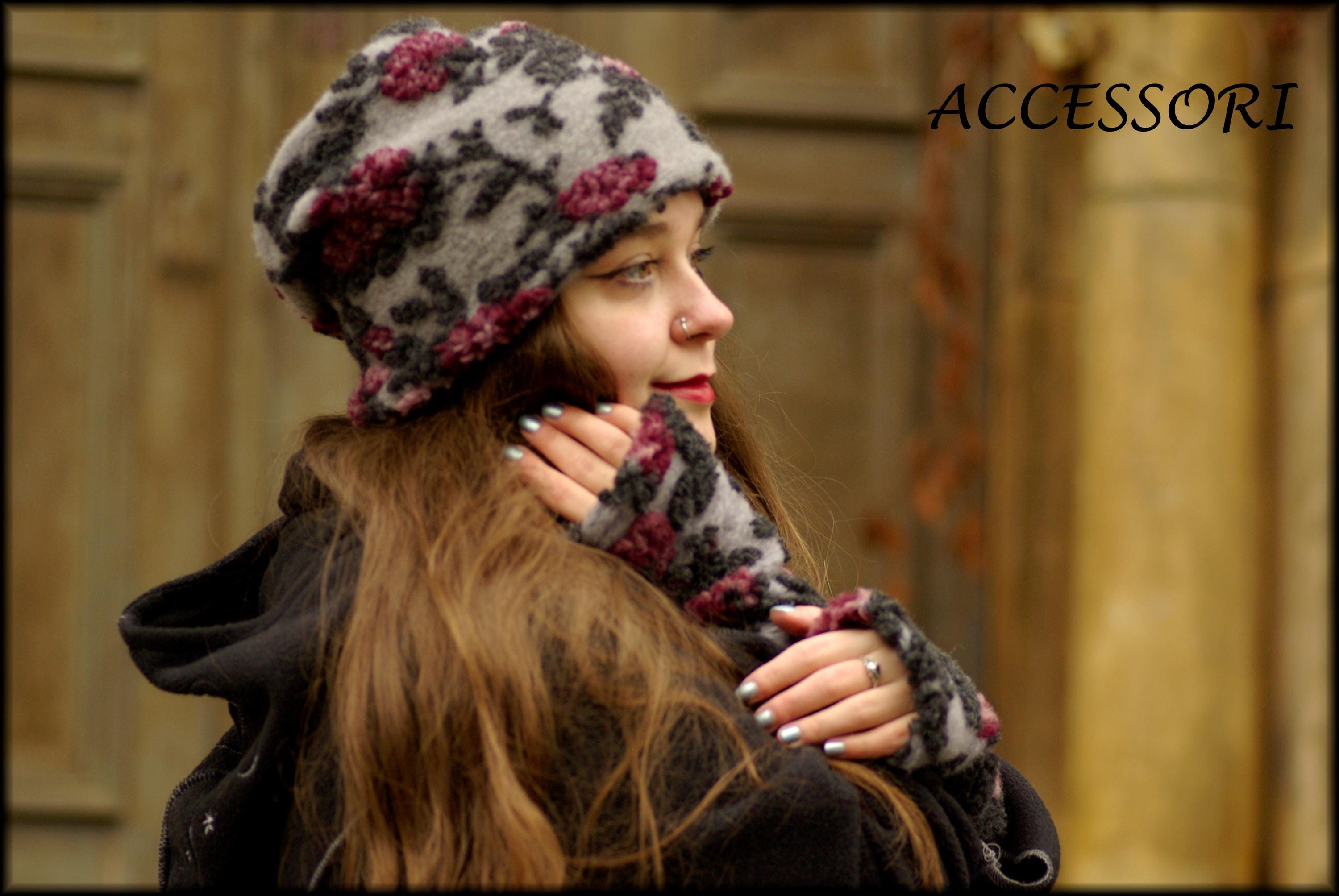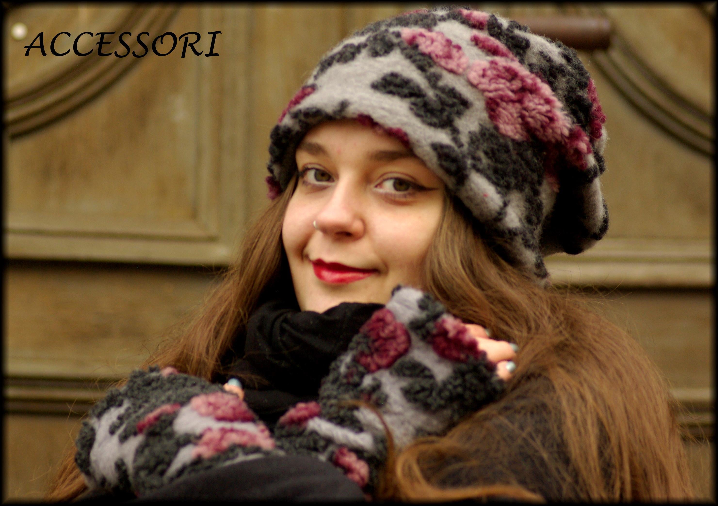Wool leg warmers, beanie, floral pattern, grey and pink, warm fleece lining, cozy
