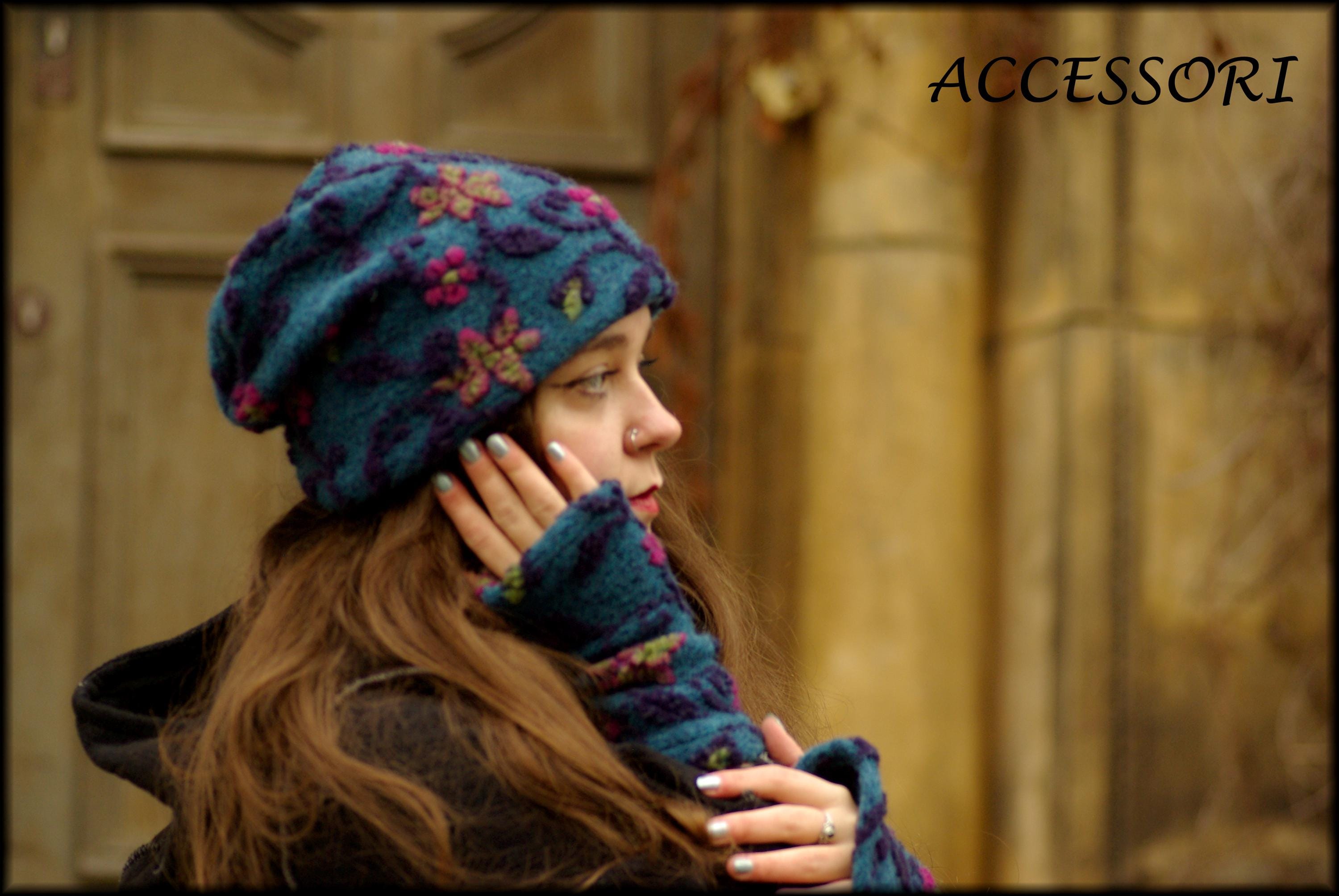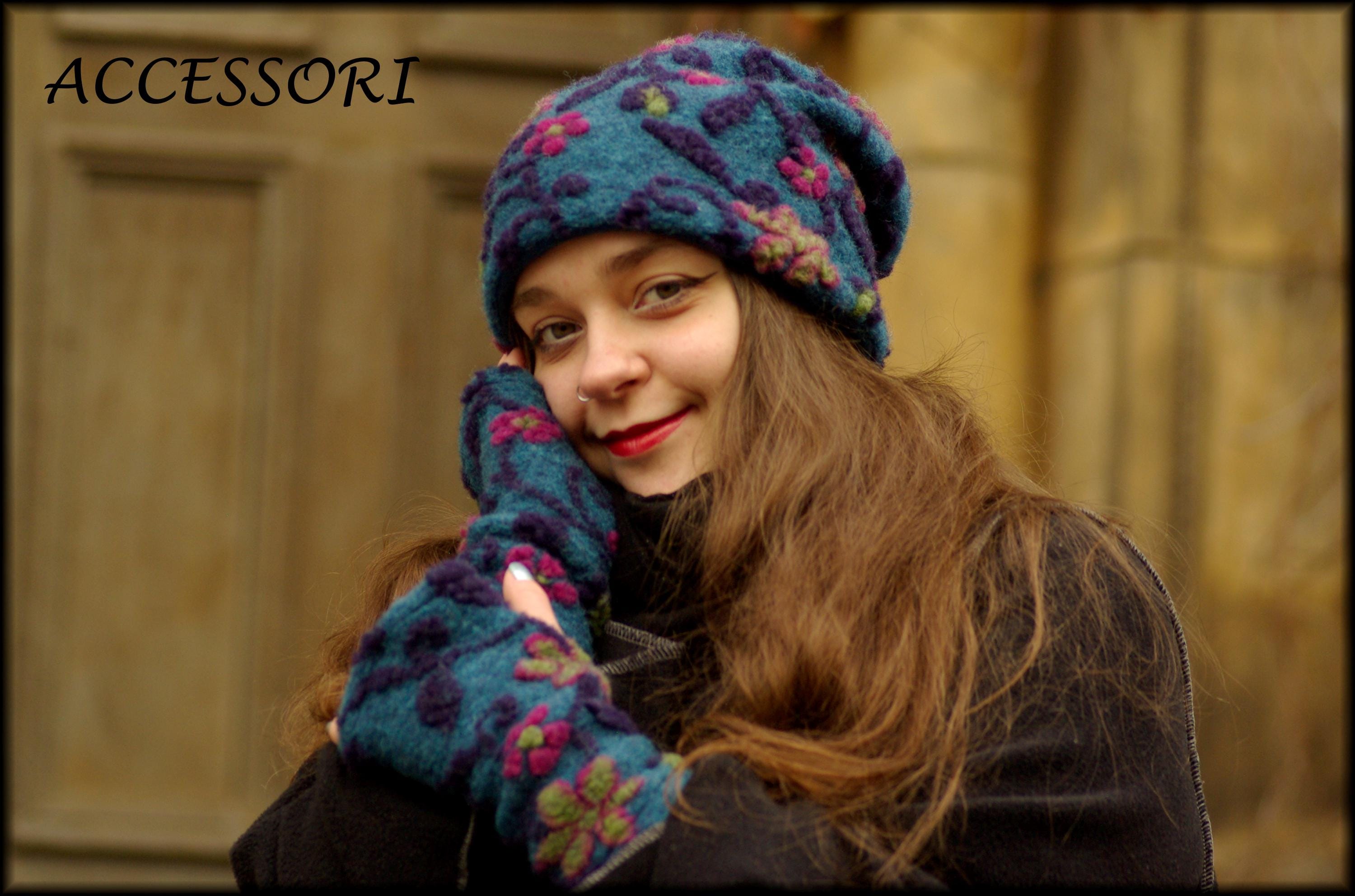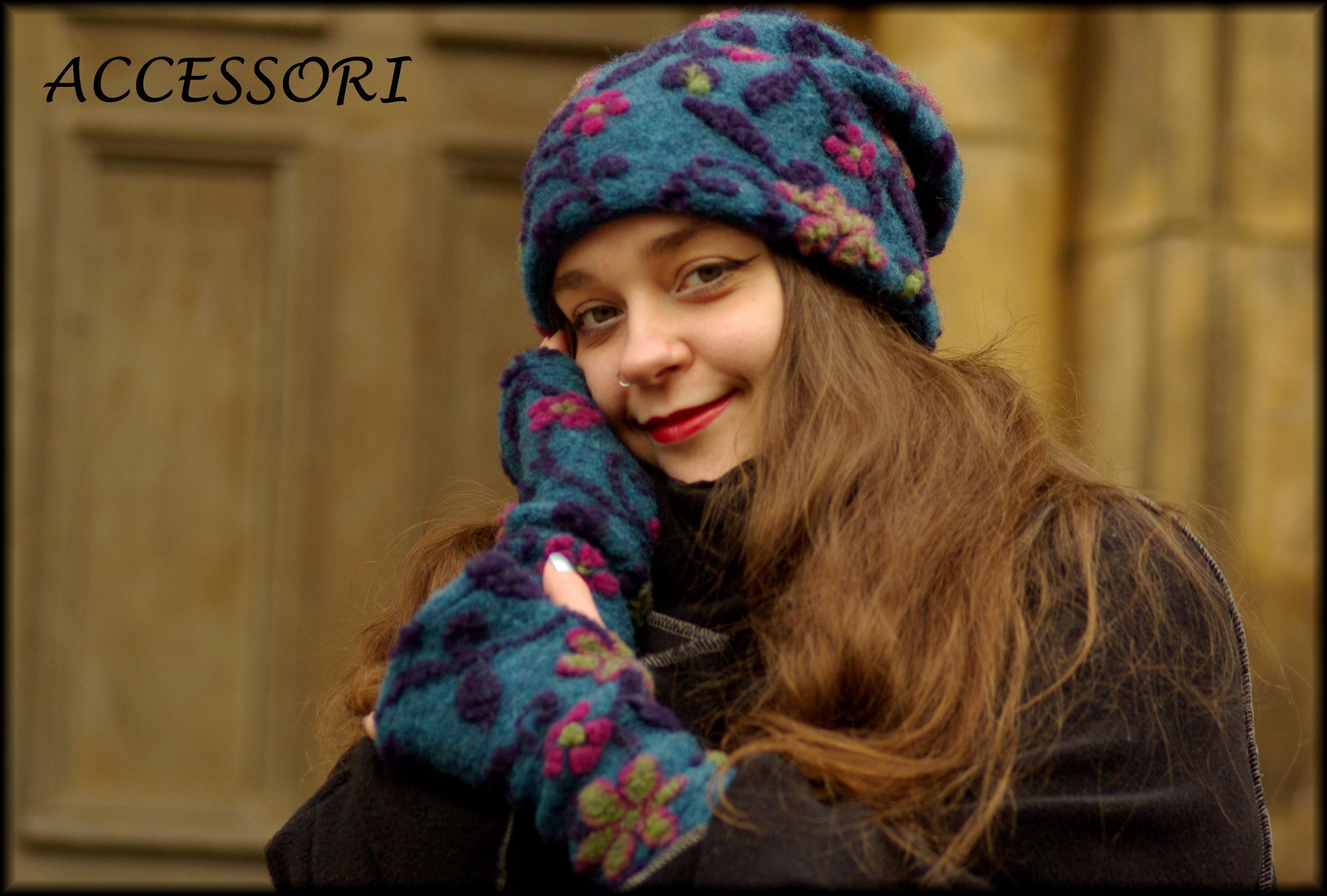 Wool hat, beanie, wool leg warmers, blue and pink floral, warmly lined with fleece, cozy
