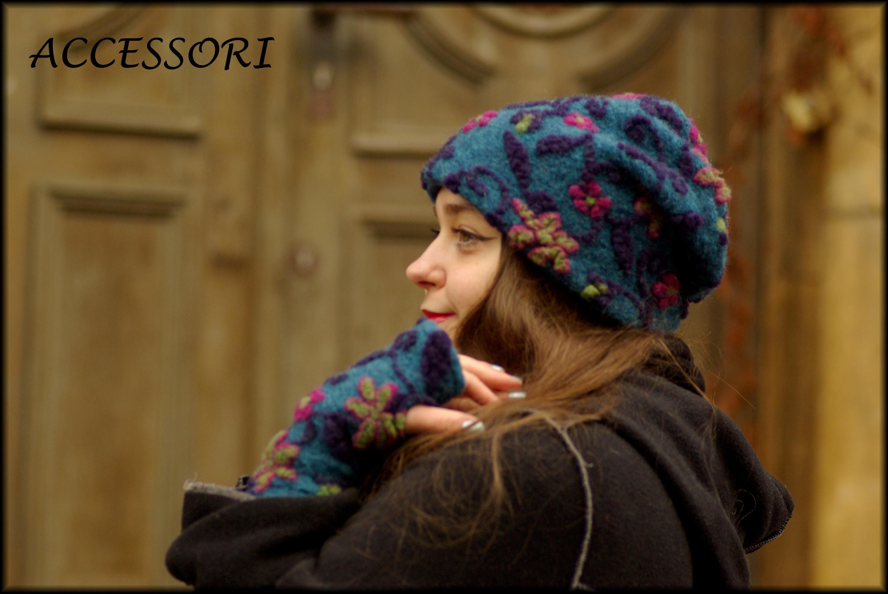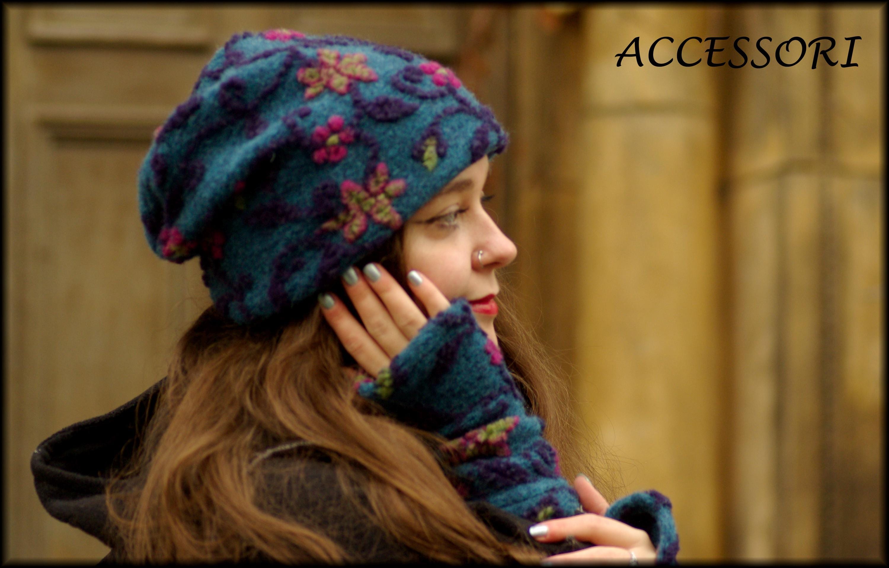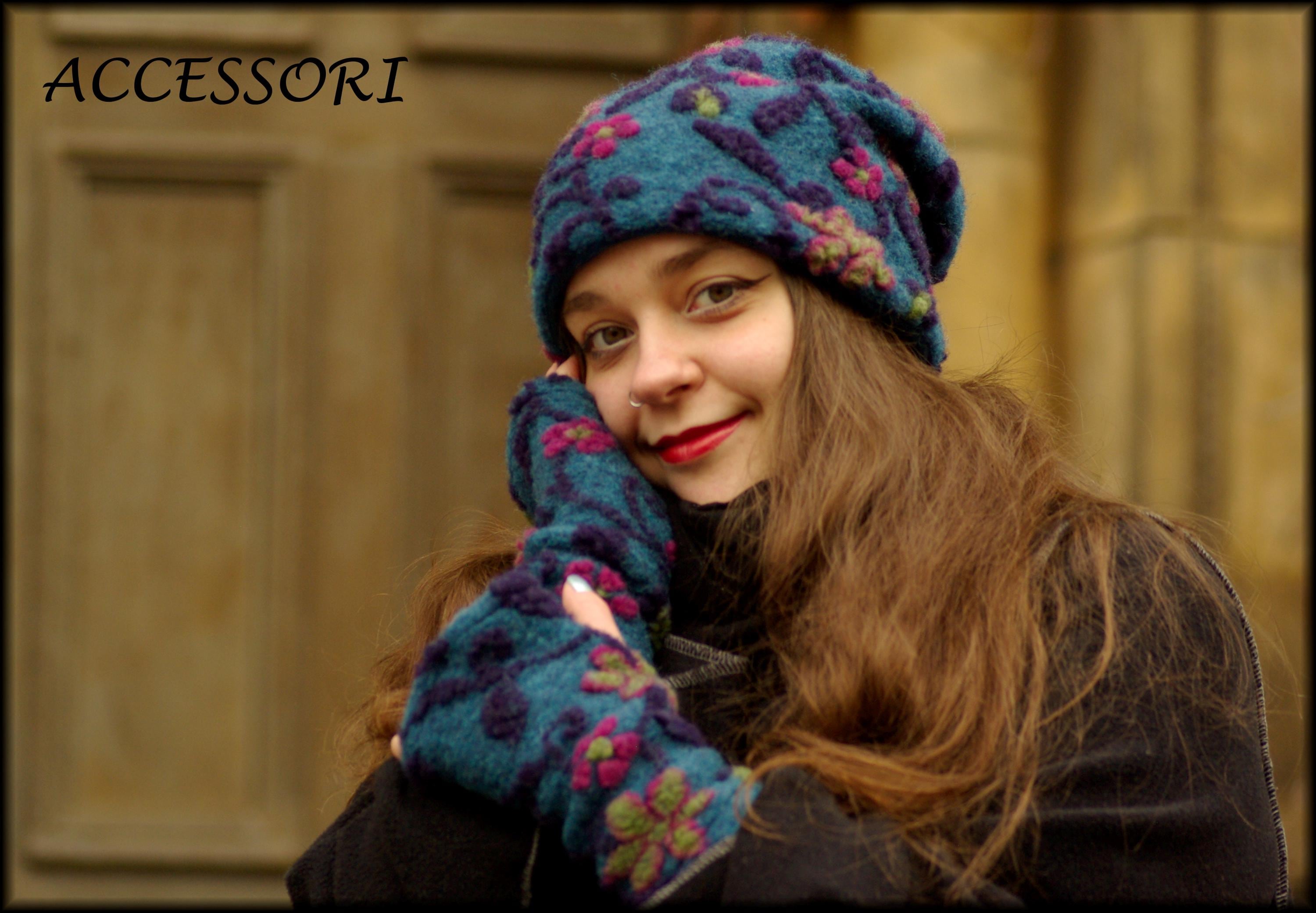 Wool hat, beanie, wool leg warmers, blue and pink floral, warmly lined with fleece, cozy