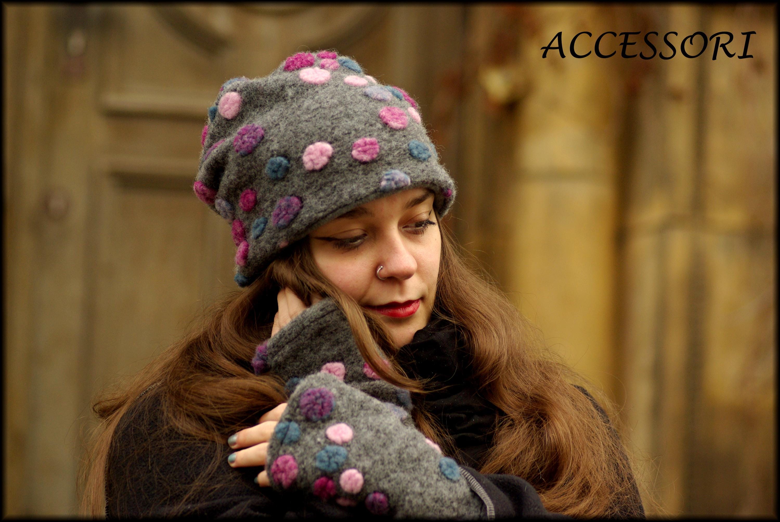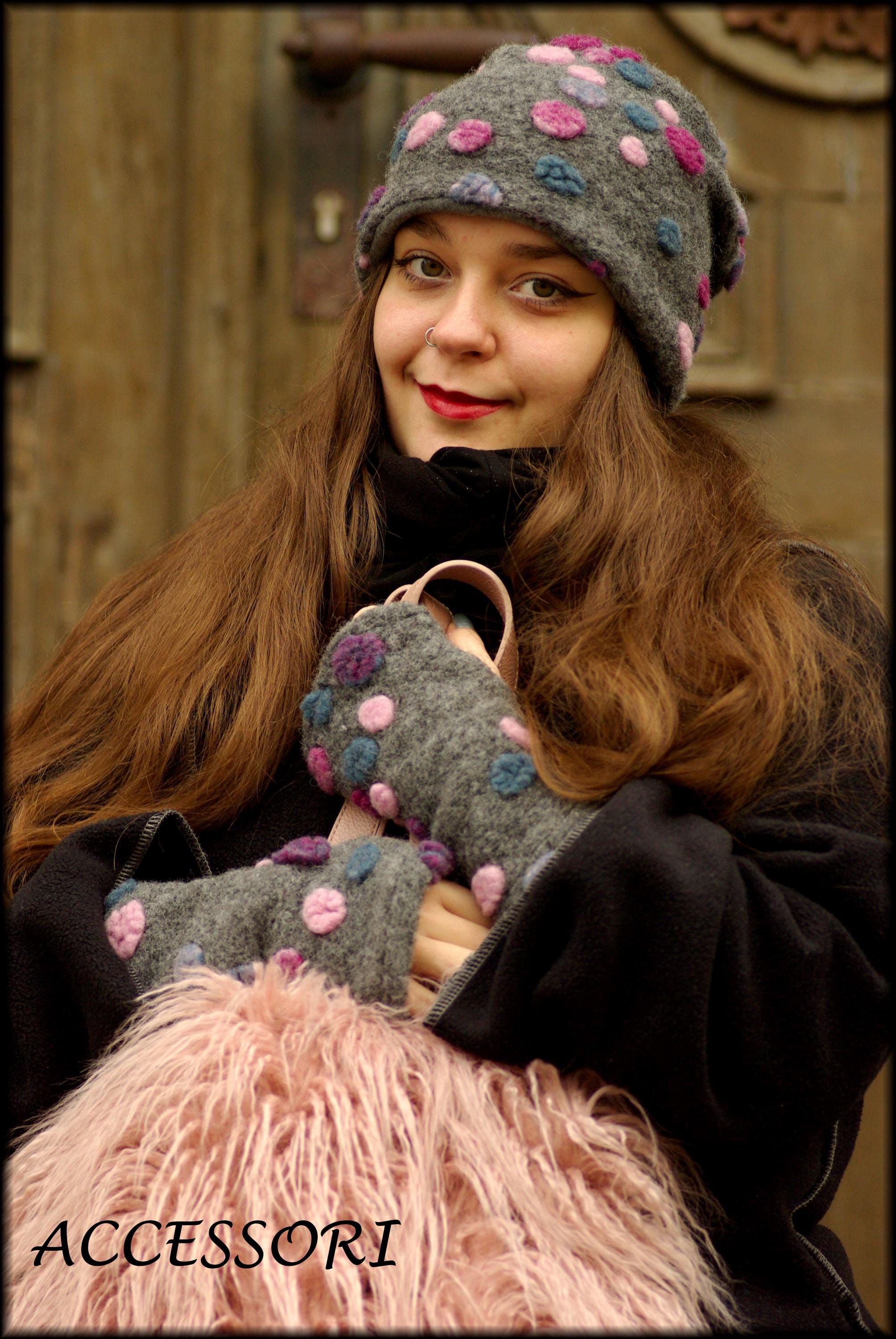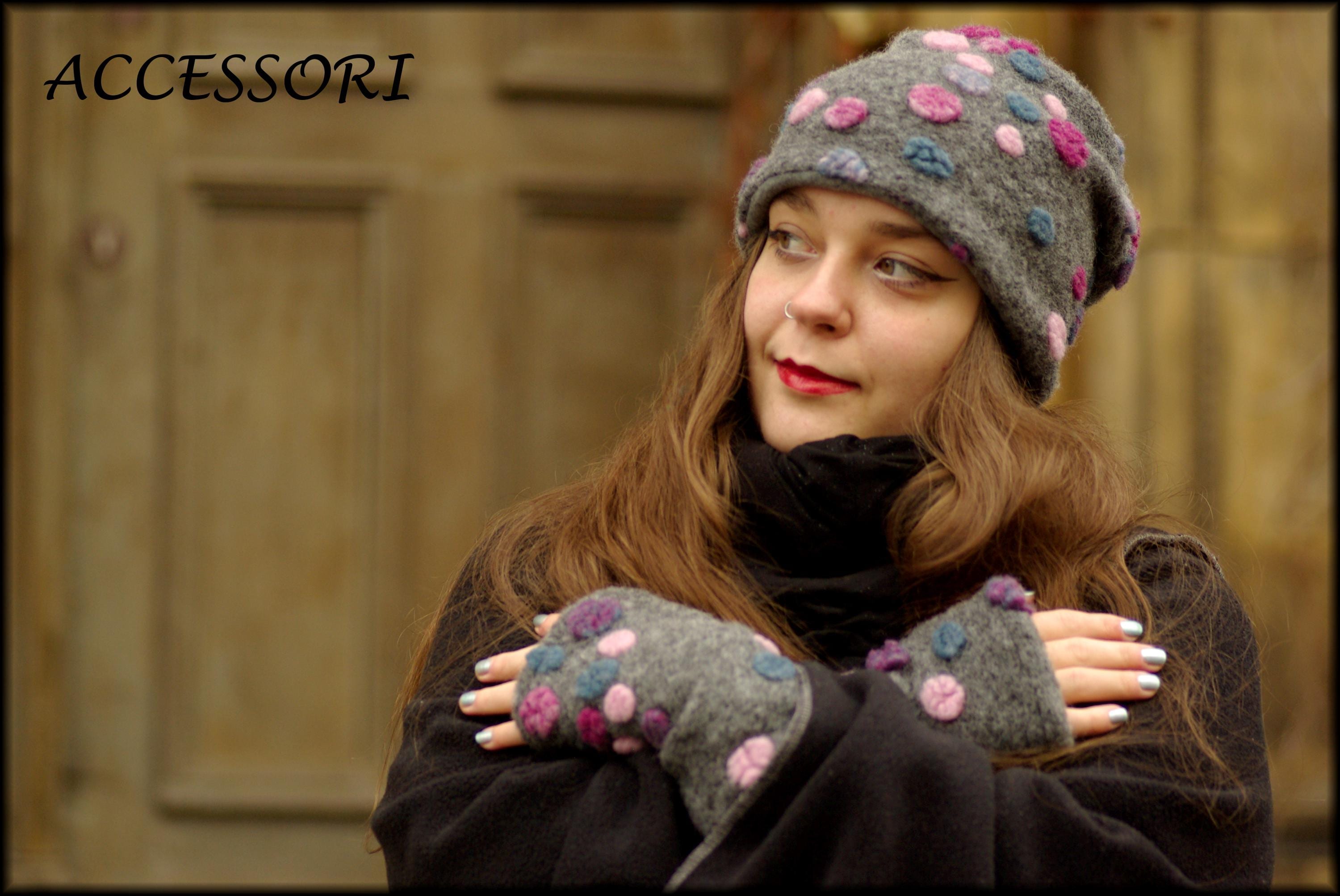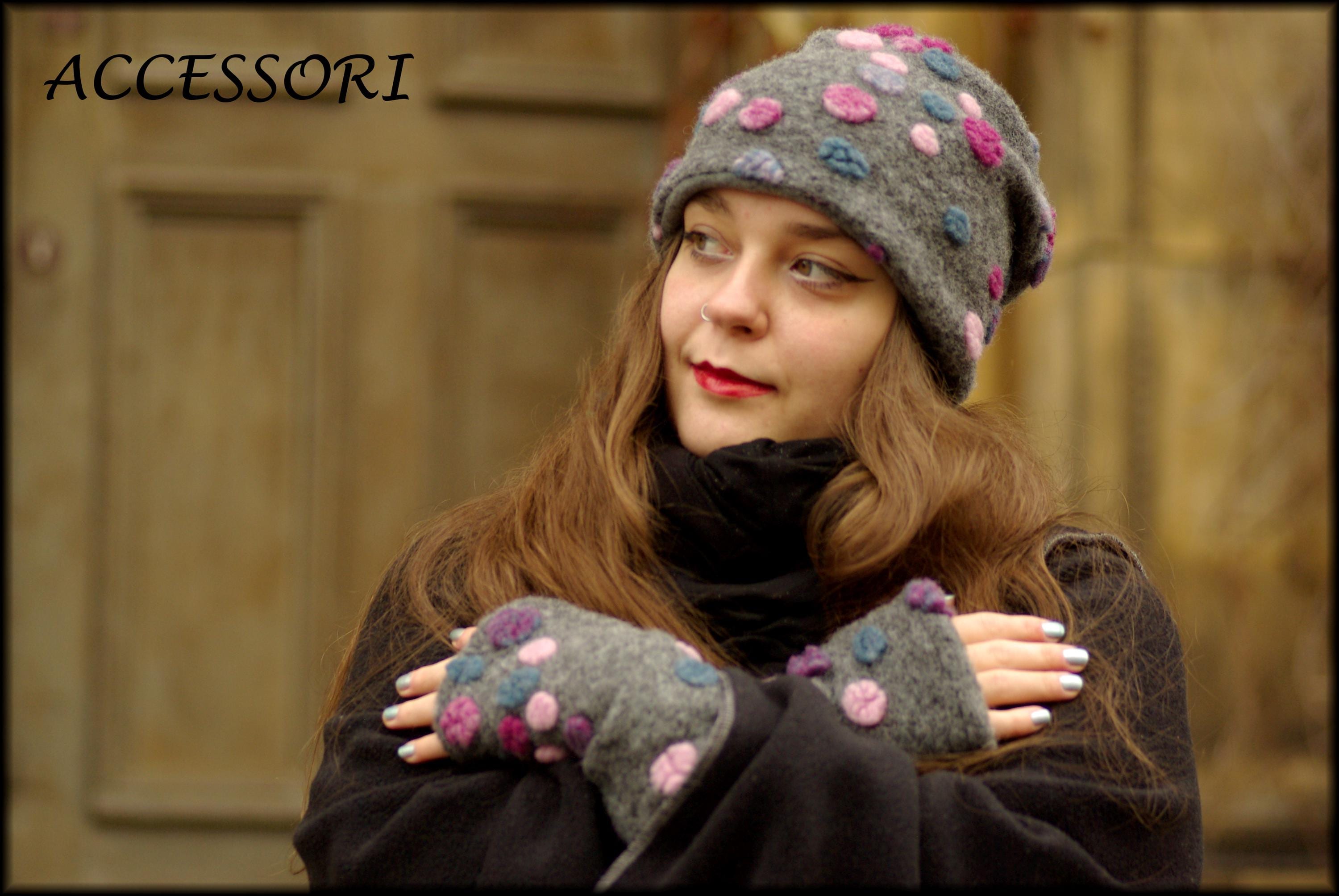 Wool hand warmers, beanie, light grey, purple, pink, fuchsia, polka dot, warmly lined with fleece, cozy