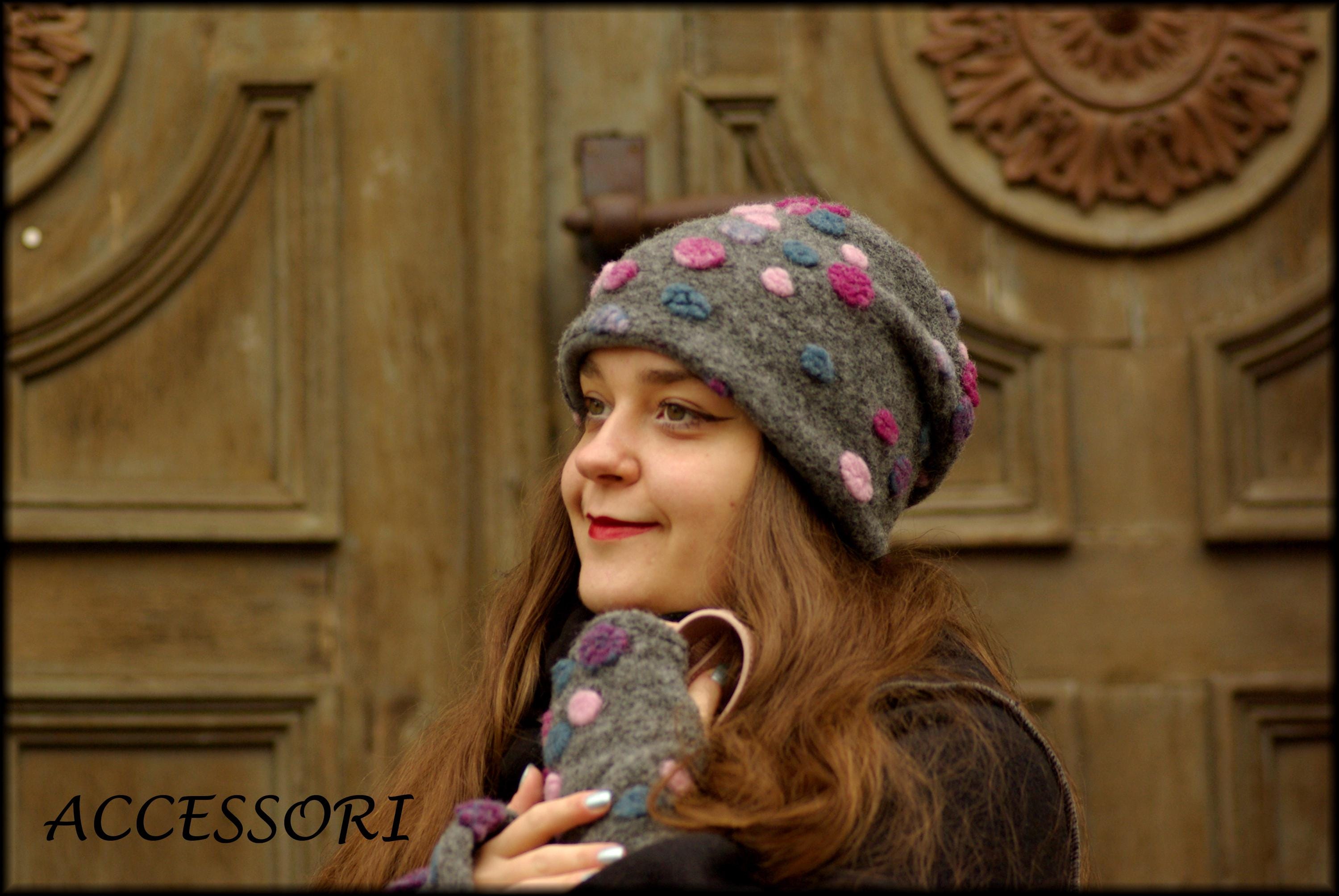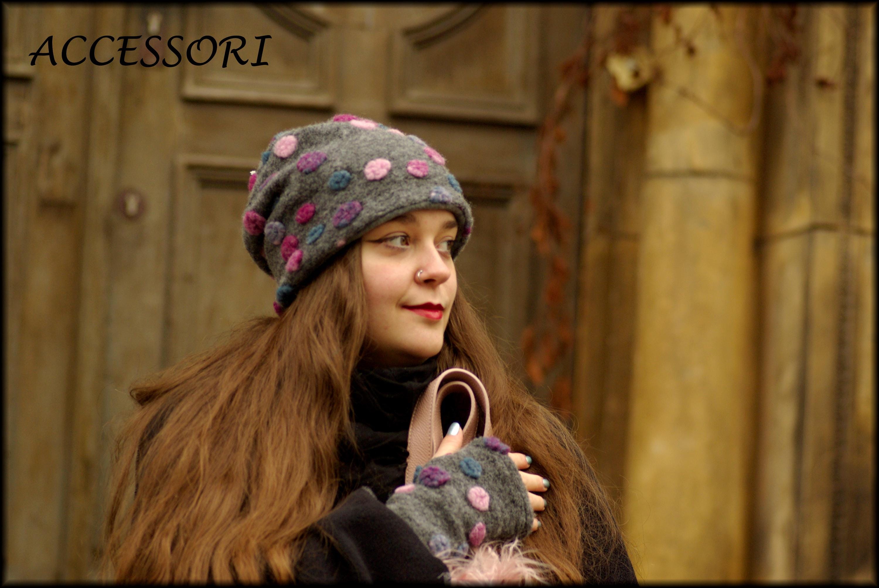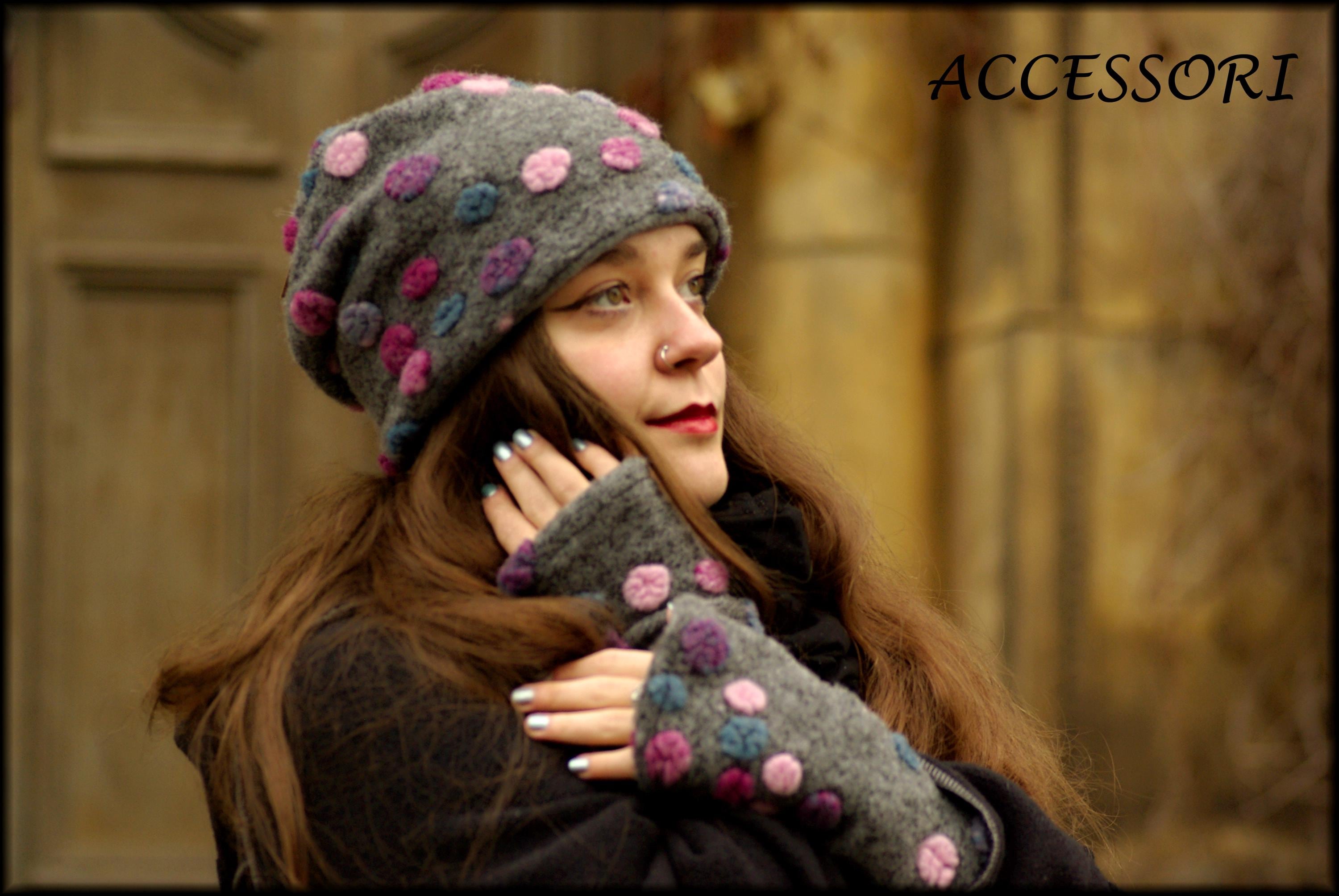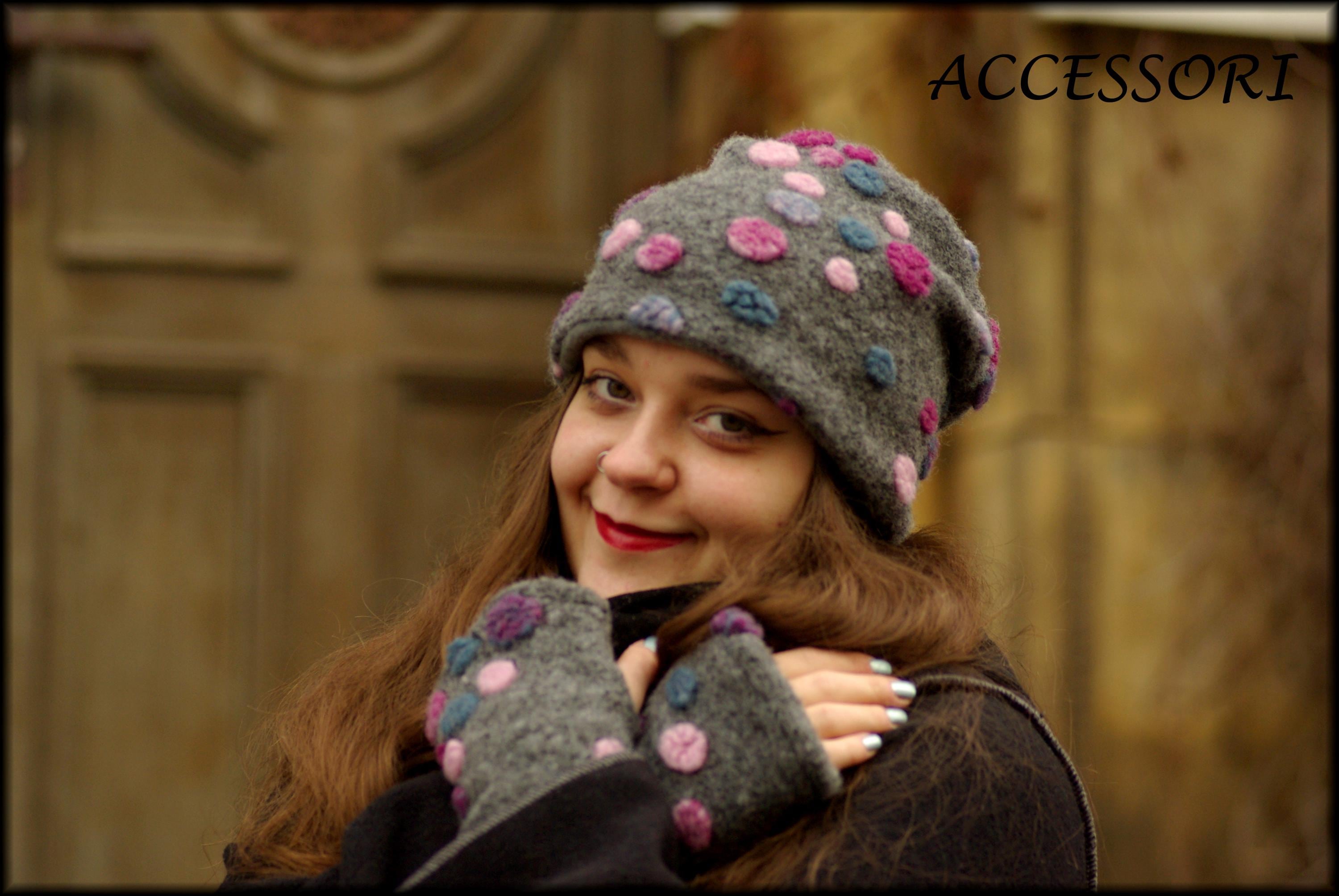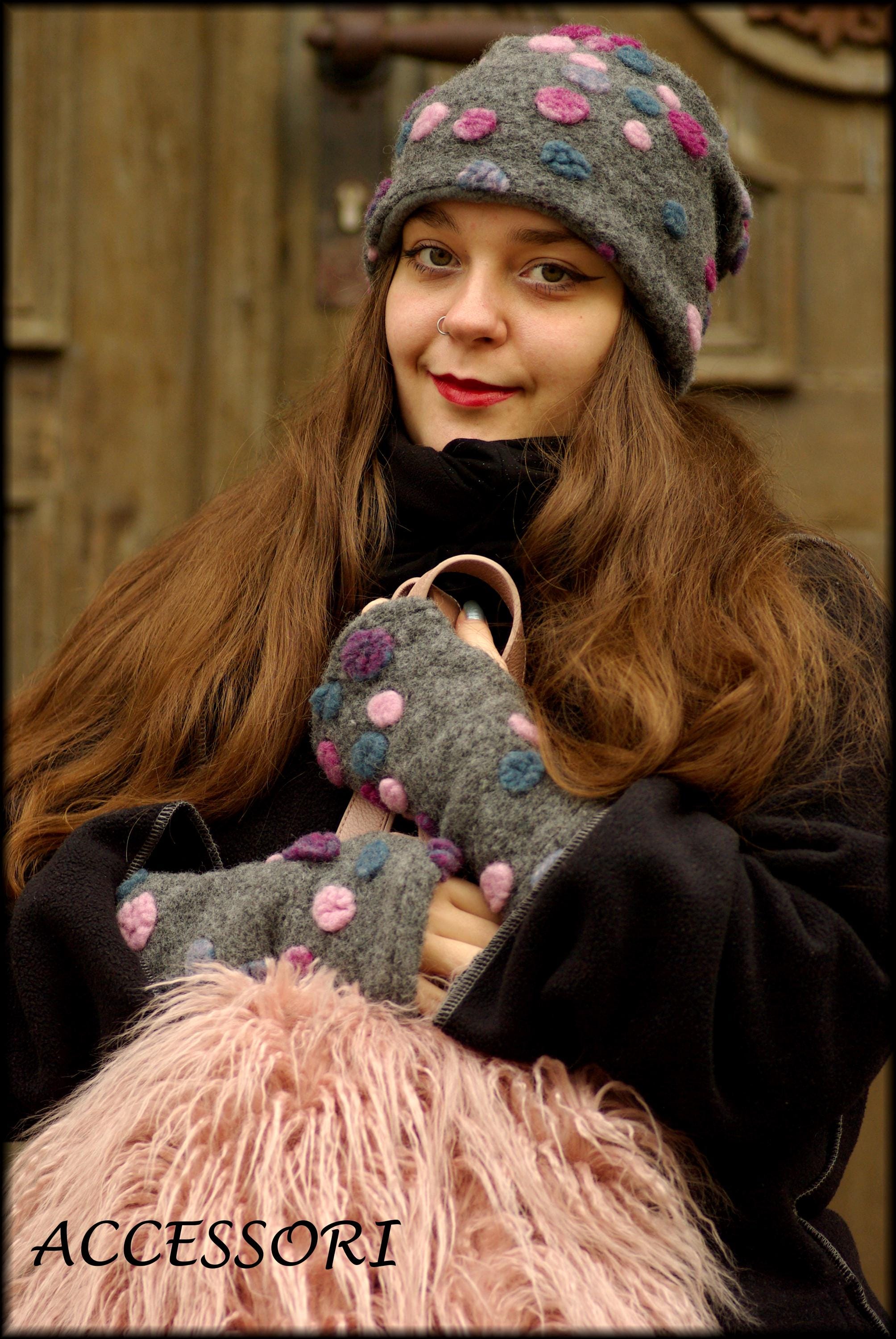 Wool hand warmers, beanie, light grey, purple, pink, fuchsia, polka dot, warmly lined with fleece, cozy
