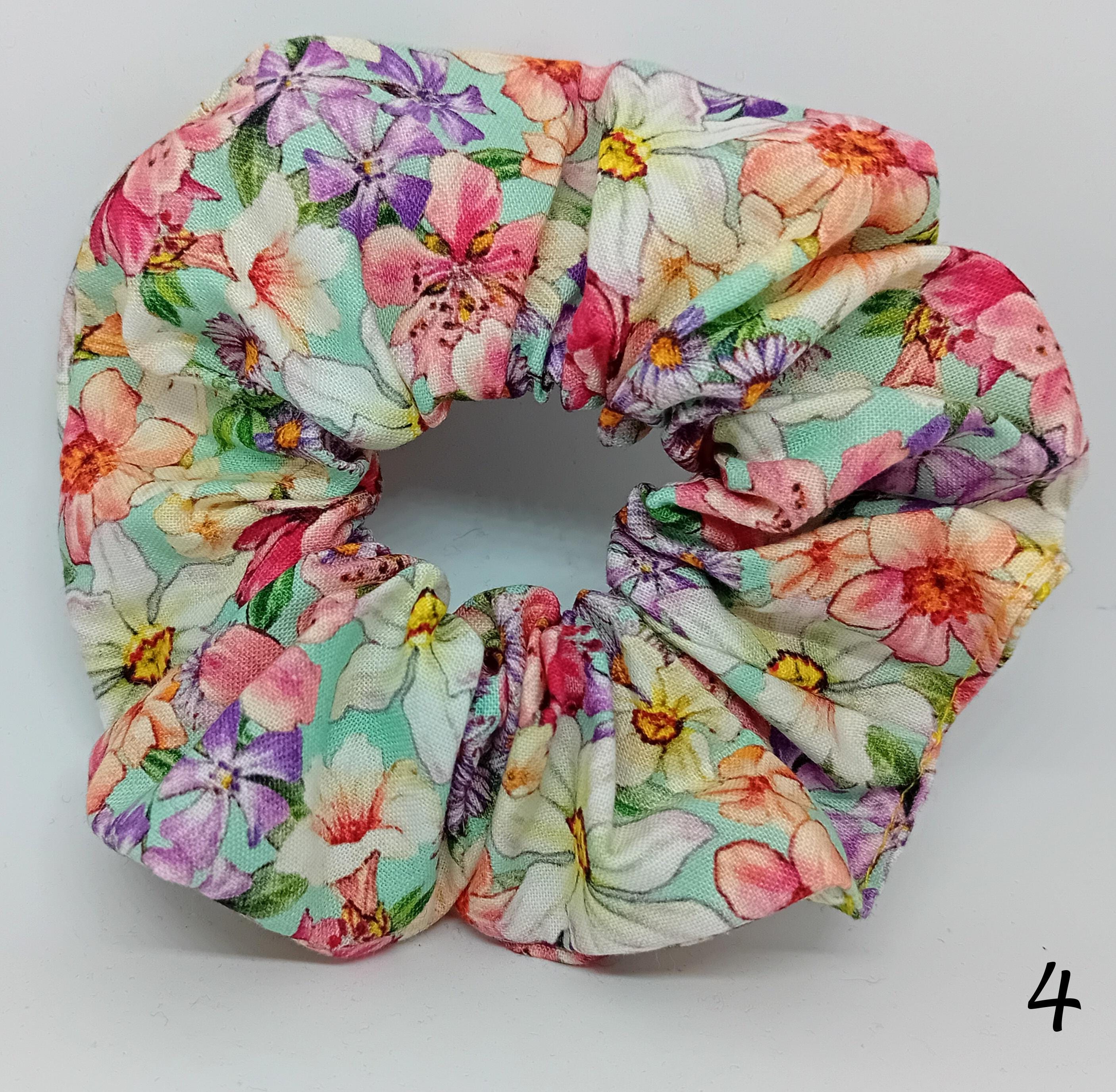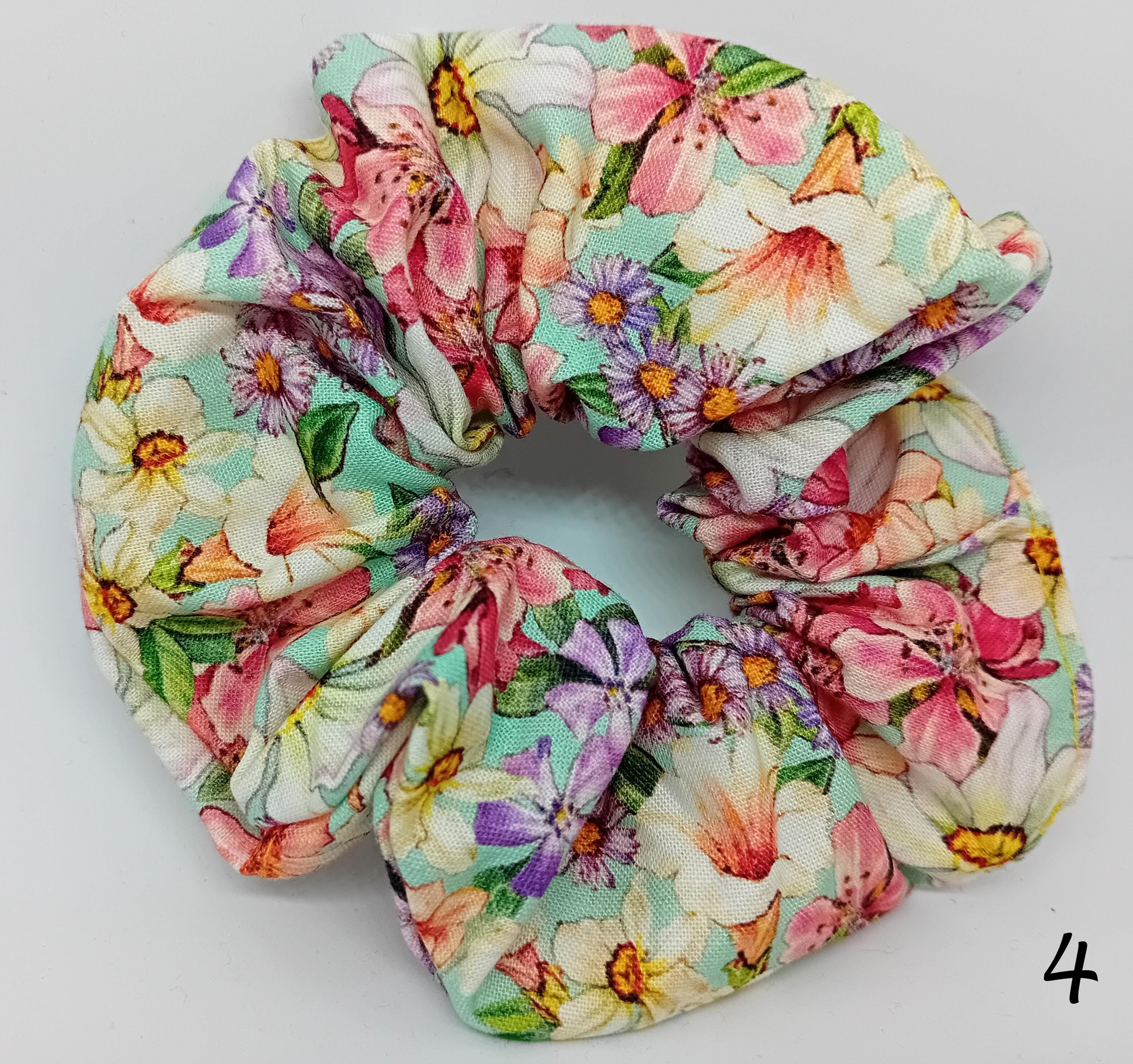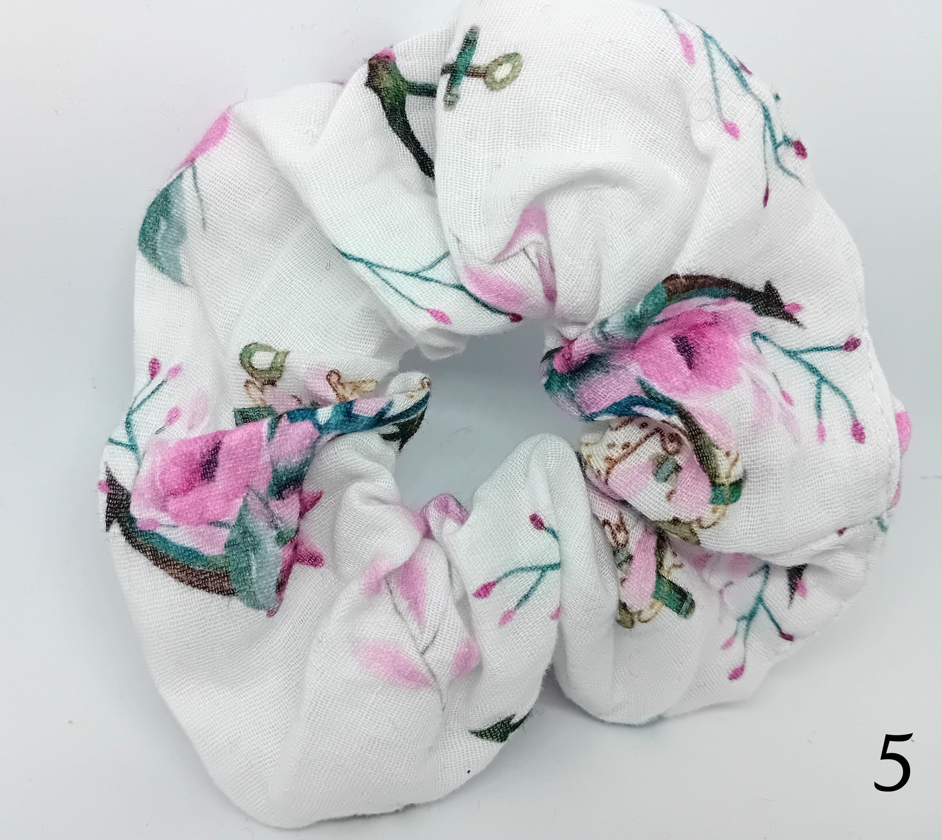 These scrunchies are sewn from various beautiful cotton fabrics.