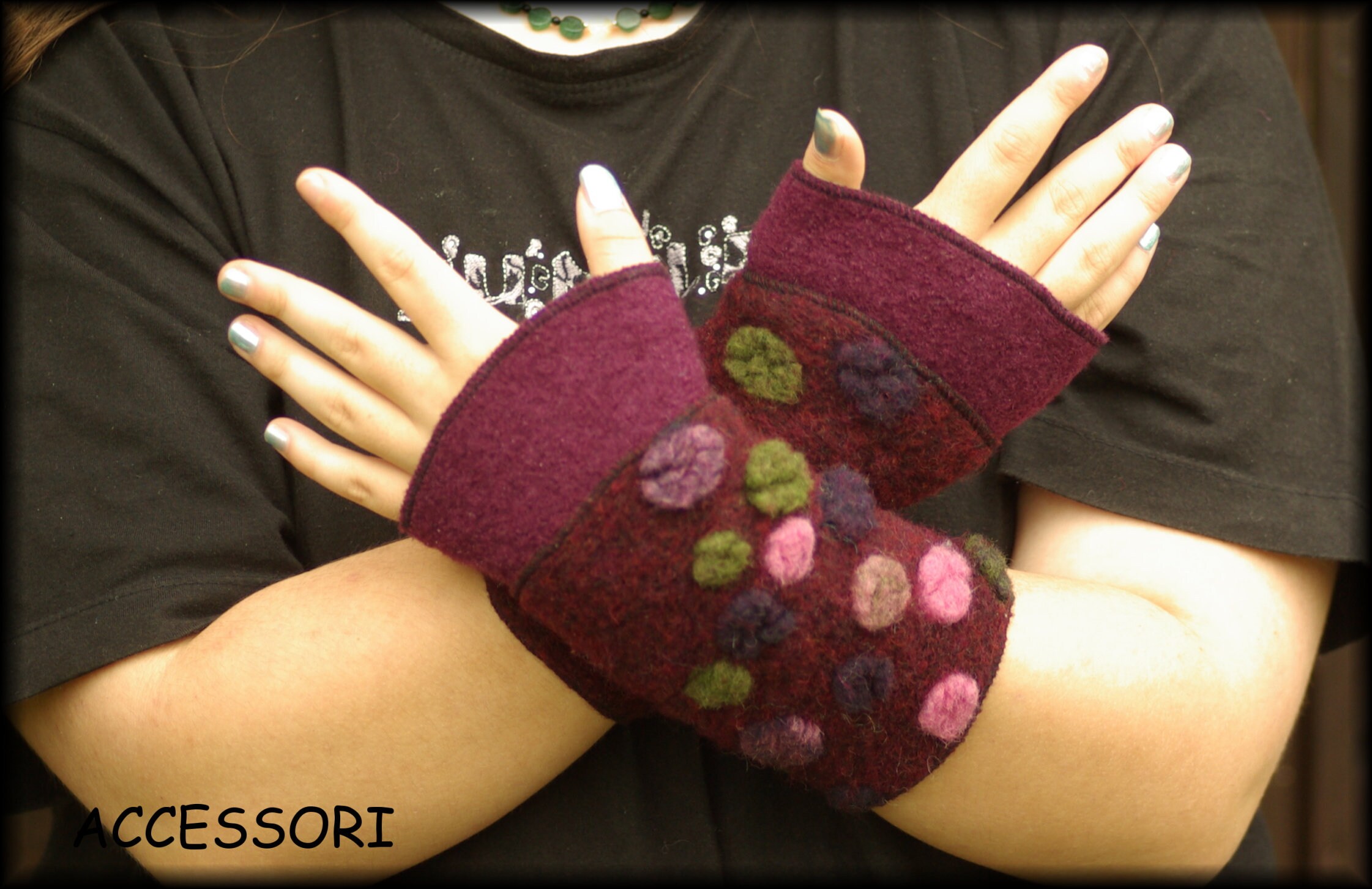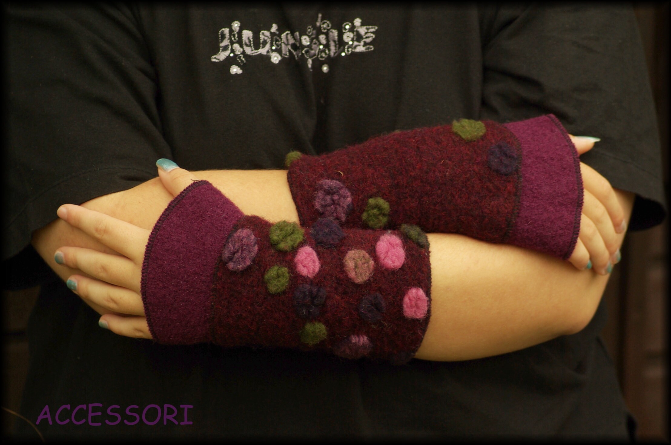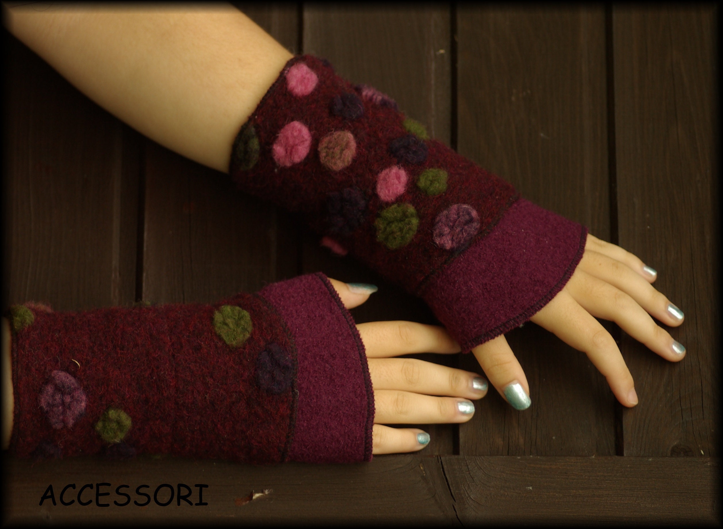 Wool arm warmers, length 20 cm, material: the monochrome fabric - 100% wool, the patterned fabric - 80% wool, 20% cotton