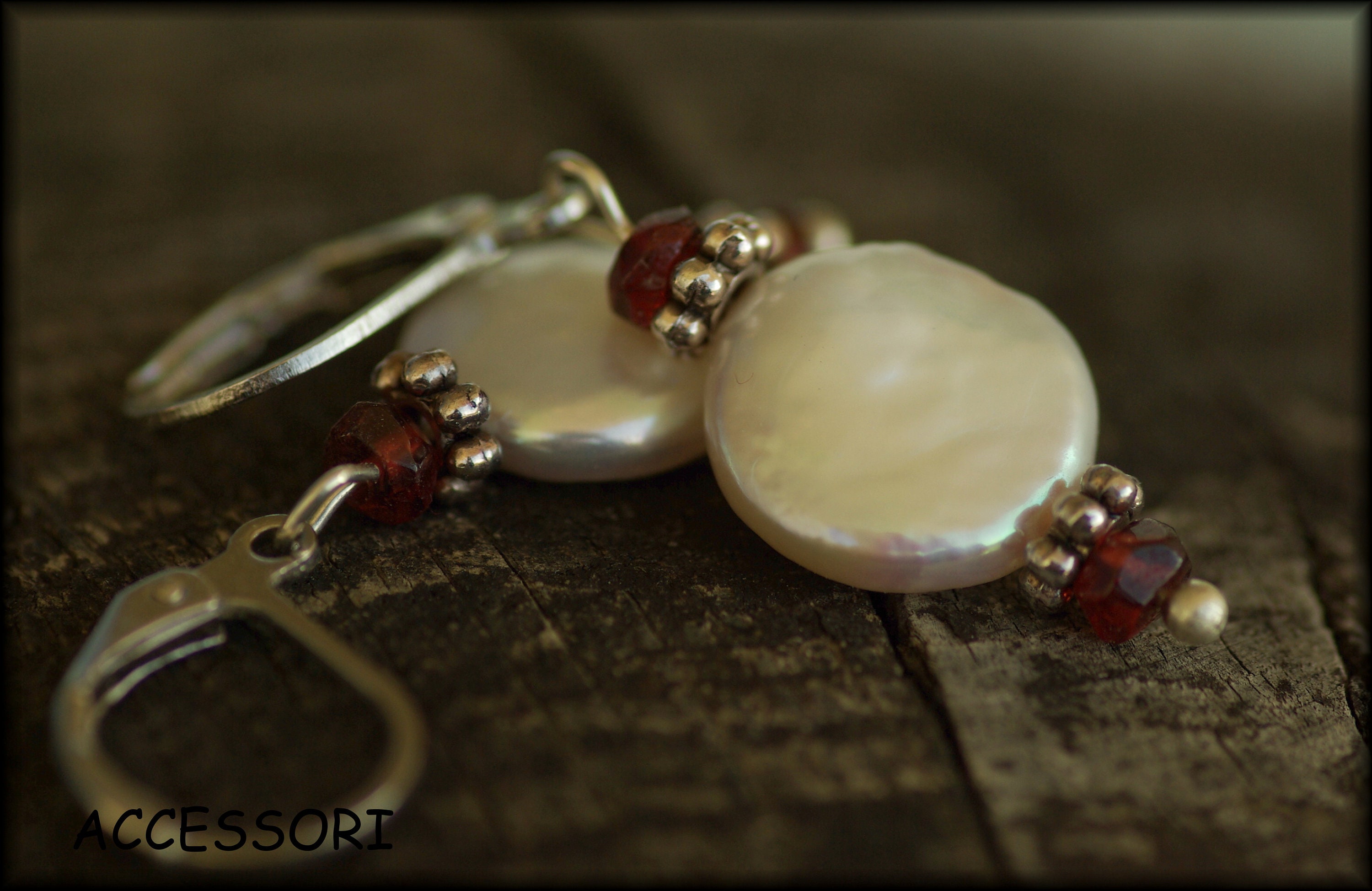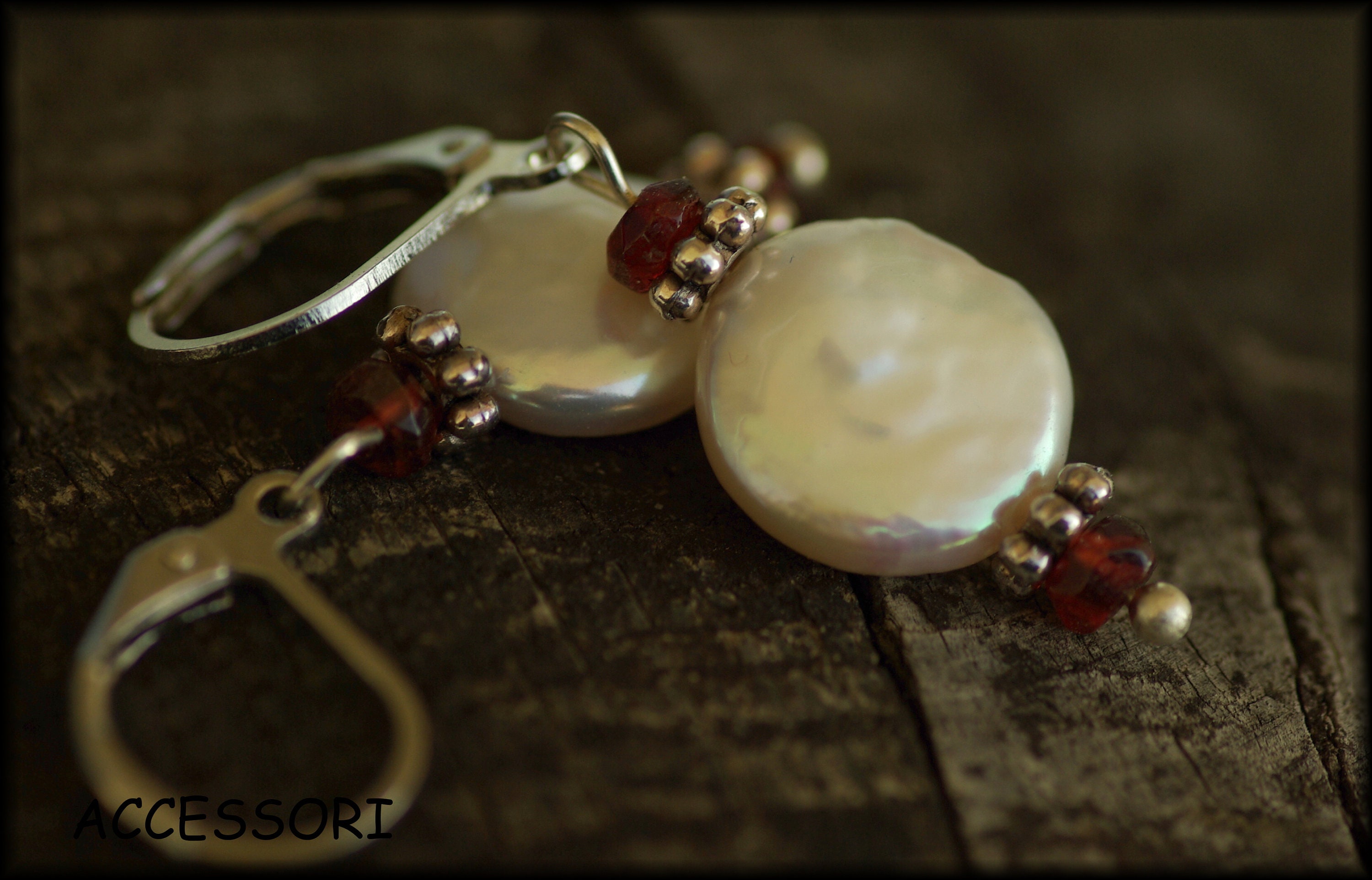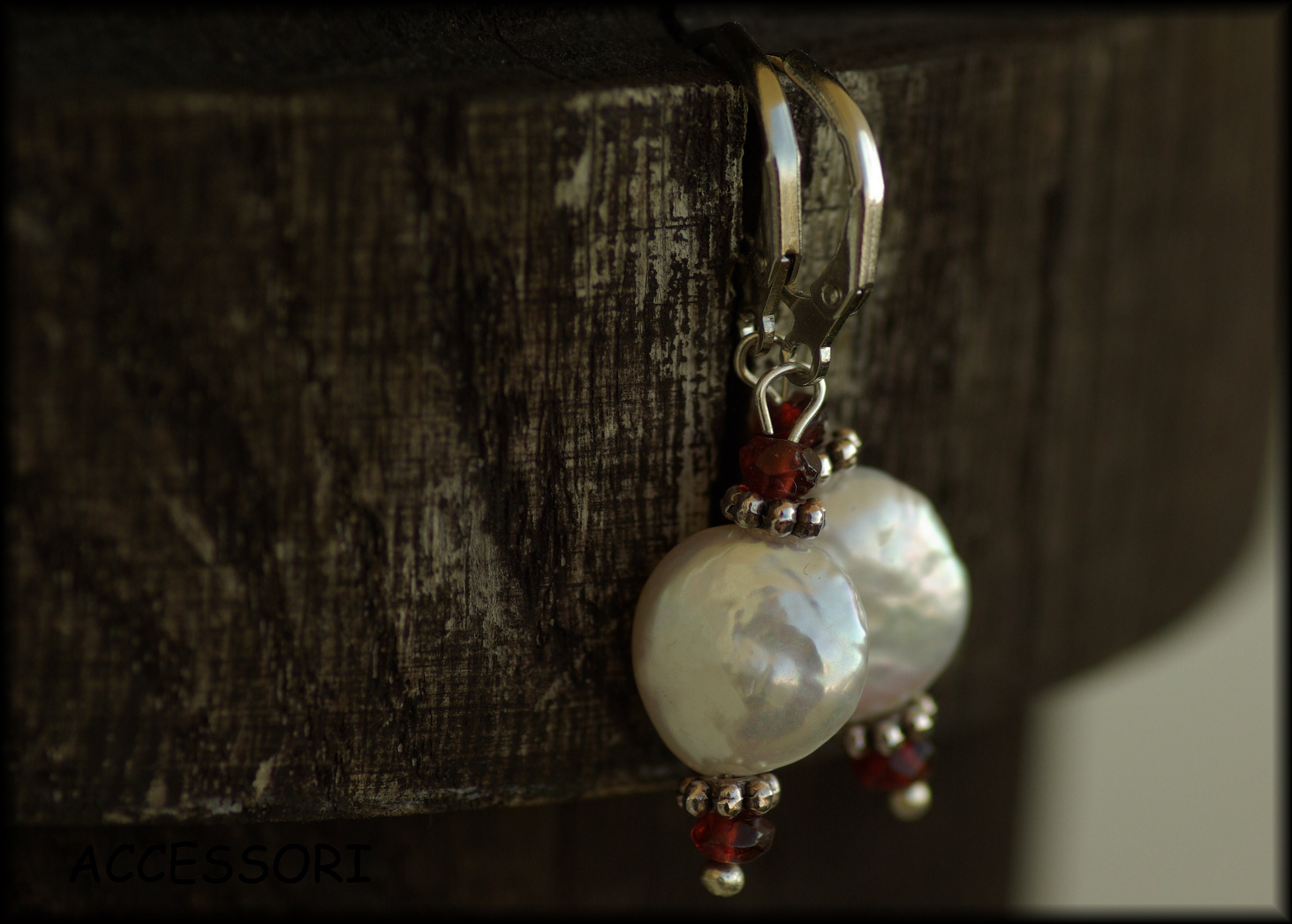 Beautiful earrings with dazzling freshwater pearls and garnet, length 2 cm, nickel-free