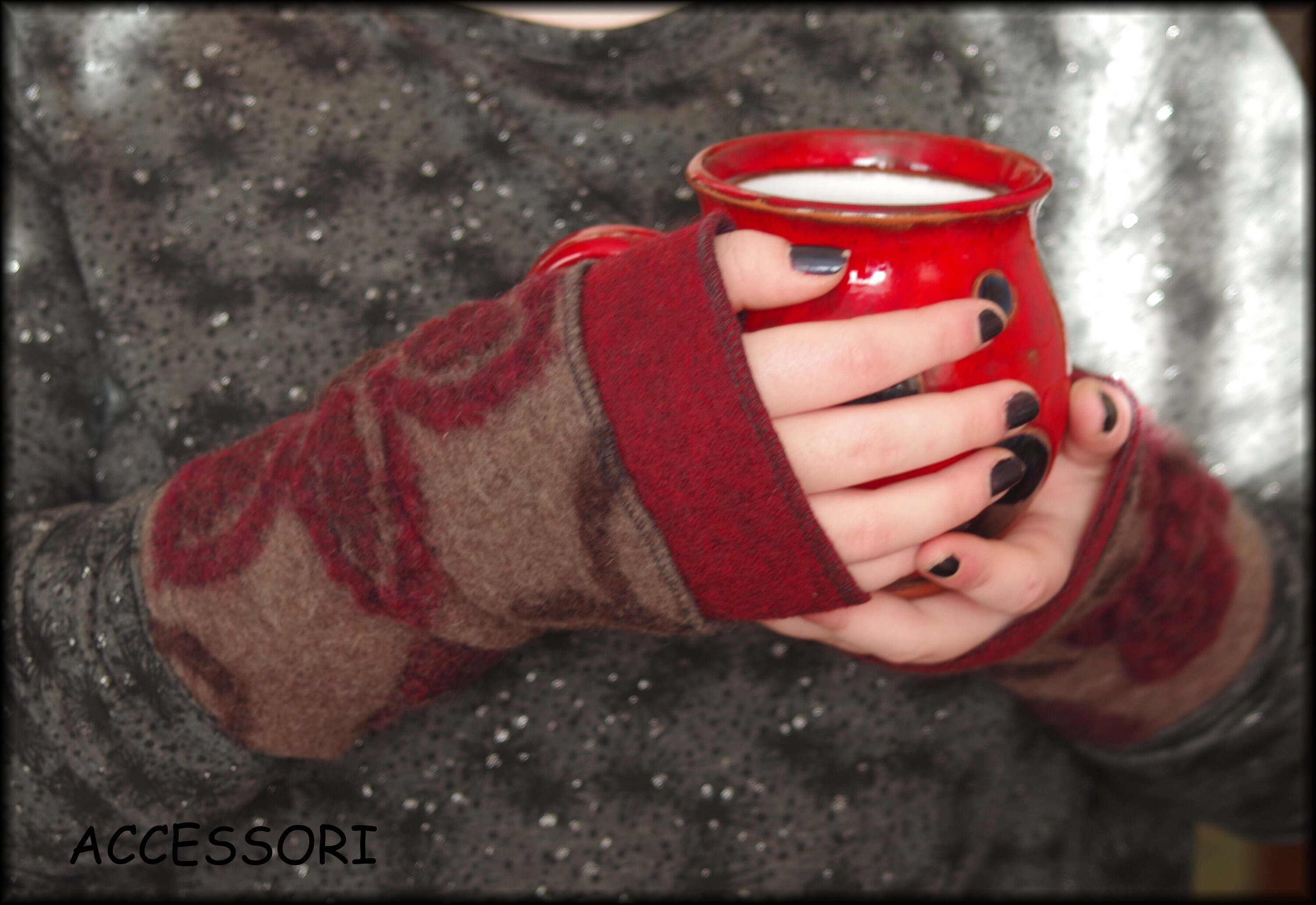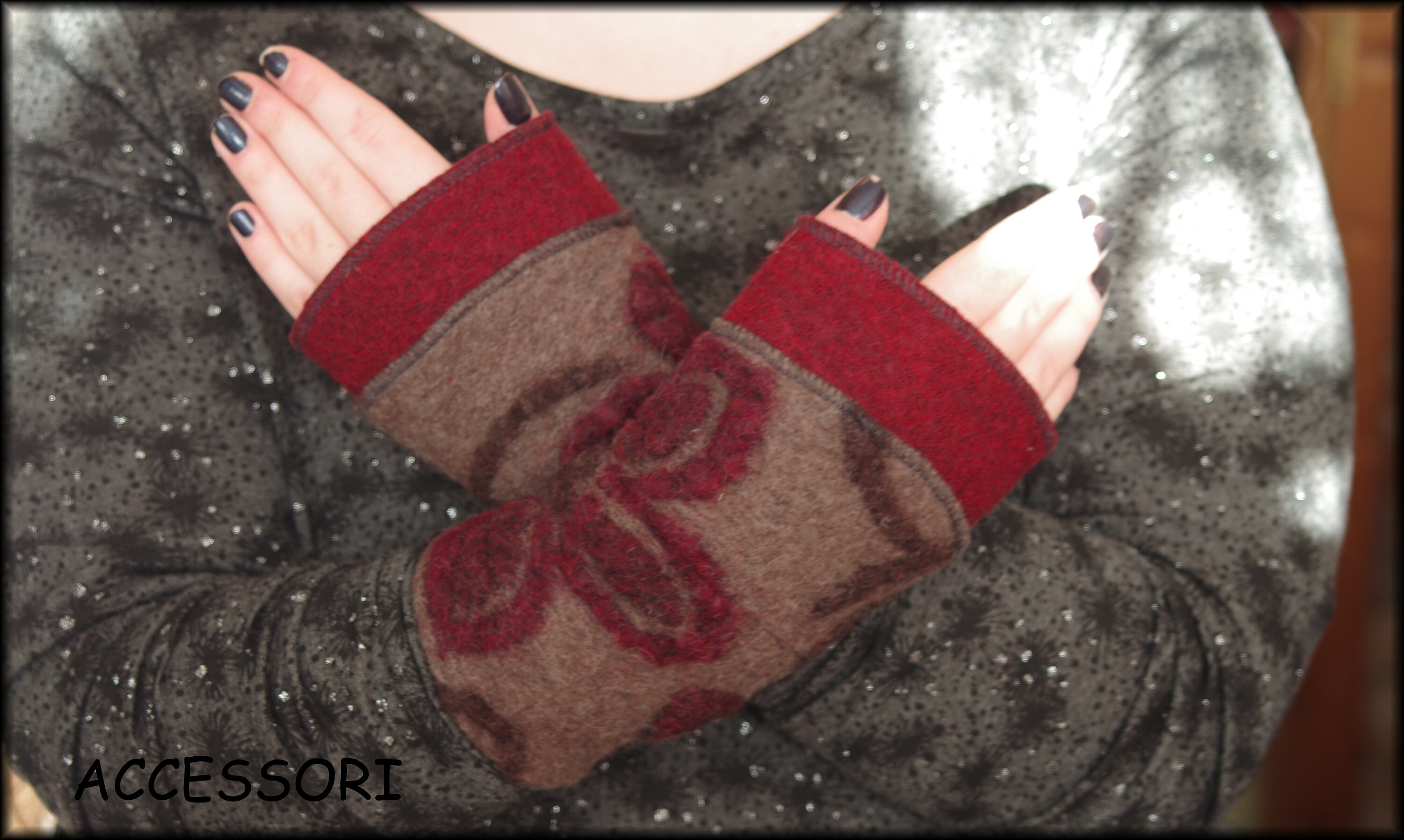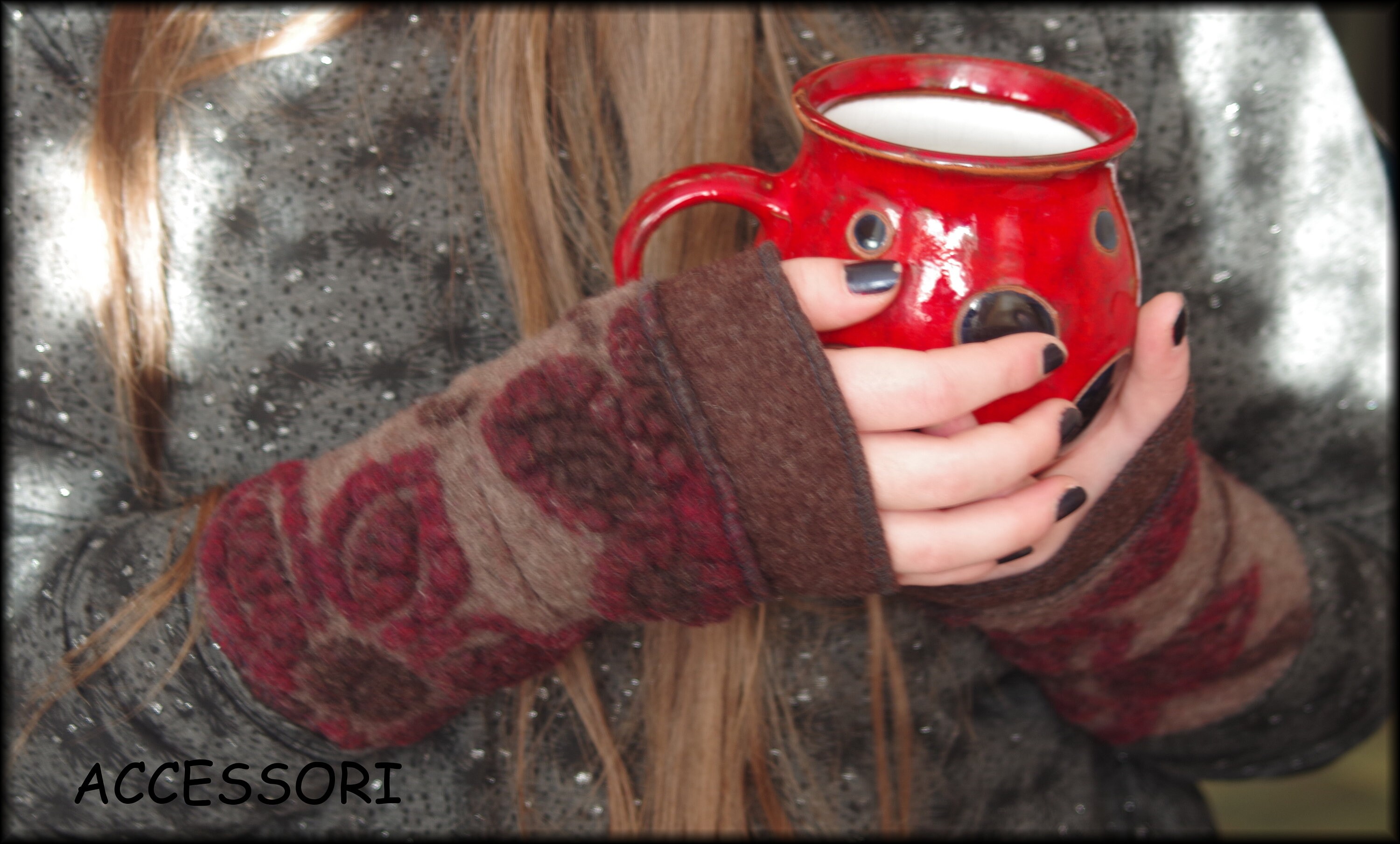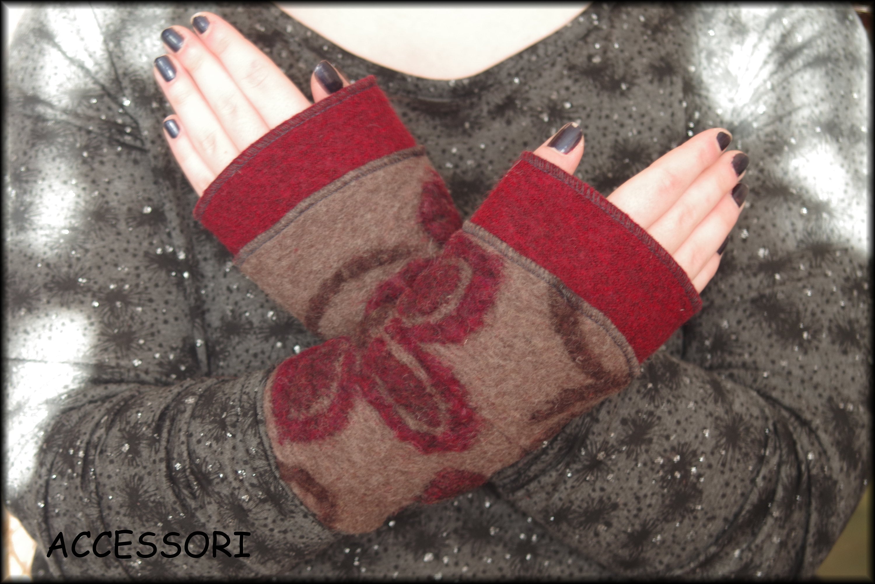 soft, warm arm warmers made of wool (only with red border), length 20 cm, material: the plain fabric - 100% wool, the patterned fabric - 80% wool, 20% cotton