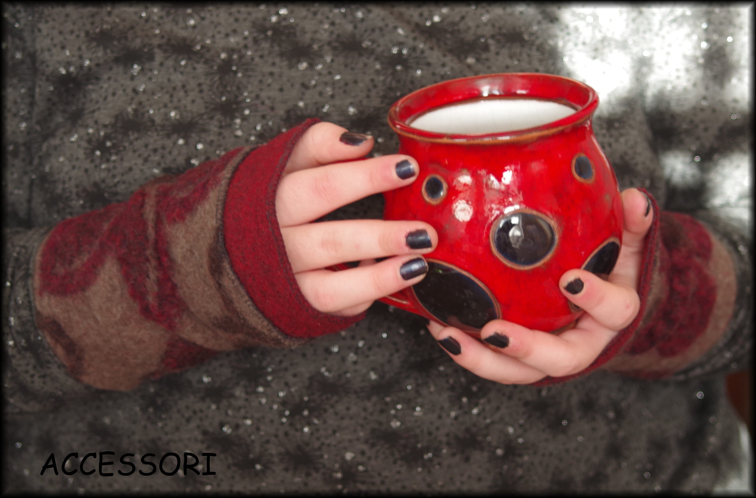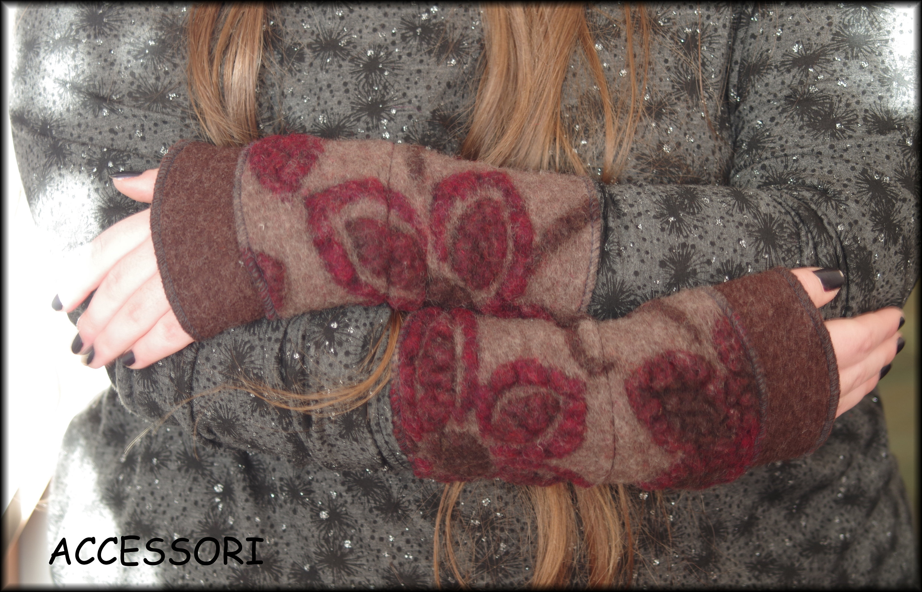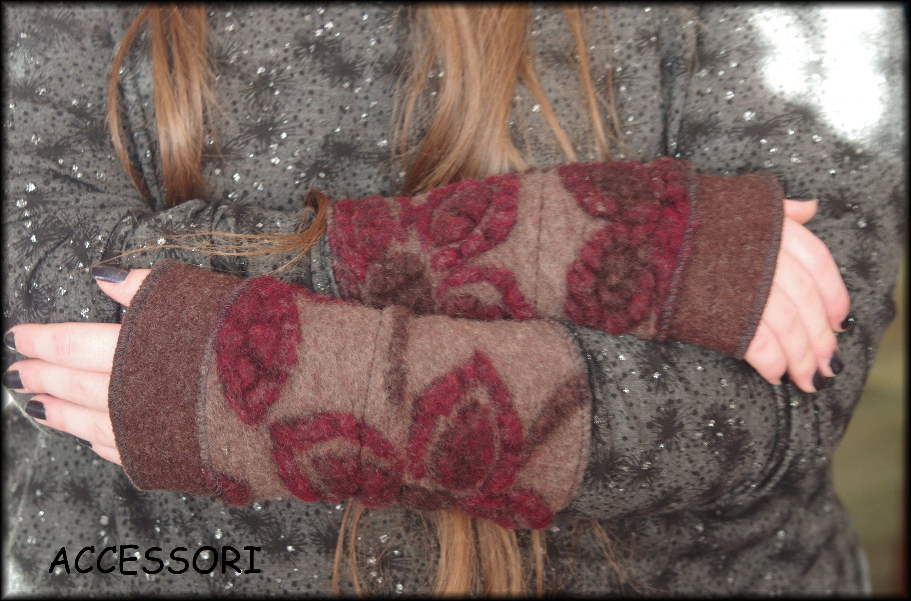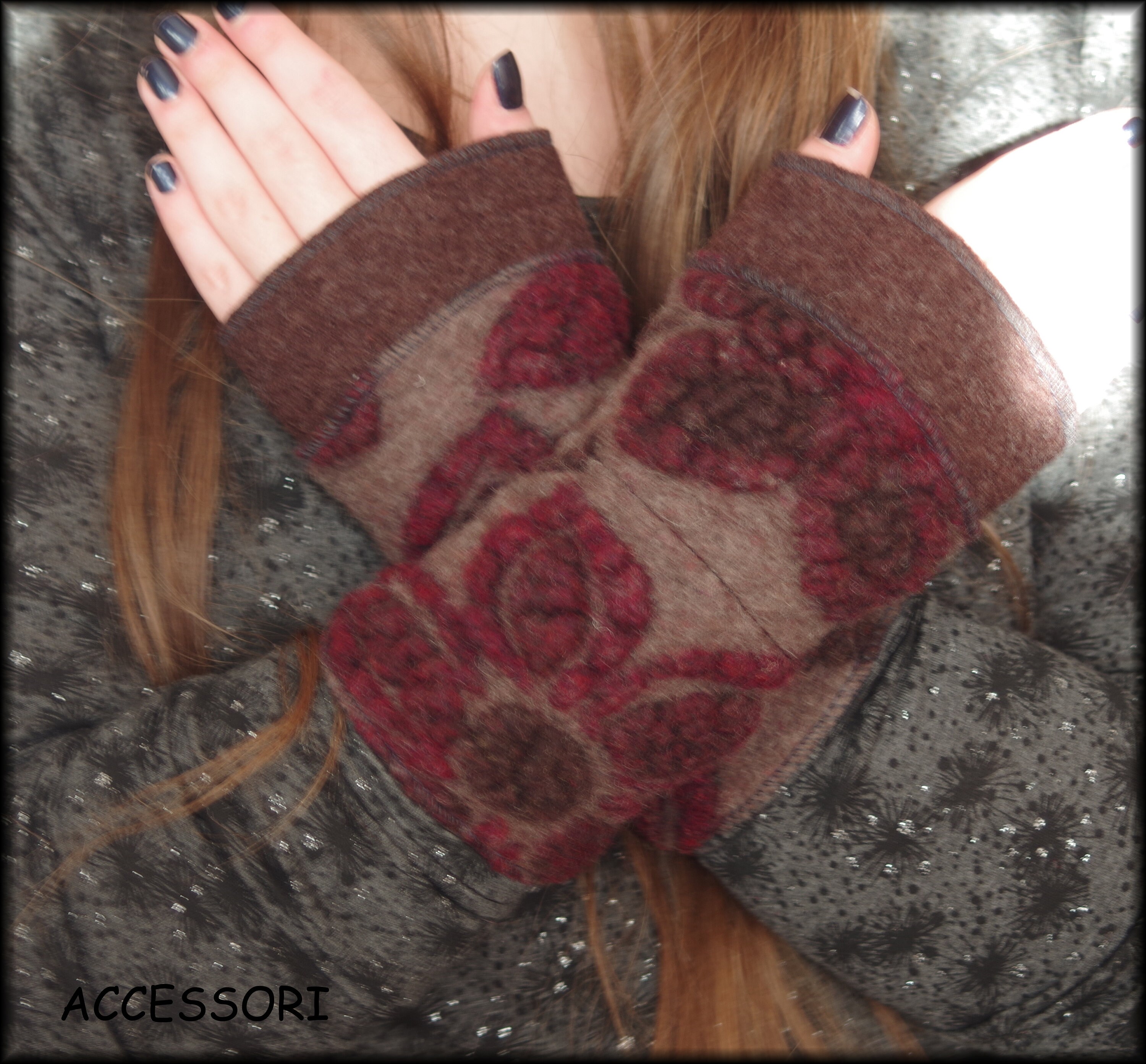 soft, warm arm warmers made of wool (only with red border), length 20 cm, material: the plain fabric - 100% wool, the patterned fabric - 80% wool, 20% cotton