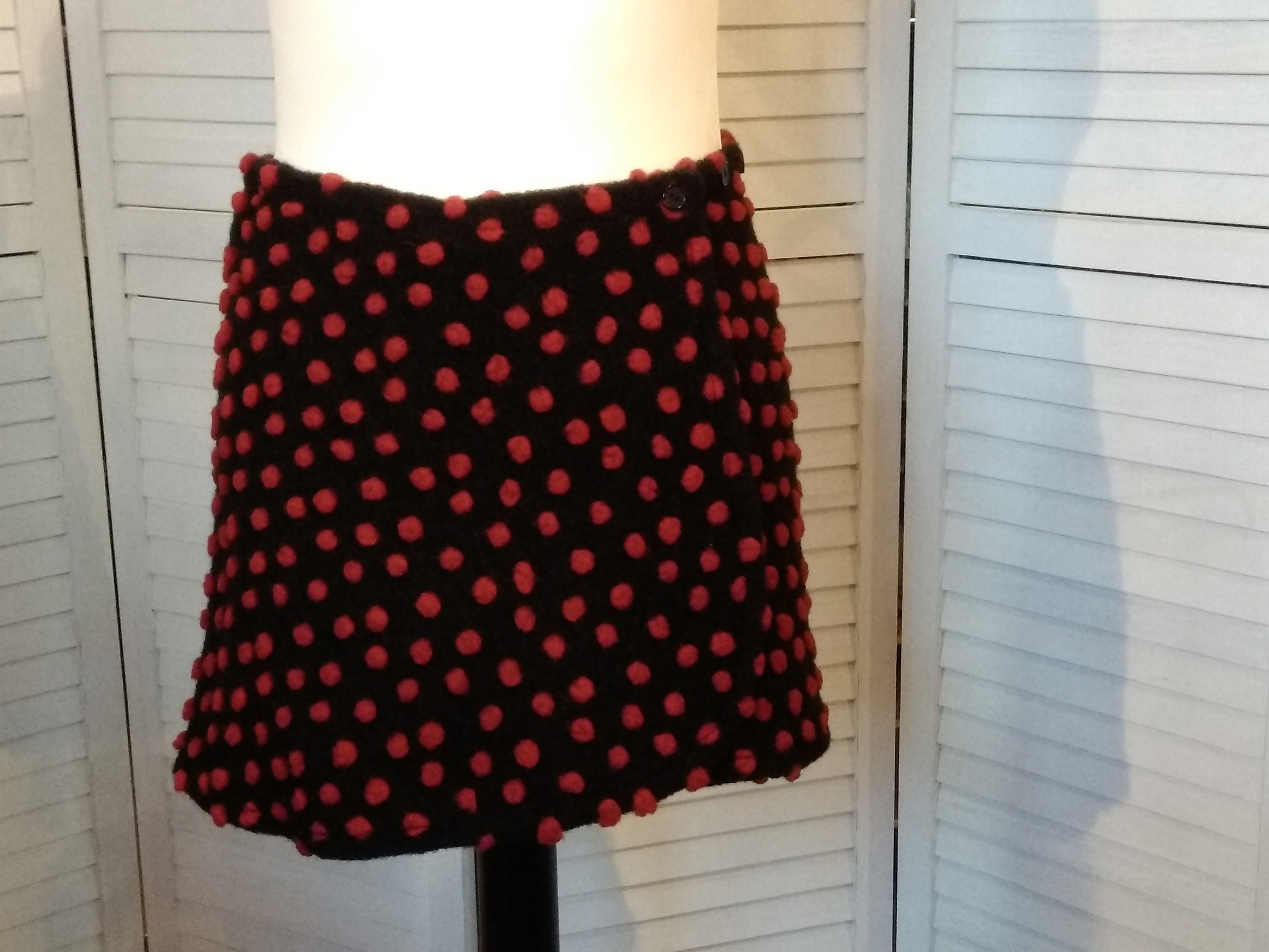 This wrap skirt is sewn from a high-quality black wool fabric (80% wool, 20% cotton), polka dots. Rubber is sewn in at the back.